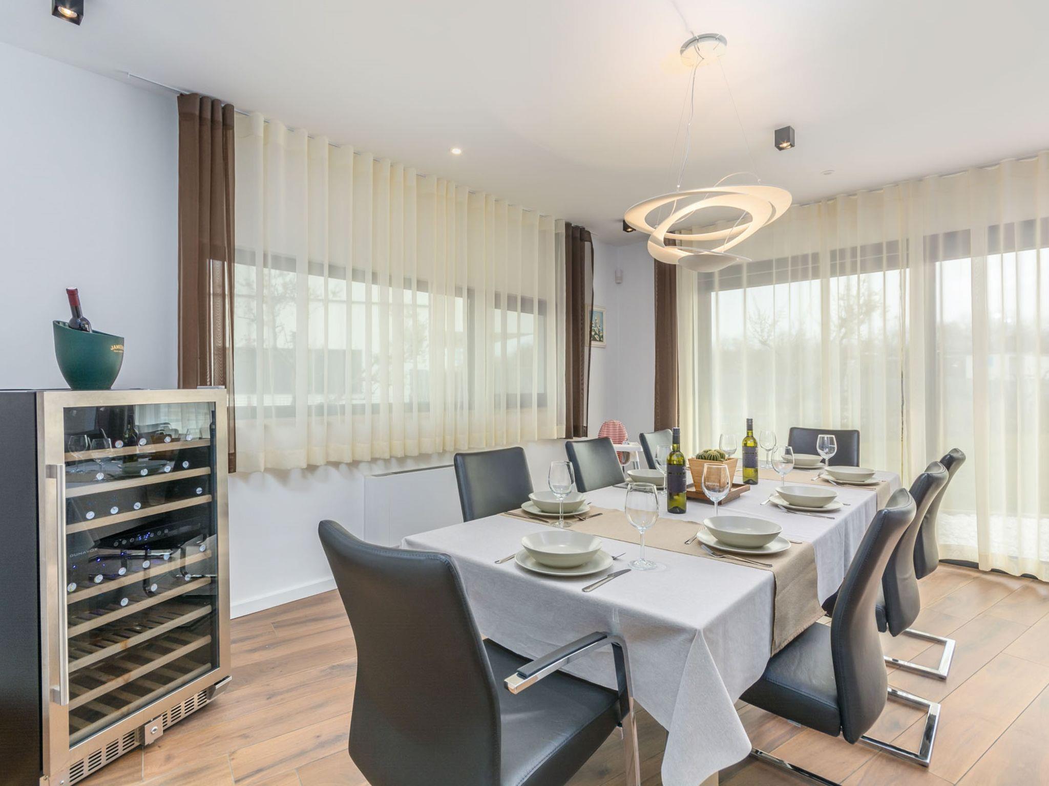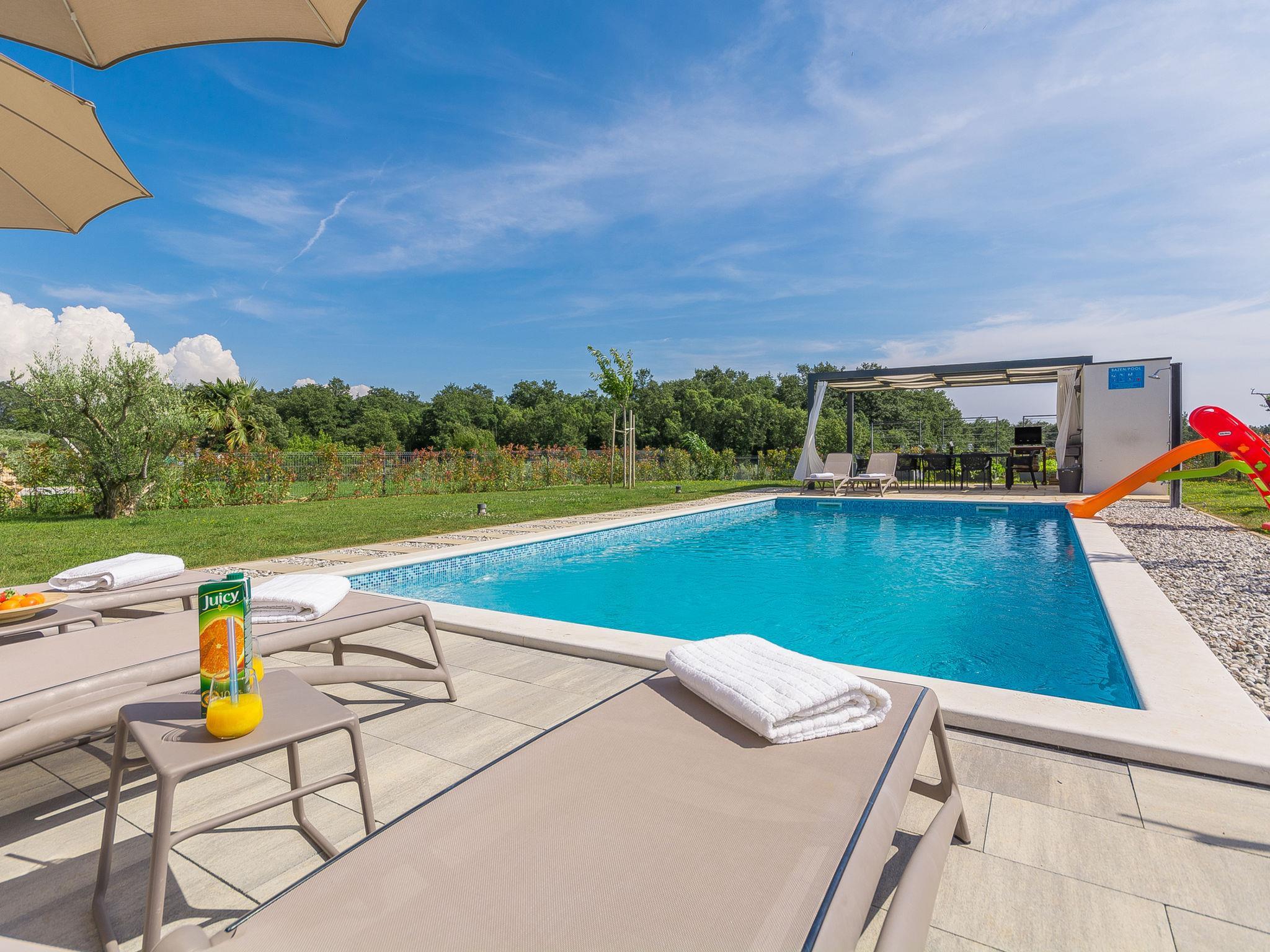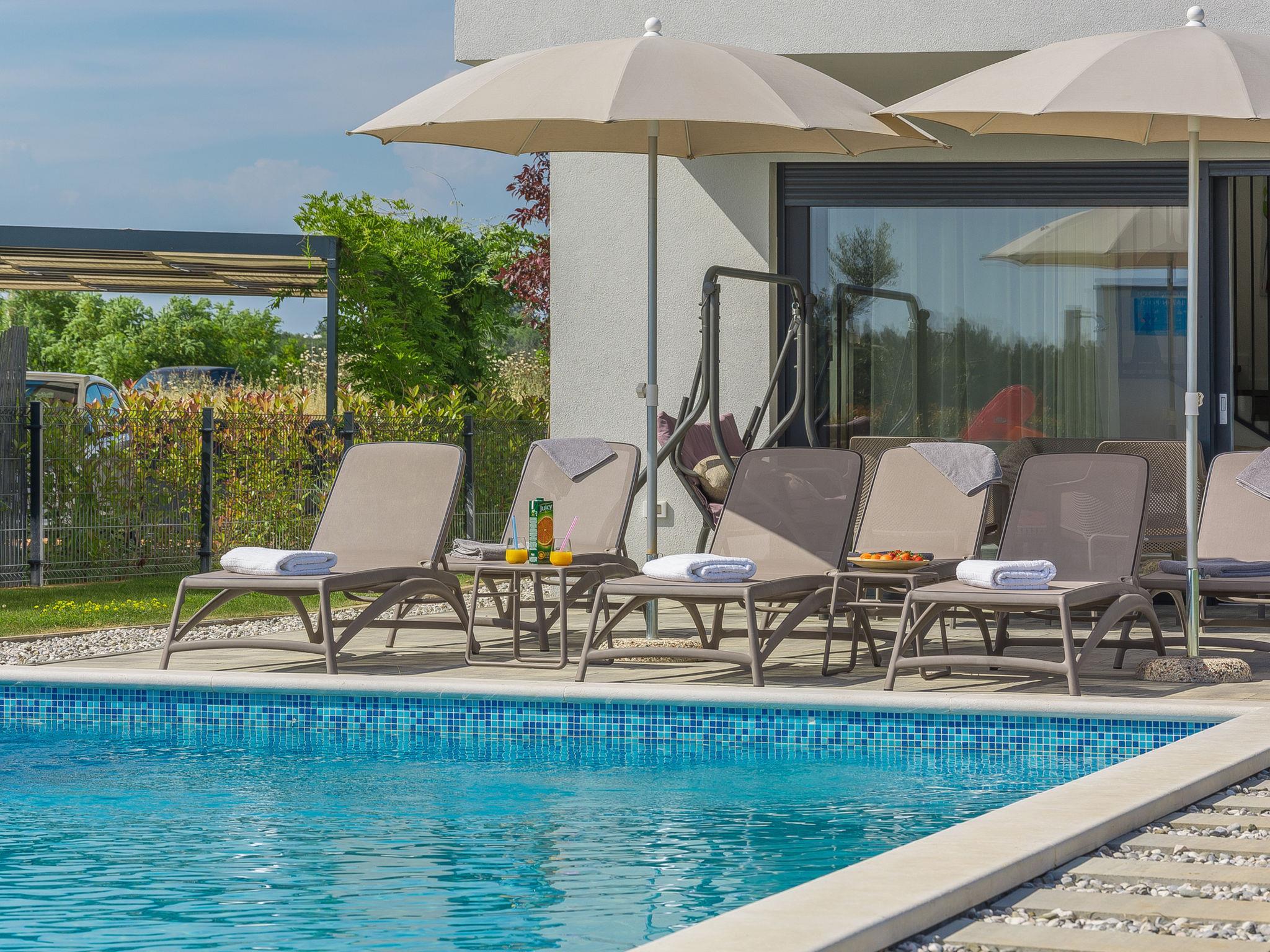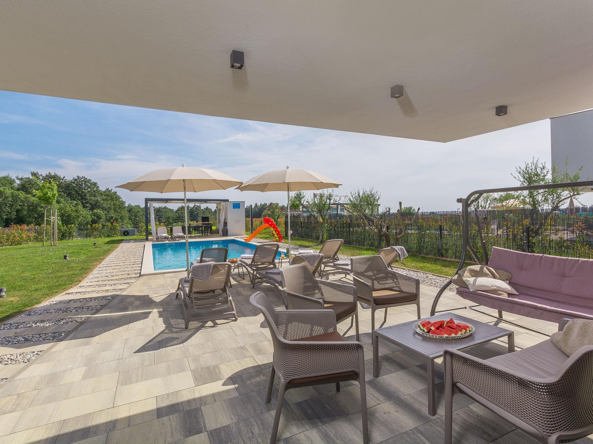Modern villa "Paolo", 2 storeys. In the hamlet Stancija Vinjeri 2 km from the centre of Novigrad, in a sunny position, 3 km from the sea, 3 km from the beach. Private: property 1'100 m2 (fenced), garden with lawn, swimming pool angular, heated (9 x 5 m, depth 140 cm, seasonal availability: 01.Jan. - 31.Dec.) with internal staircase. Outdoor shower, hot tub, arbour (20 m2), terrace, garden furniture. In the house: internet access, sauna, table football, trampoline, washing machine, tumble dryer. Parking (for 3 cars) at the house on the premises. Shop 1.5 km, supermarket 1.5 km, restaurant 500 m, bus stop 2 km, pebble beach 3 km, rocky beach 3 km. Tennis 2 km, walking paths from the house 500 m, cycle lane 550 m. Nearby attractions: Aquapark 5 km. Please note: airfield 20 km from the property. Swimming pool heated (extra). It is necessary to announce 7 days in advance if the pool heating is required. Available: garden with organic, seasonal fruit and vegetables (included in the price).