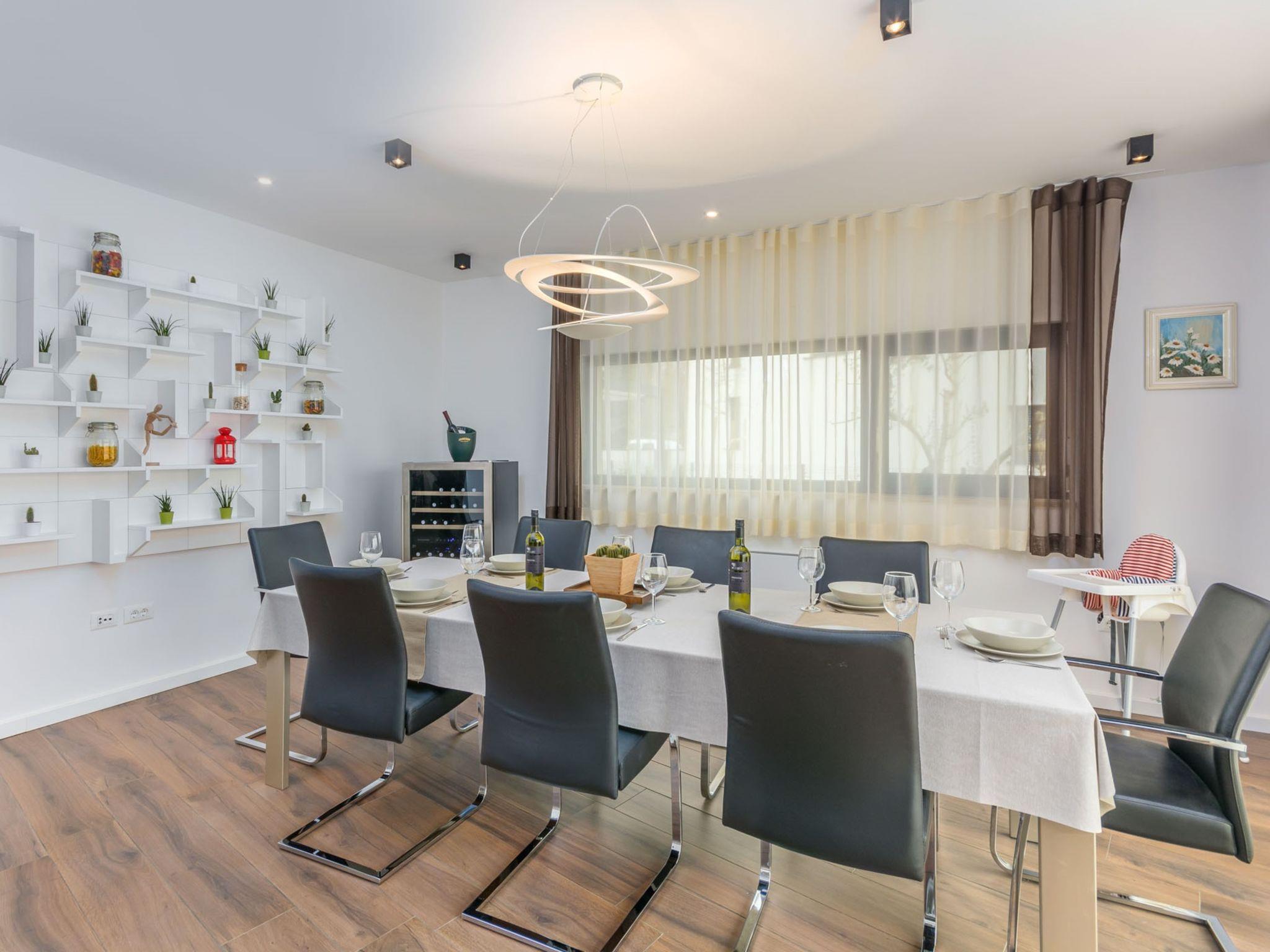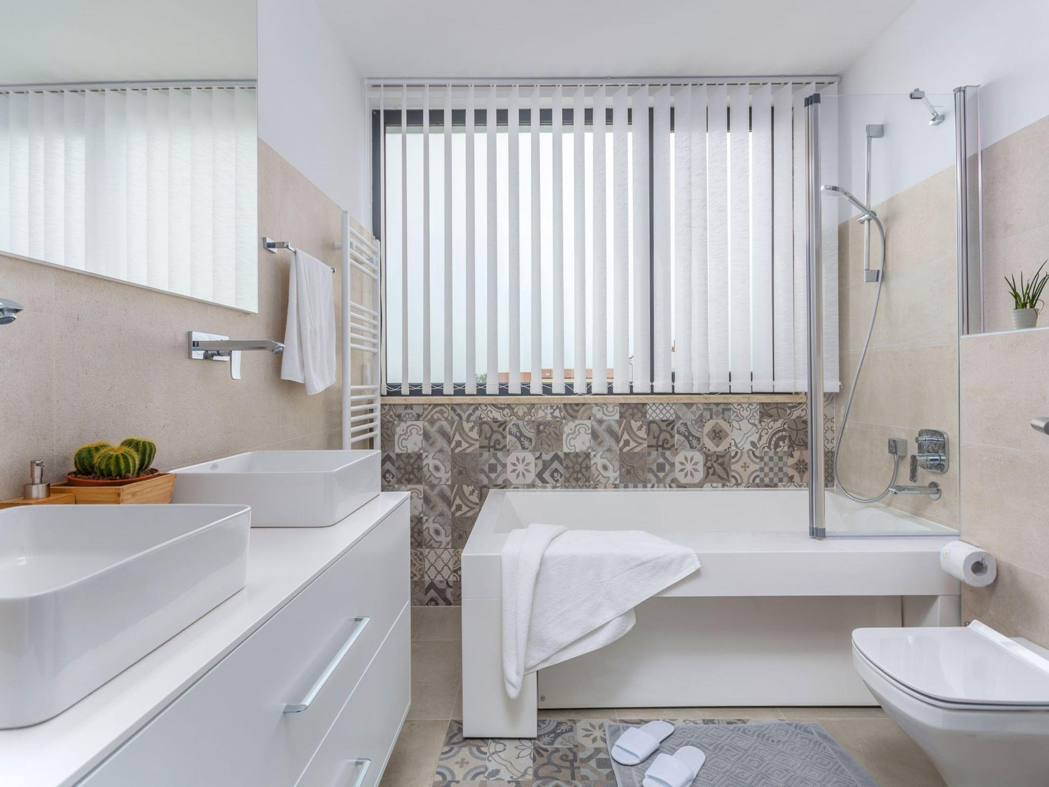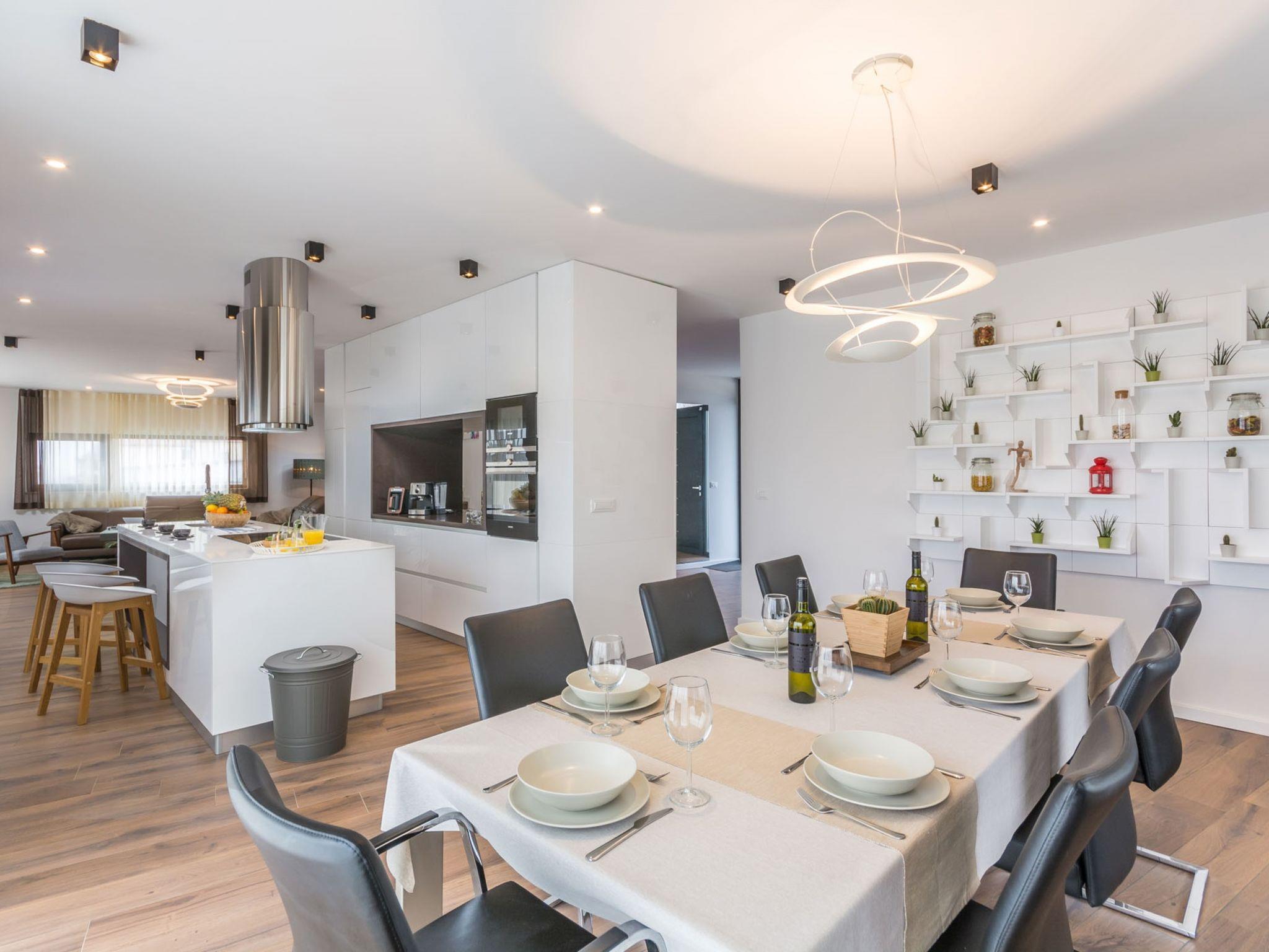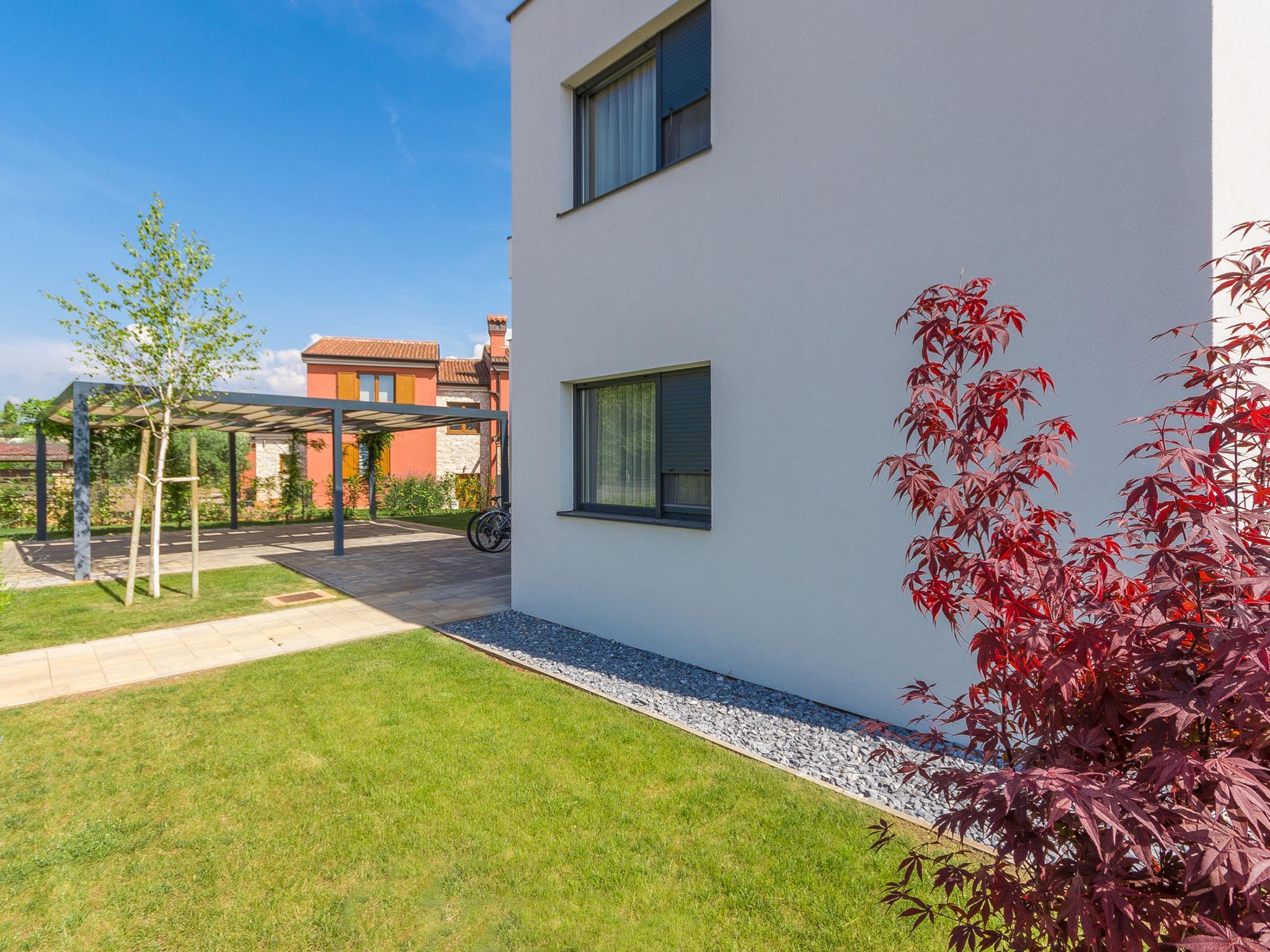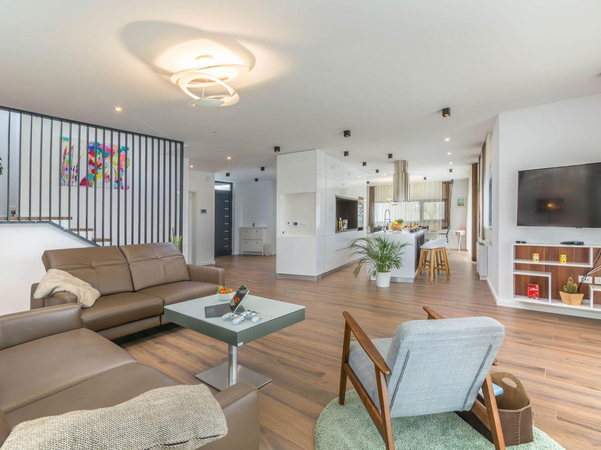 Modern villa "Paolo", 2 storeys. In the hamlet Stancija Vinjeri 2 km from the centre of Novigrad, in a sunny position, 3 km from the sea, 3 km from the beach. Private: property 1'100 m2 (fenced), garden with lawn, swimming pool angular, heated (9 x 5 m, depth 140 cm, seasonal availability: 01.Jan. - 31.Dec.) with internal staircase. Outdoor shower, hot tub, arbour (20 m2), terrace, garden furniture. In the house: internet access, sauna, table football, trampoline, washing machine, tumble dryer. Parking (for 3 cars) at the house on the premises. Shop 1.5 km, supermarket 1.5 km, restaurant 500 m, bus stop 2 km, pebble beach 3 km, rocky beach 3 km. Tennis 2 km, walking paths from the house 500 m, cycle lane 550 m. Nearby attractions: Aquapark 5 km. Please note: airfield 20 km from the property. Swimming pool heated (extra). It is necessary to announce 7 days in advance if the pool heating is required. Available: garden with organic, seasonal fruit and vegetables (included in the price).