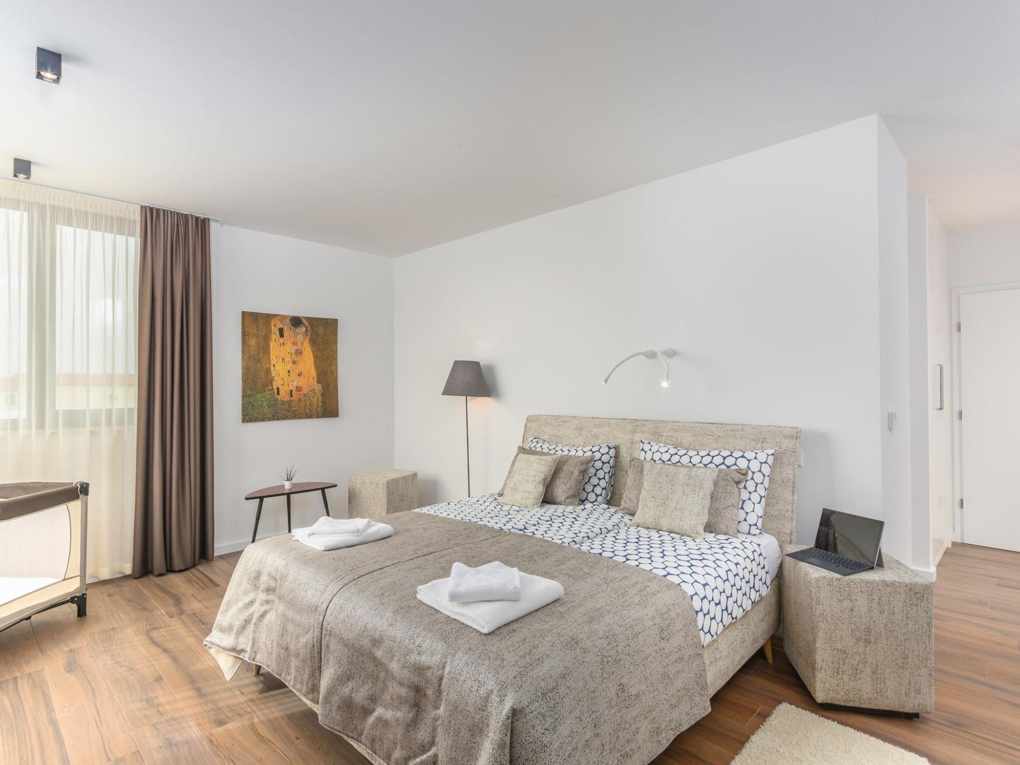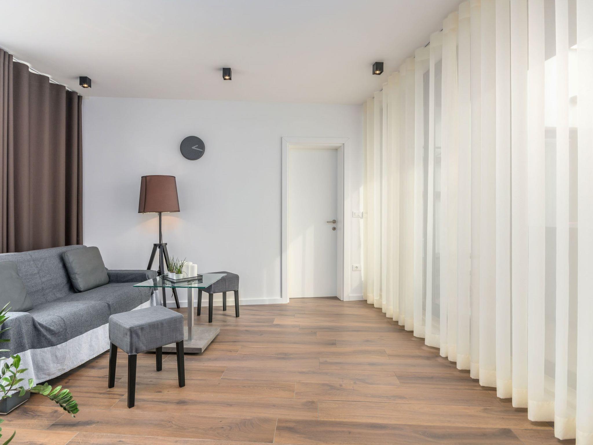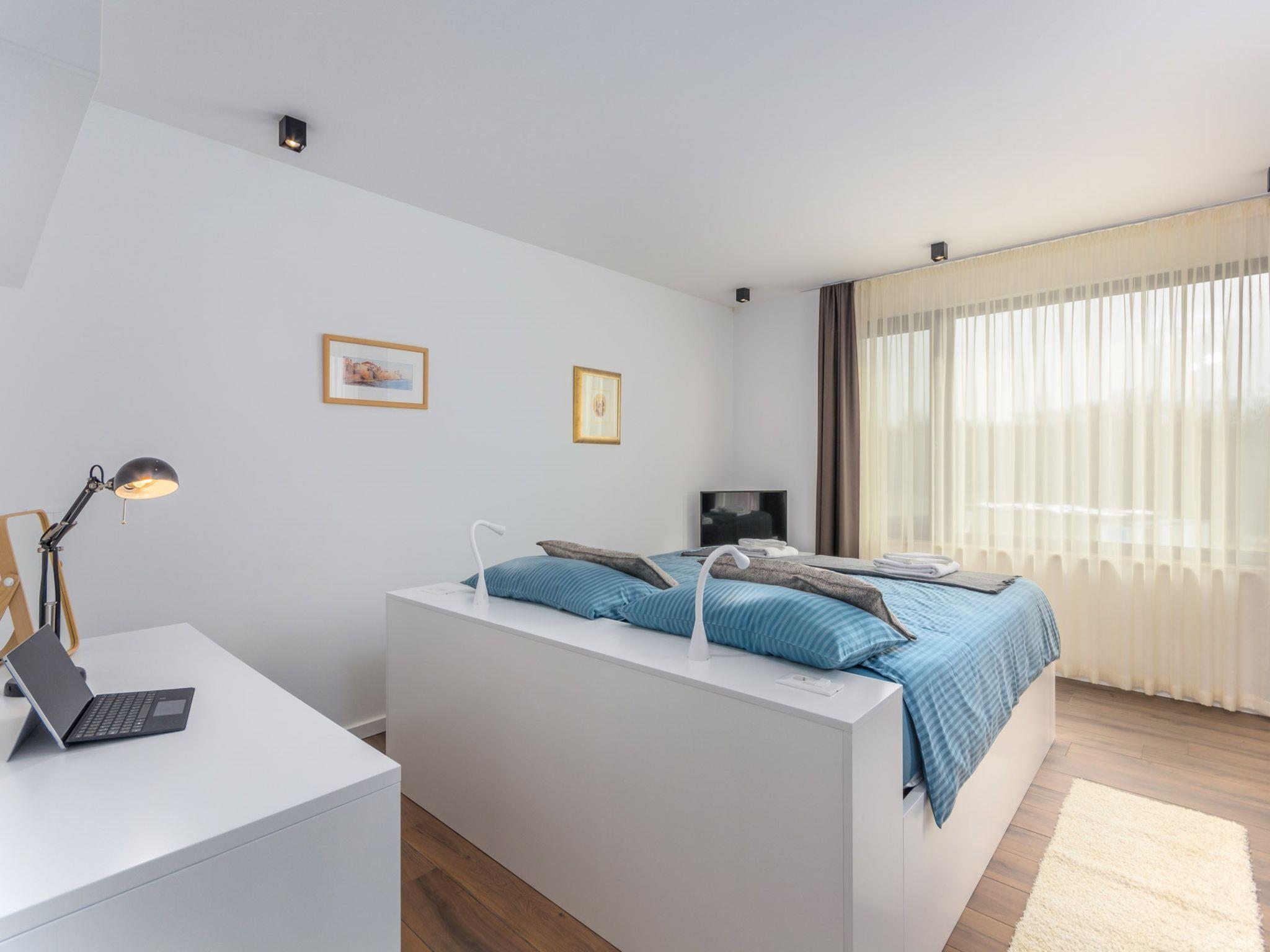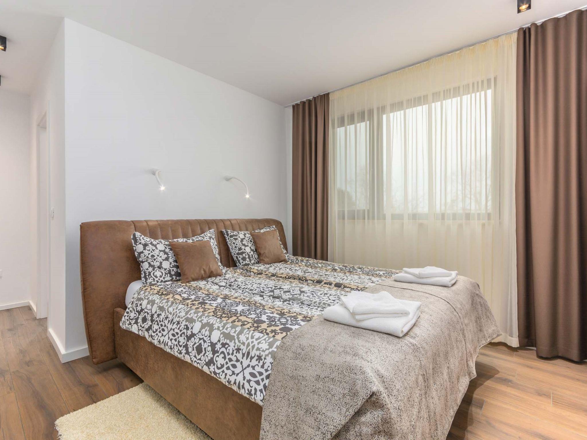 Modern villa "Paolo", 2 storeys. In the hamlet Stancija Vinjeri 2 km from the centre of Novigrad, in a sunny position, 3 km from the sea, 3 km from the beach. Private: property 1'100 m2 (fenced), garden with lawn, swimming pool angular, heated (9 x 5 m, depth 140 cm, seasonal availability: 01.Jan. - 31.Dec.) with internal staircase. Outdoor shower, hot tub, arbour (20 m2), terrace, garden furniture. In the house: internet access, sauna, table football, trampoline, washing machine, tumble dryer. Parking (for 3 cars) at the house on the premises. Shop 1.5 km, supermarket 1.5 km, restaurant 500 m, bus stop 2 km, pebble beach 3 km, rocky beach 3 km. Tennis 2 km, walking paths from the house 500 m, cycle lane 550 m. Nearby attractions: Aquapark 5 km. Please note: airfield 20 km from the property. Swimming pool heated (extra). It is necessary to announce 7 days in advance if the pool heating is required. Available: garden with organic, seasonal fruit and vegetables (included in the price).