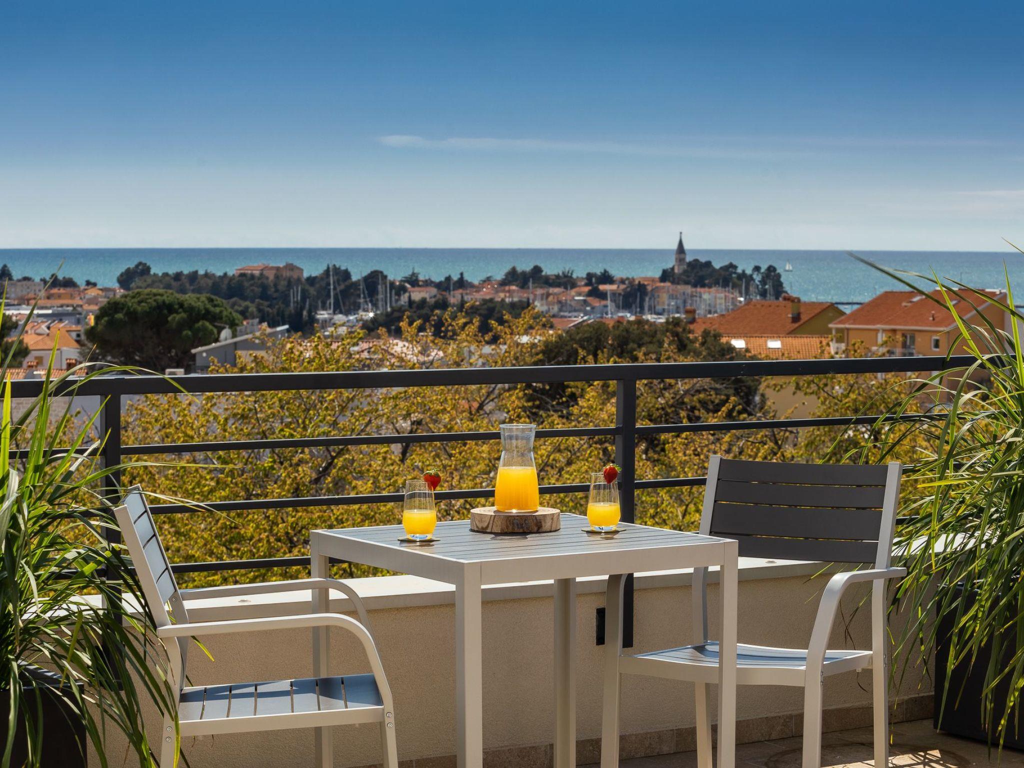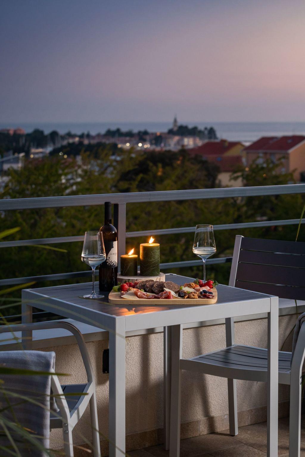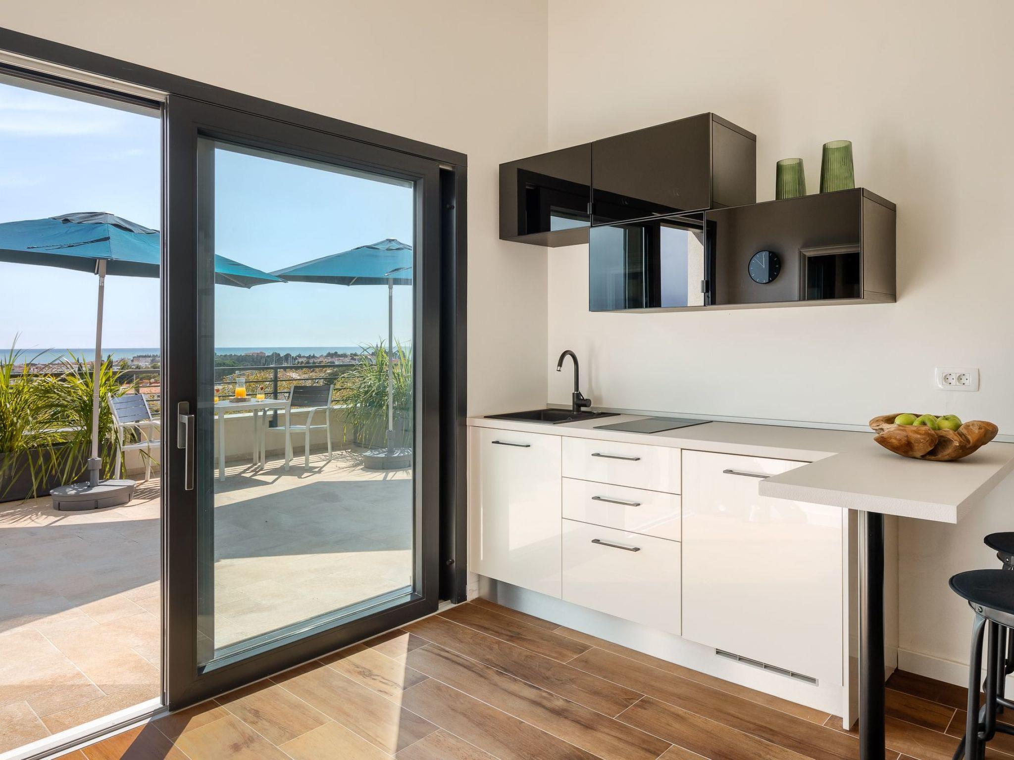 The terrace is not the only spot in the apartment created for romantic moments. Awakening in its luxurious bed, cooking and enjoying a meal in its modern, straight-lined kitchen with a high counter or enjoying the view of nature and the sea simply creates a sense of serenity, quiet, and happiness.