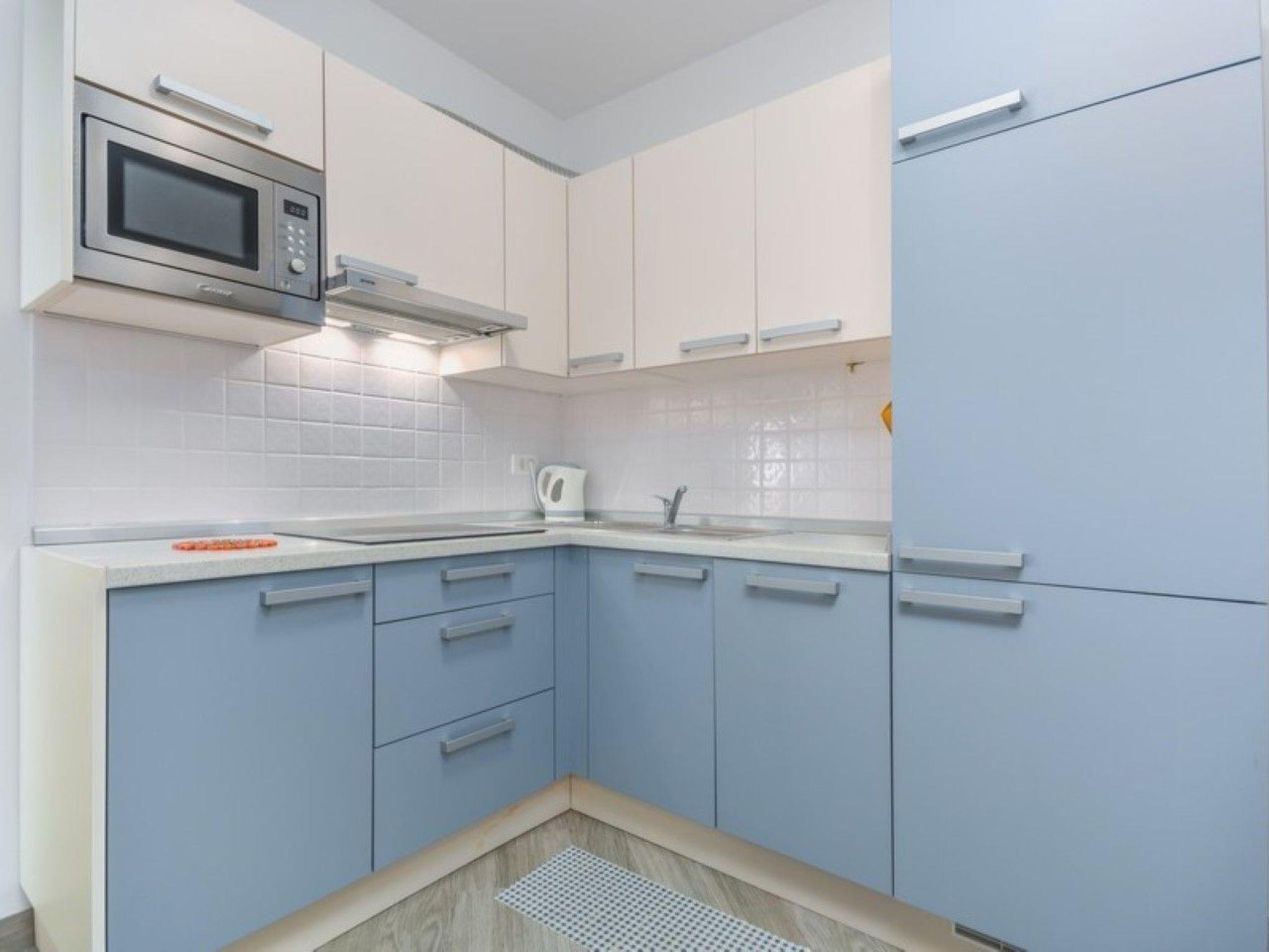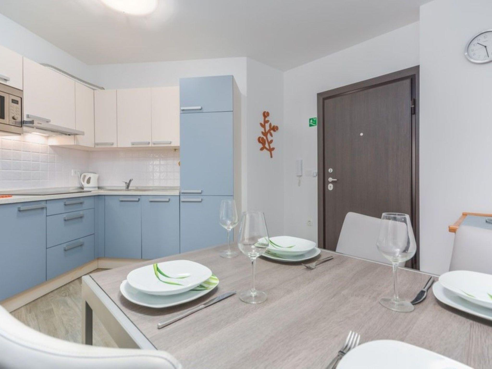 It consists of a bedroom equipped with a comfortable double bed and a wardrobe. The kitchen is fully equipped with basic things for preparing meals, and you can enjoy prepared meals in the living room with dining room. The living room also has a sitting area with a television, which can be converted into an additional bed for two people if necessary. The balcony with a beautiful view offers the possibility of relaxing outdoors and enjoying morning coffee or an evening drink.