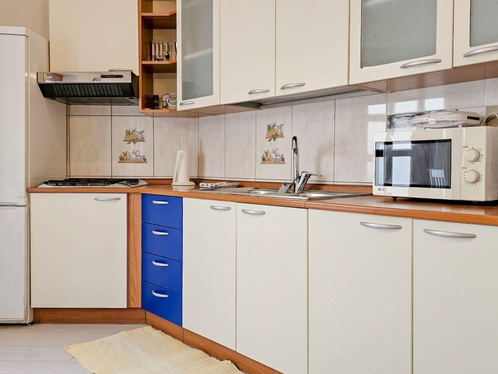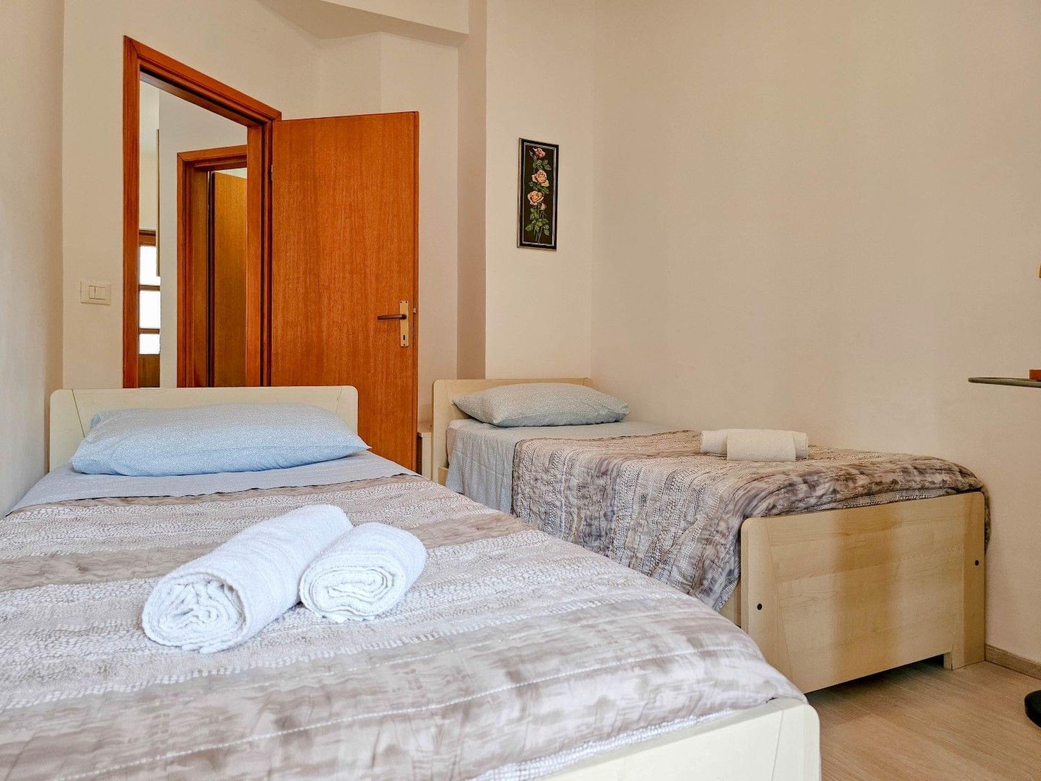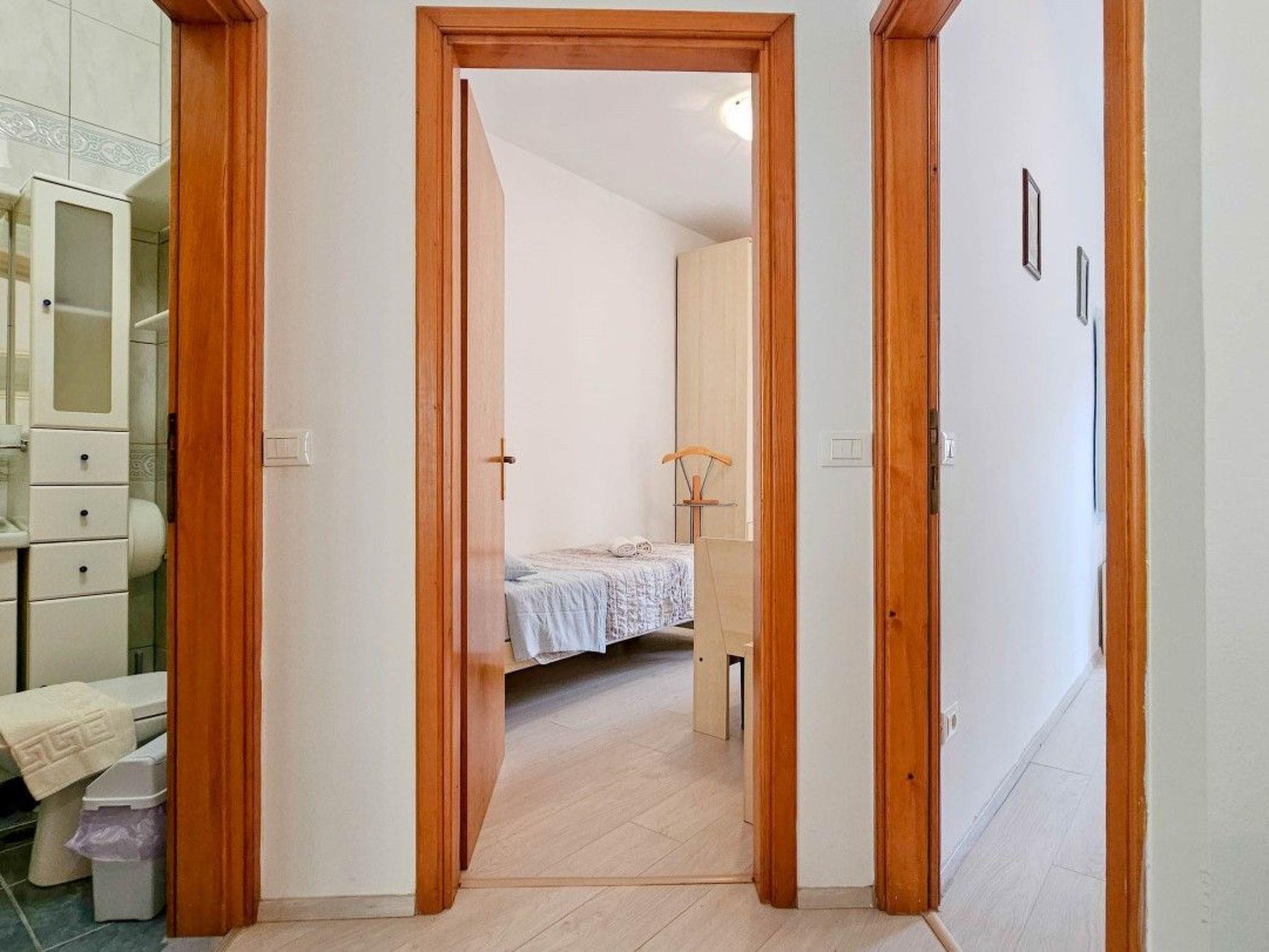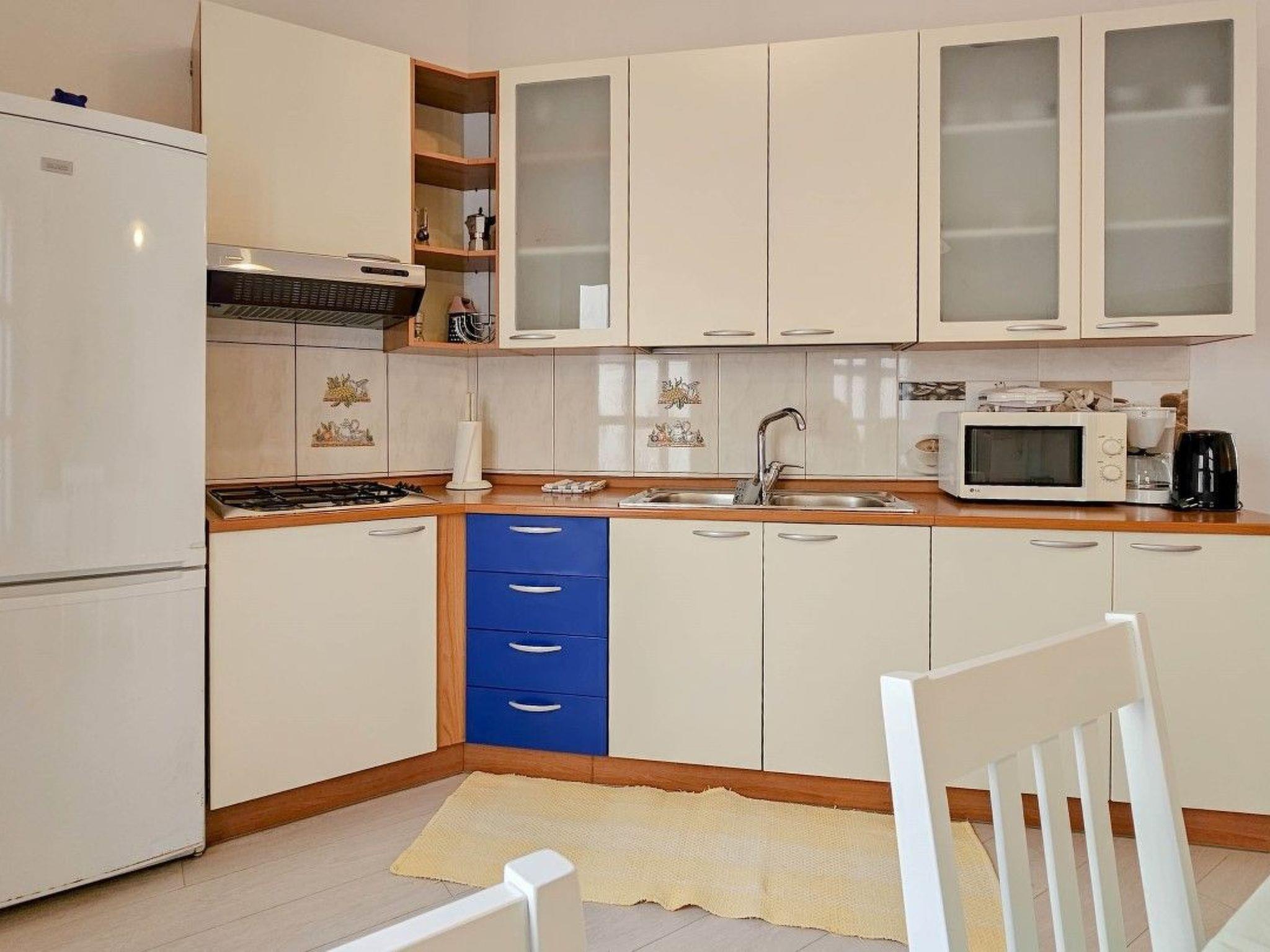 Inside, the apartment is thoughtfully equipped to cater to your every need. The two cozy bedrooms offer a peaceful retreat after a day of exploration and seaside fun. One room features a comfortable double bed, while the other is furnished with two single beds, ensuring a restful night's sleep for everyone. The living space is outfitted with a sofa bed that can accommodate an additional guest, making it ideal for families or a group of friends. The partial air conditioning keeps the ambiance cool and welcoming during those warm, sunny days. A gas stove, refrigerator, and coffee maker in the kitchen allow you to prepare and enjoy your meals with ease, and with a SAT-TV in the living area, entertainment is always at your fingertips.