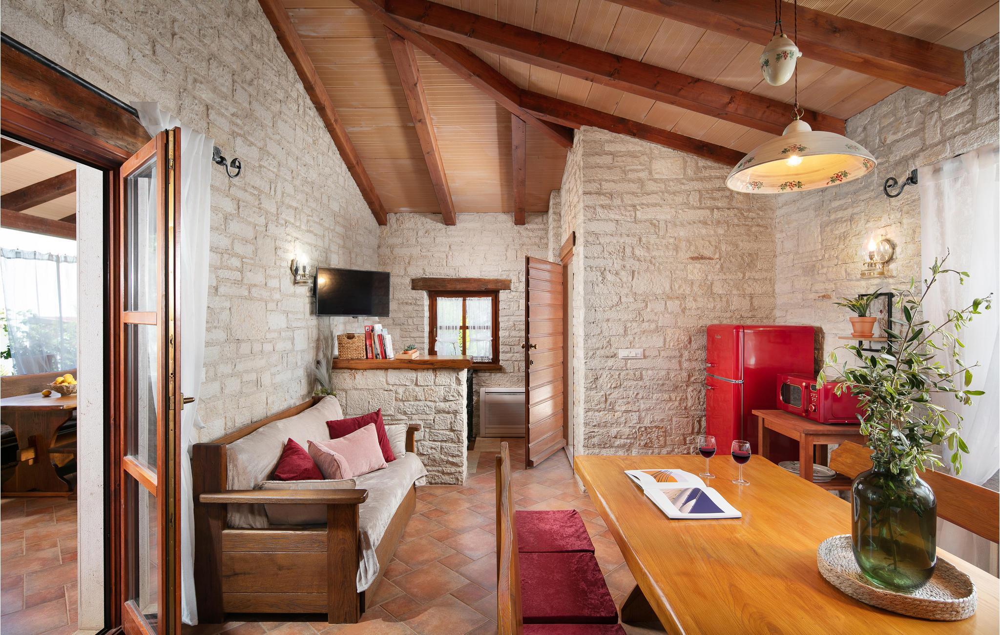 Velkommen til dette smukke stenhus bygget i traditionel istrisk stil. Rejs til Novigrad og bo sammen med din familie i dette smukke og kompakte hus i to etager. Indrettet med det traditionelt udstyrede køkken med pejs, bliver madlavningsoplevelsen en fornøjelse. Føl dig hjemme i boligen med solide træmøbler og kom til ro. Udgangen fra spisestuen fører til en overdækket terrasse udstyret med et bord, hvor du kan nyde skyggen og udsigten til den grønne græsplæne og haven. Grill om aftenen og læg planer for den næste feriedag. Huset ligger kun få hundrede meter fra havet, i umiddelbar nærhed af Novigrad lystbådehavn og stranden. Tilbring timer i havet og slappe af på stranden i solen. Du kan også planlægge ture ind i landet, tage på vandre- og cykelture på den grønne halvø og besøge de større kystbyer Porec og Rovinj. Glæd dig til en fredelig og afslappende ferie på halvøen Istrien!