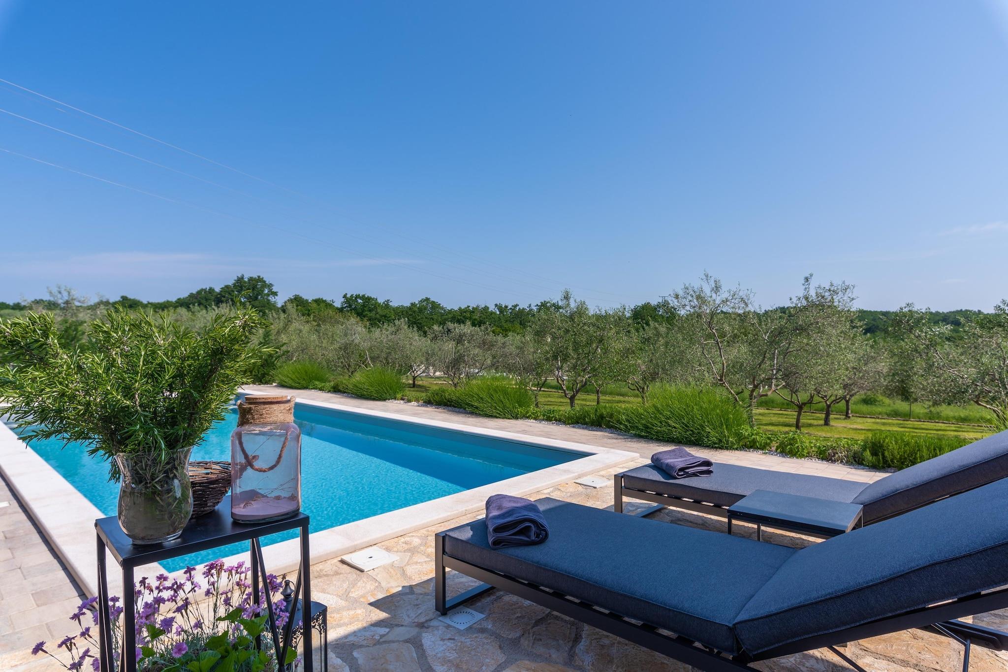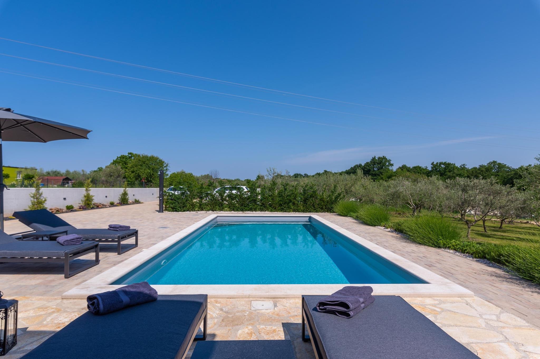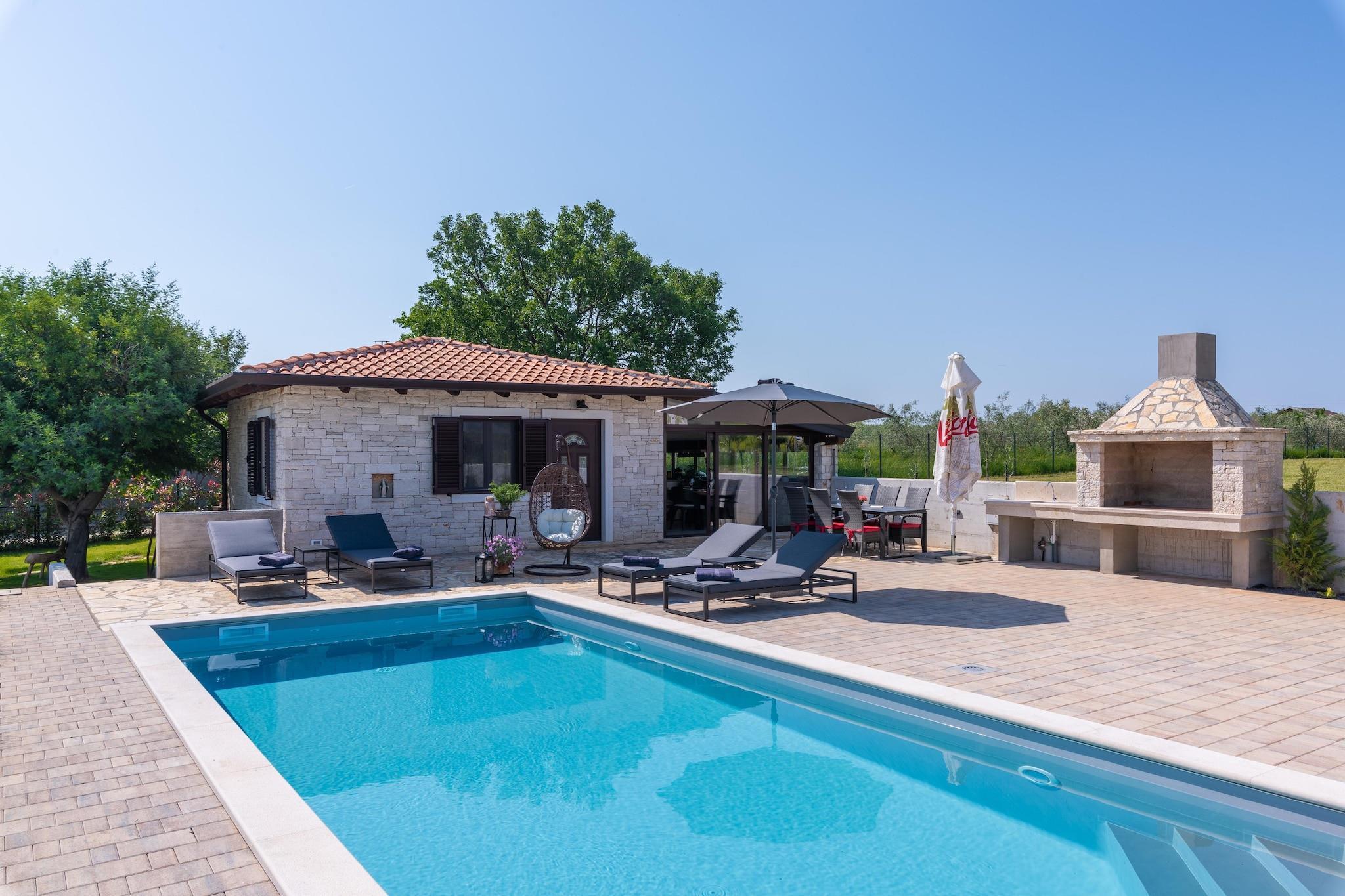 Stueetage: (Stue(dobbeltseng, Fjernsyn(fladskærm, parabol), sofahjørne, klimaanlæg), Køkken(spisebord, elkedel, brødrister, komfur, ovn, mikrobølgeovn, opvaskemaskine , køle-fryseskab), Soveværelse med badeværelse(dobbeltseng, Fjernsyn(fladskærm, parabol), bruser, håndvask, toilet, bidet, klimaanlæg), badeværelse(bruser, håndvask, toilet), terrasse(privat)) vaskemaskine, klimaanlæg, terrasse, have, havemøbler, solstole, grill, parkering, Parasol, swimmingpool(privat), loungemøbler