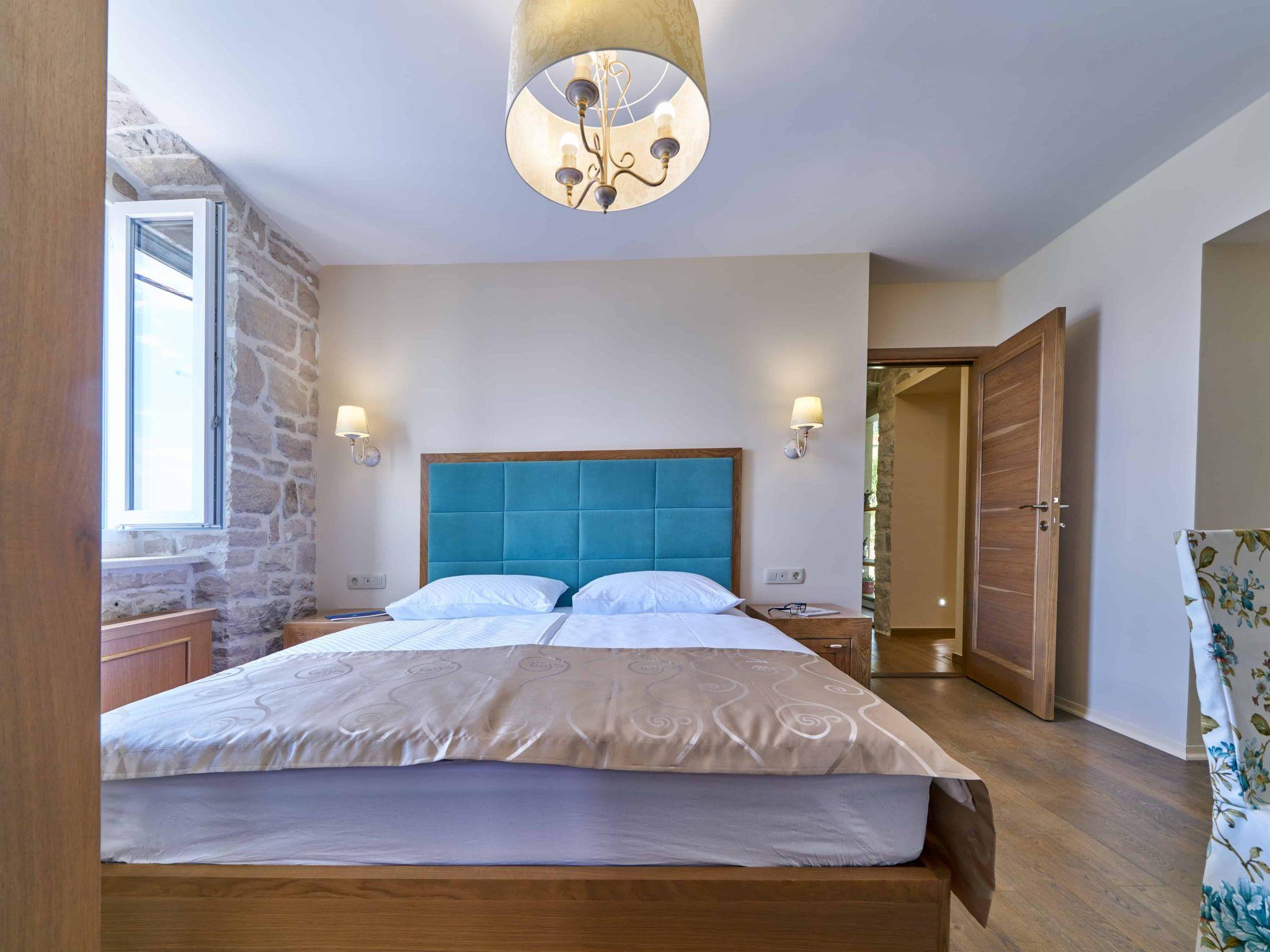 Swimming pool Terrace 70 m2: Private, heated infinity pool 7m x 4m, sun deck area with 6 sunbeds surrounded by Mediterranean garden from one side, and sandy beach just opposite the villa. Inside stone house traditional kitchen with opened fireplace for barbeque. Outside fireplace for grill preparation.