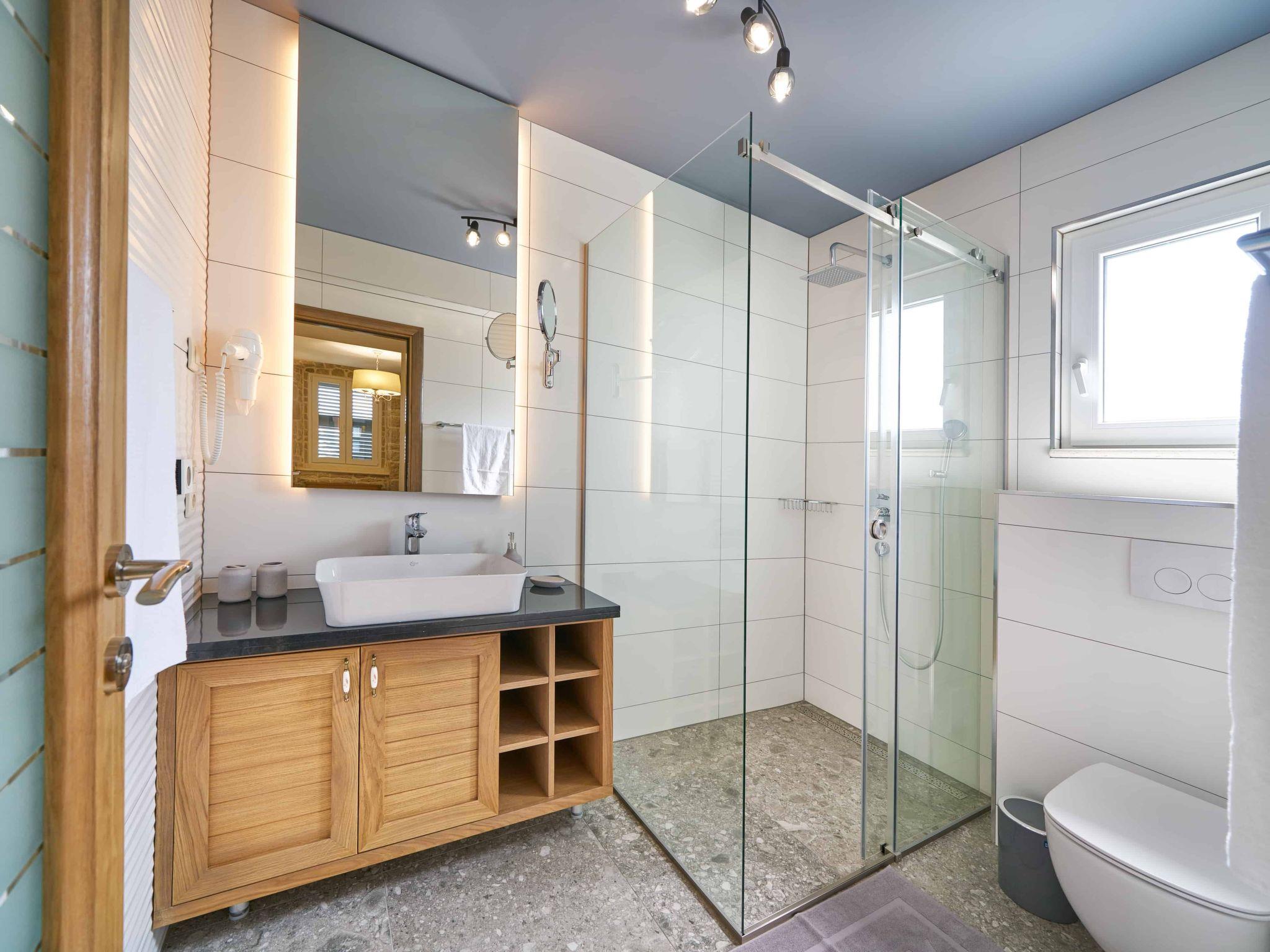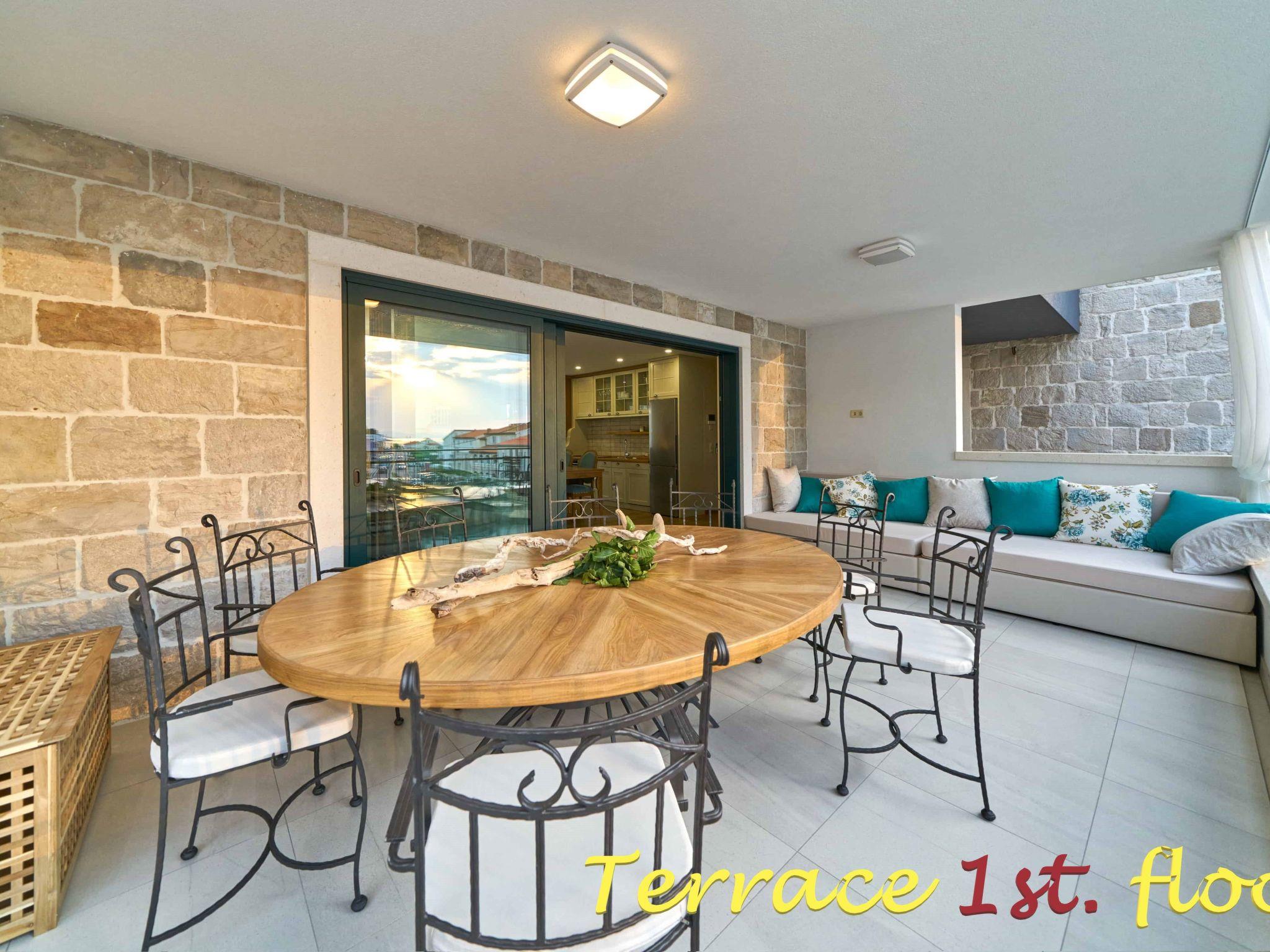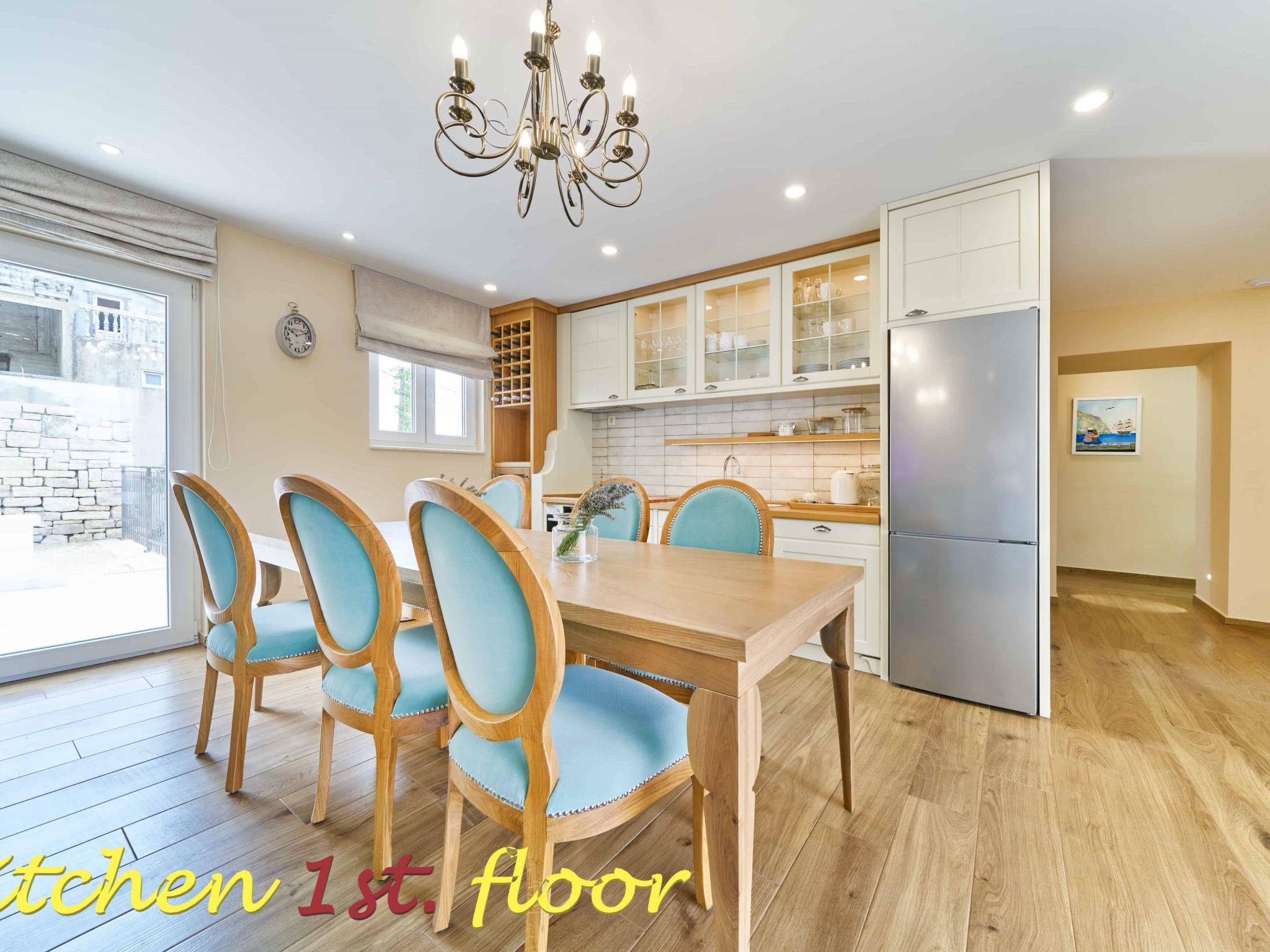 First Floor – 140 m2: 2 double bed bedrooms with ensuite toilets, 1 twin bed bedroom with ensuite toilet, kitchen equipped with dishes for 12 persons, fridge, freezer, owen, wine cooling fridge, coffee maker, toast maker, cattle for boiling water, inside dining area, living room, flat TV with Wi-Fi connection and international programs, large terrace with outside dining and leisure area for 12 persons, air condition, CO detector, fire protection cover fireplace, floor warming, air condition, free Wi-Fi.