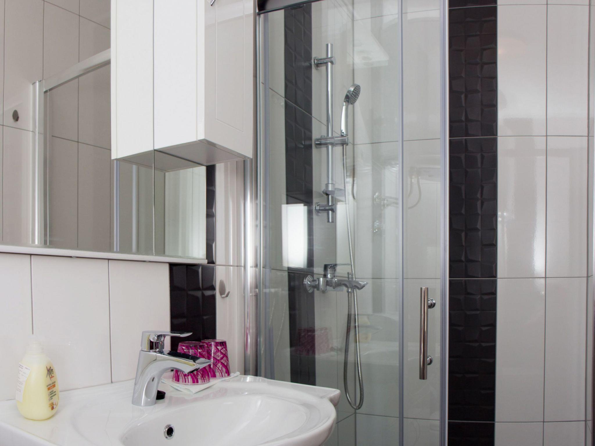 The spacious 72m² apartment occupies the ground floor of a two-storey residential house from the year 1965, whose upper floor is occupied by the owner. It was fully renovated in 2016 and provides modern amenities for a comfortable stay, including air conditioning units (cool and warm) in all rooms. As the apartment benefits from its own separate entrance, privacy is ensured. The apartment provides a living and dining room with an integrated, open kitchen, two bedrooms and three very modern daylight bathrooms (two of which are ensuite). The living room has a comfortable sofa, a wall-mounted flatscreen TV with satellite channels and a wooden dining table with chairs. The white built-in kitchen next to it is equipped with a four-zone gas stove with an elegant stainless steel cooker hood, an oven, a fridge with a freezer compartment, an espresso pot and plenty of crockery and cutlery. The two bedrooms with ensuite bathrooms are each furnished with a double bed (180 x 200cm). As a little extra, they both also have their own flatscreen TV. The sofa in the living room can be converted into an additional double bed for two further people. The three bathrooms are each fitted with a spacious shower cubicle, a washbasin with a wall mirror and a toilet. The separate bathroom also has a washing machine. Plenty of bed linen and towels are provided and the reliable wireless Internet connection in the apartment can be used free of charge.