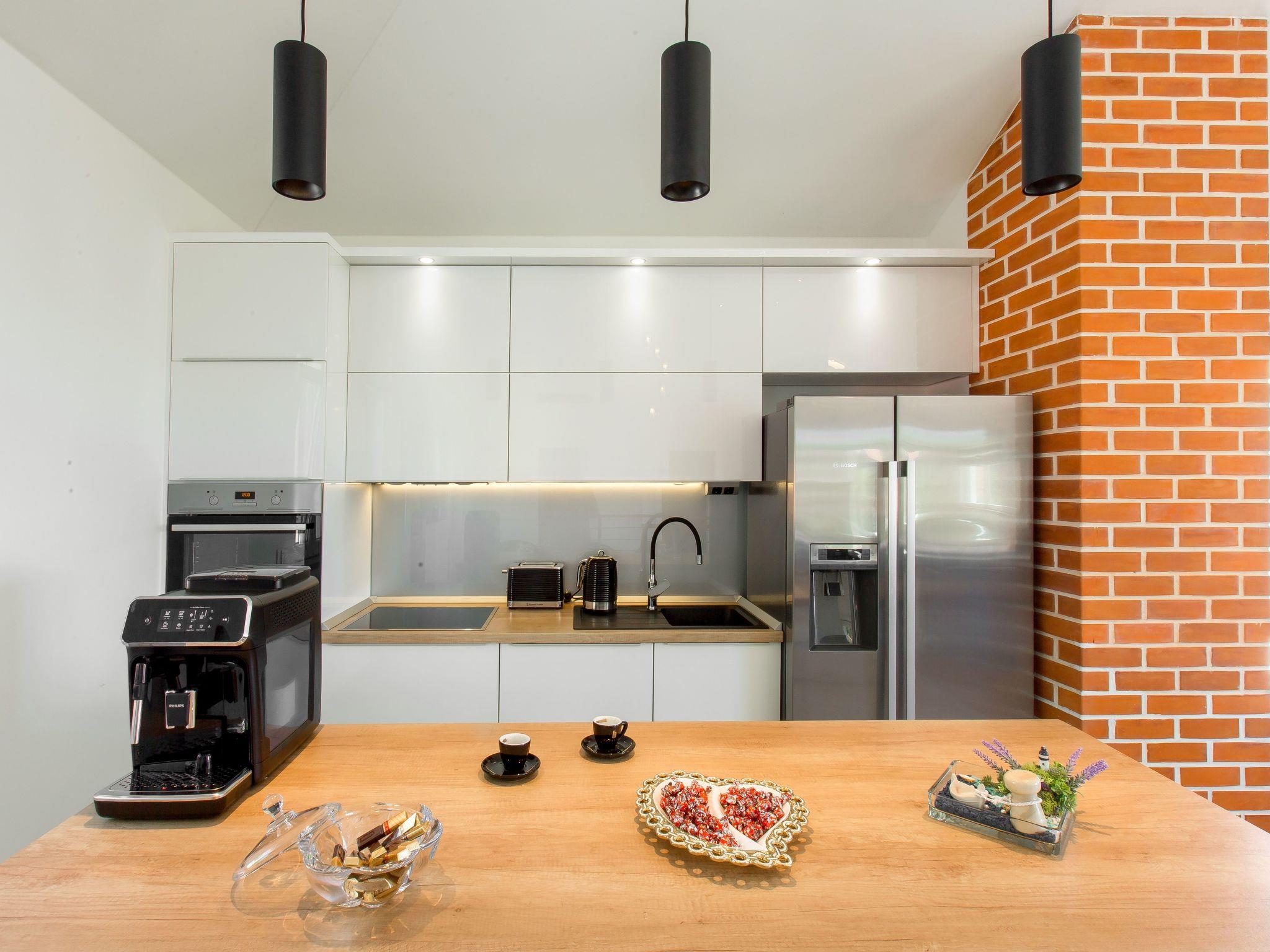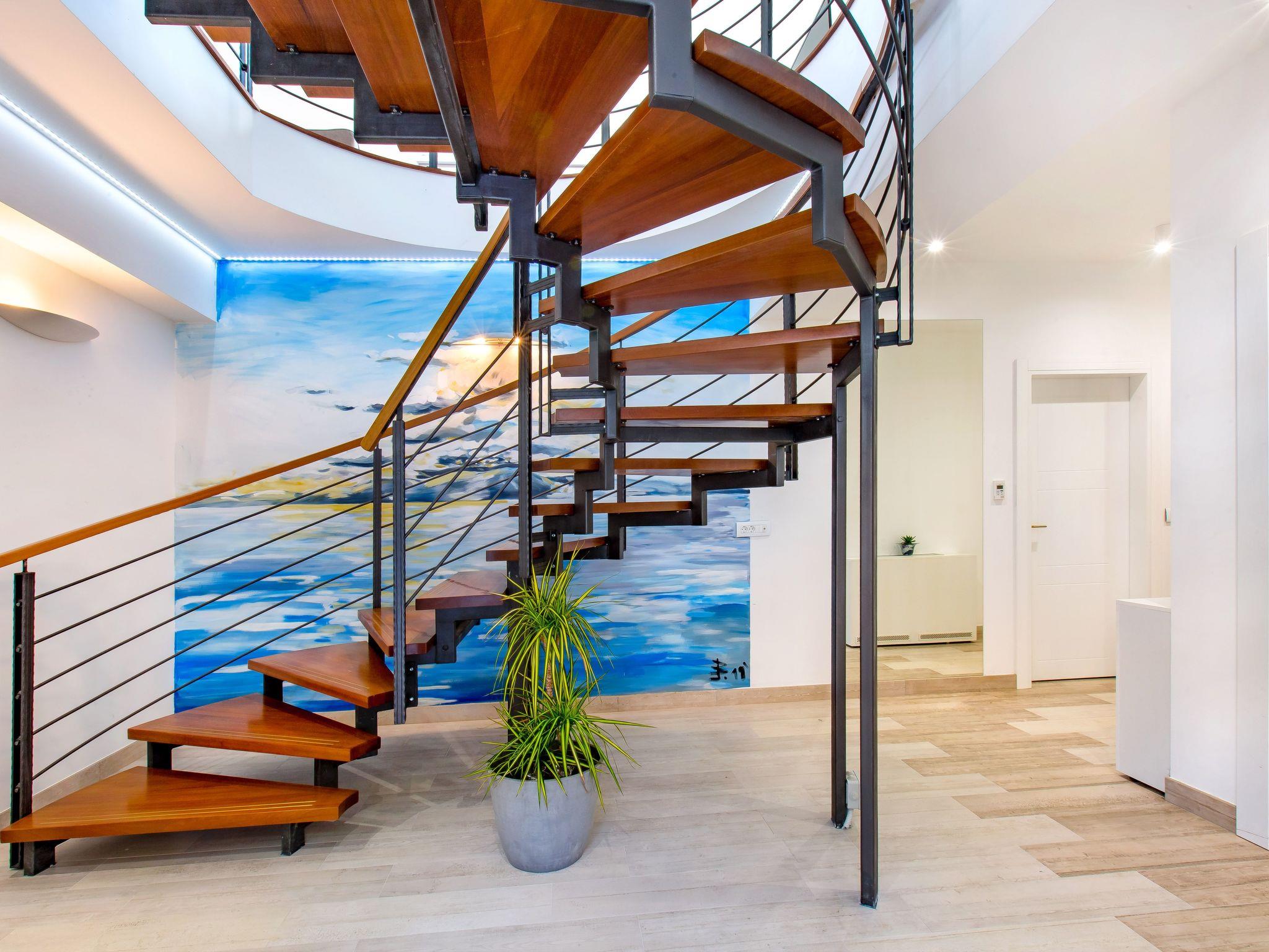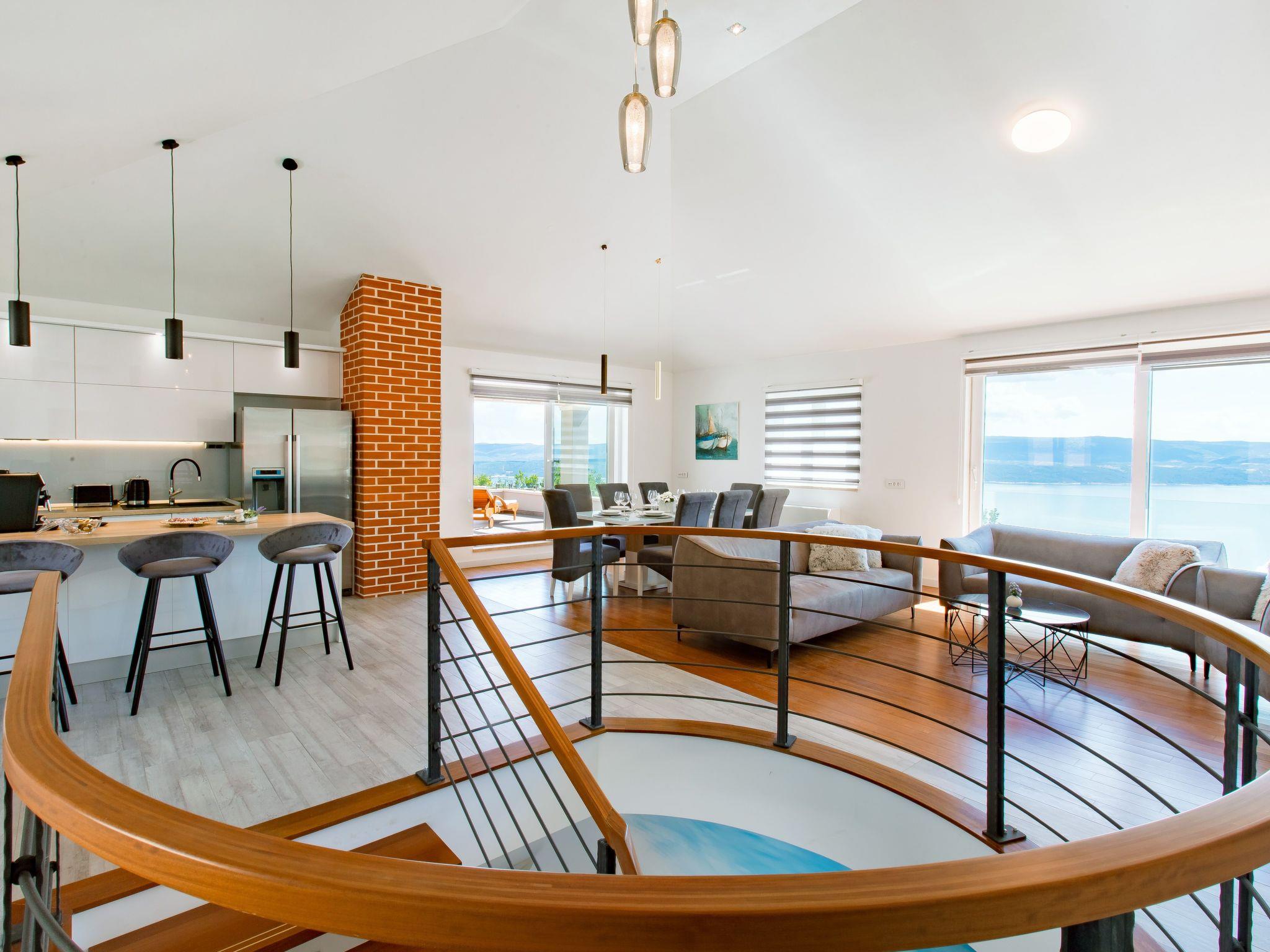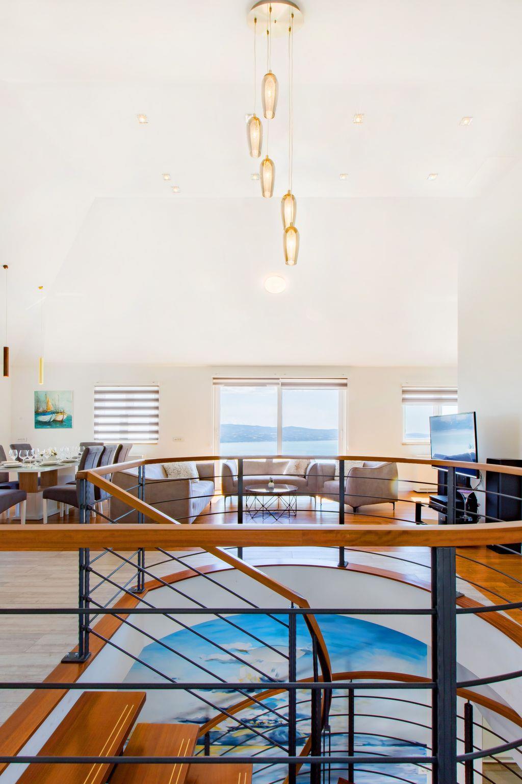 A spiral staircase leads to the second floor of the house, where there is a fully equipped kitchen with a dining area, a cozy living room with two sofas and an armchair, a flat-screen TV and a breathtaking sea view.