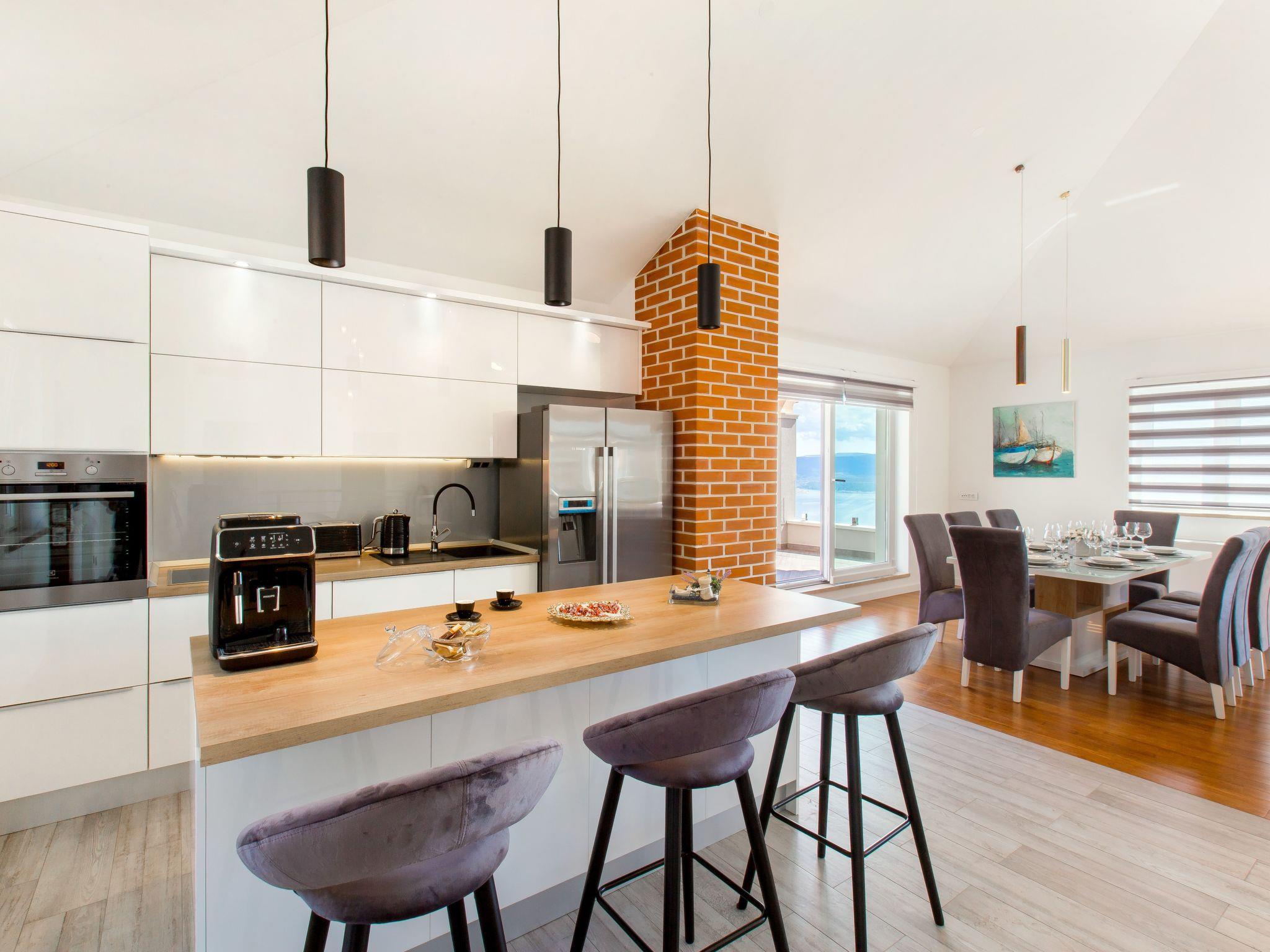 From the dining area, there is access to the spacious terrace with an outdoor dining area and sun loungers. While having lunch you can enjoy a truly spectacular sea view and a pleasant atmosphere.