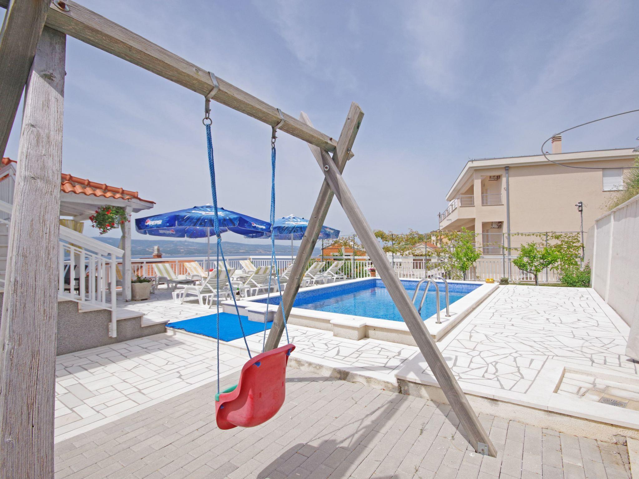 The pool terrace features a large dining table, a sunbathing area, an outdoor shower, and a swing for children. The pool has a lighting system so you can enjoy evening meals and nighttime swimming. The villa itself is fully furnished and spread over three floors, with living areas divided into four apartments. There is an internal staircase connecting the apartments, and the outdoor terraces along with the 140 m² pool terrace are ideal for families or groups—each group can enjoy its own privacy while still having plenty of outdoor space to dine and sunbathe together.