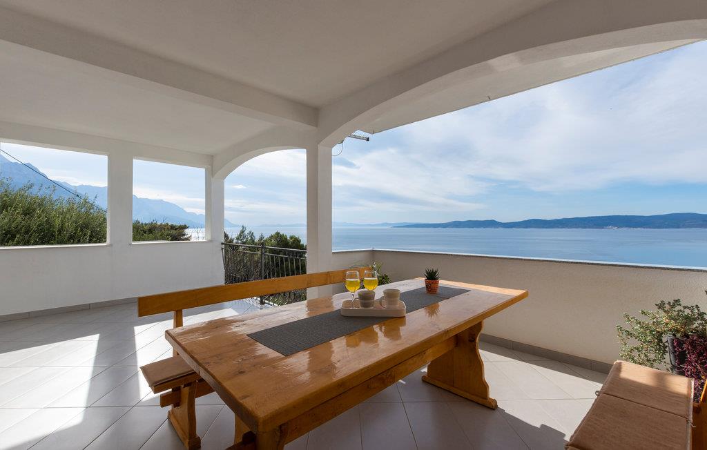 Stuen åbner ud til en stor rummelig terrasse med panoramaudsigt over havet, hvor I kan starte dagen med en kop kaffe eller planlægge dagens aktiviteter.