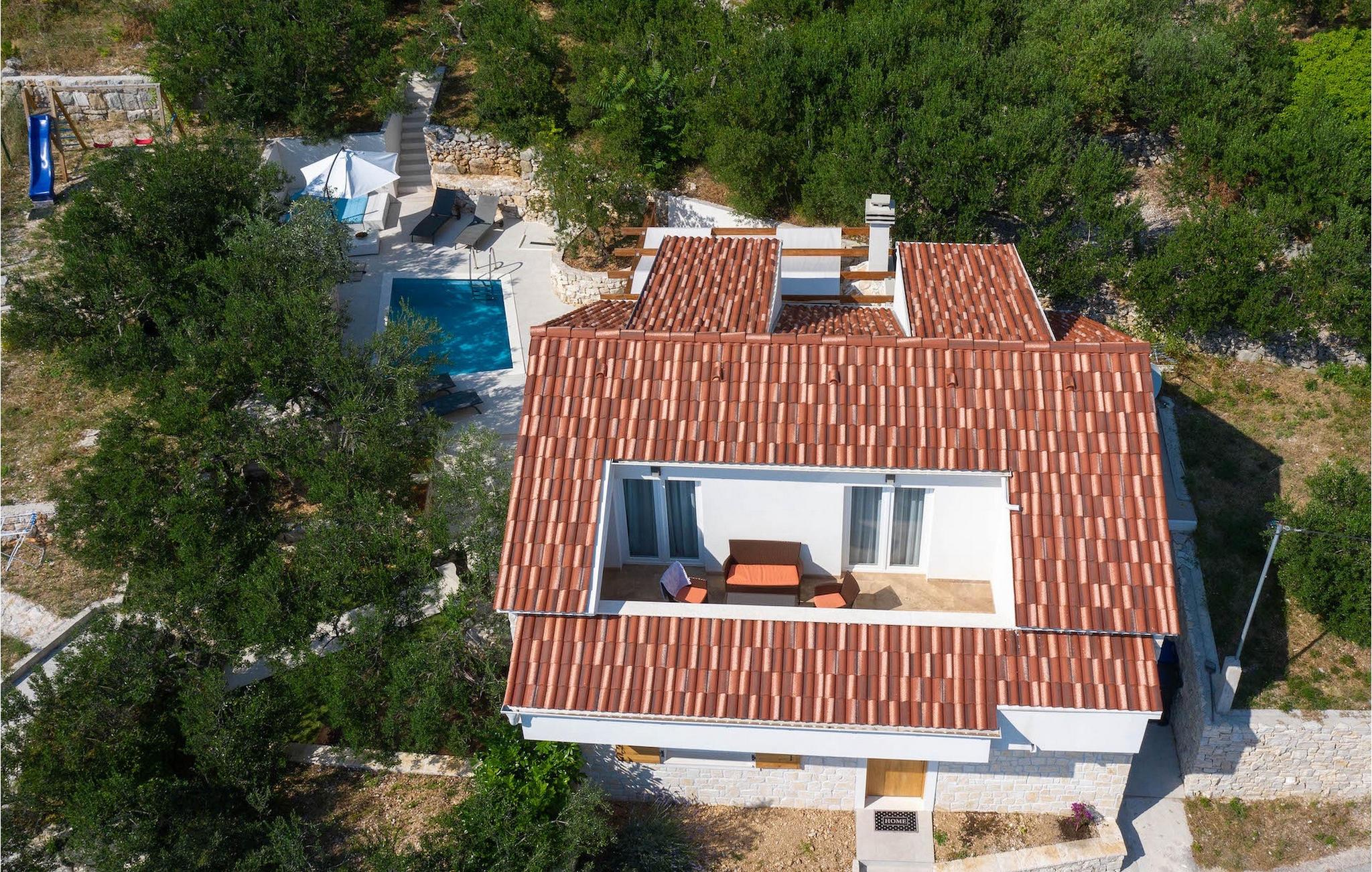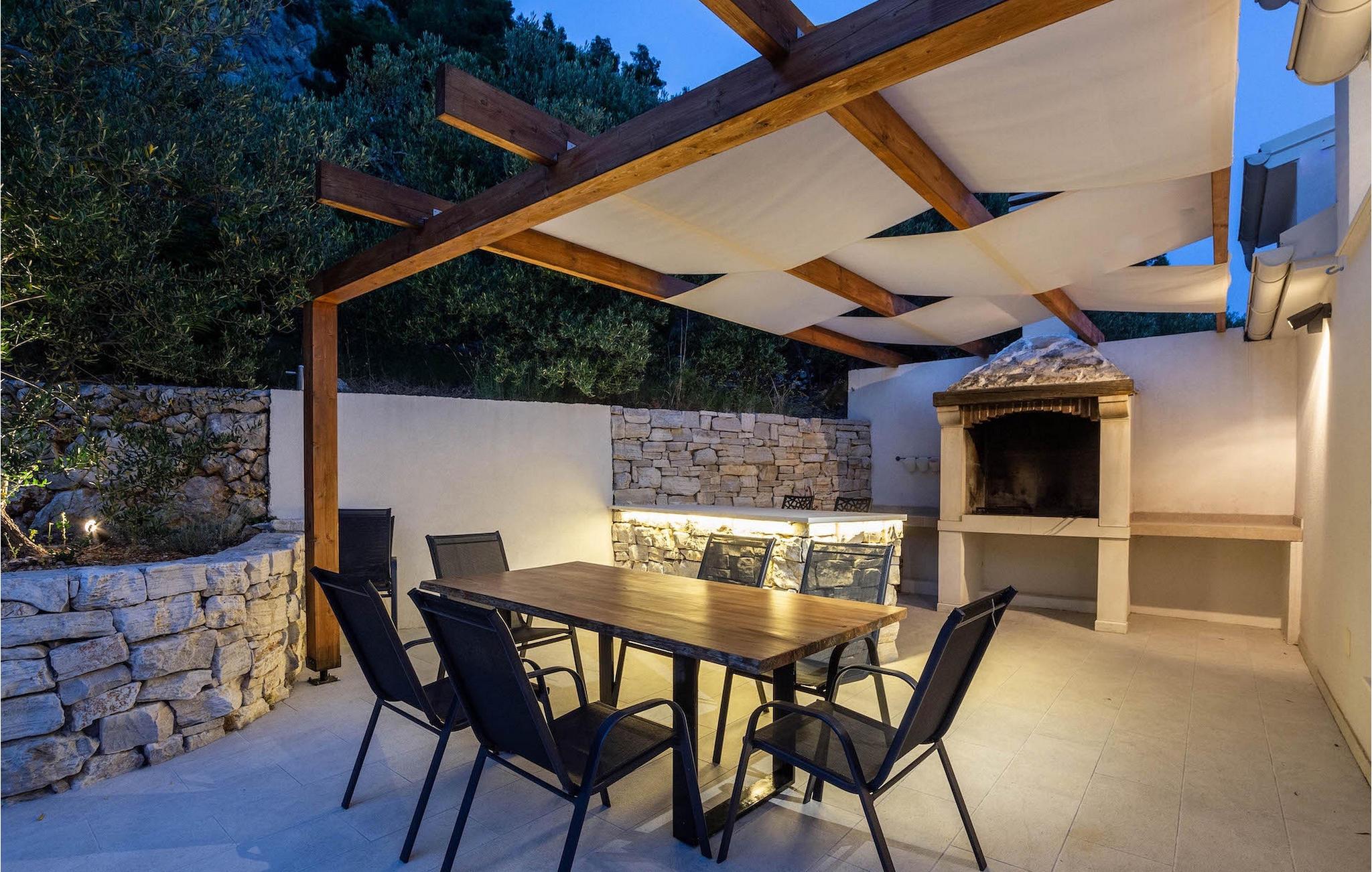 Der private Pool steht für vollkommenen Genuss und Erfrischung zur Verfügung, während die Liegestühle rund um den Pool zur Entspannung und Komfort beitragen. Die überdachte Terrasse ist mit einem Tisch und Stühlen sowie einem Grill ausgestattet. Dort können Sie Schatten suchen und sich mit Ihrem Lieblingsgetränk erfrischen, aber auch frisch zubereitete Köstlichkeiten vom Grill genießen.