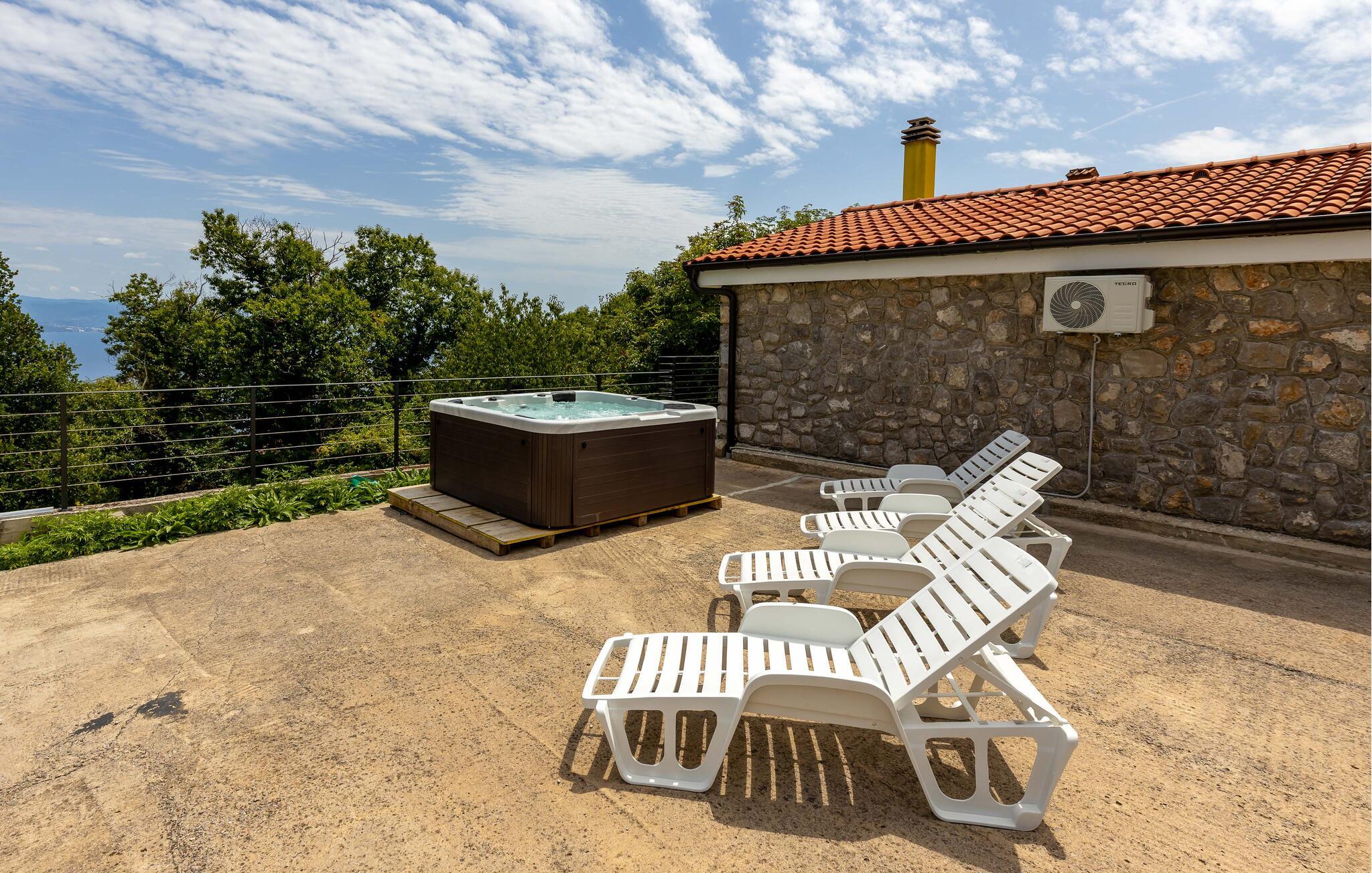 Gå barfodet ud på den åbne terrasse om morgenen og fyld lungerne med den friske luft. Et vidunderligt spabad venter jer, hvor I kan nyde nogle afslappende øjeblikke, før I slapper af på liggestolen og nyder den fredelige atmosfære. Tænd op i grillen og snak over et glas vin under åben himmel.
