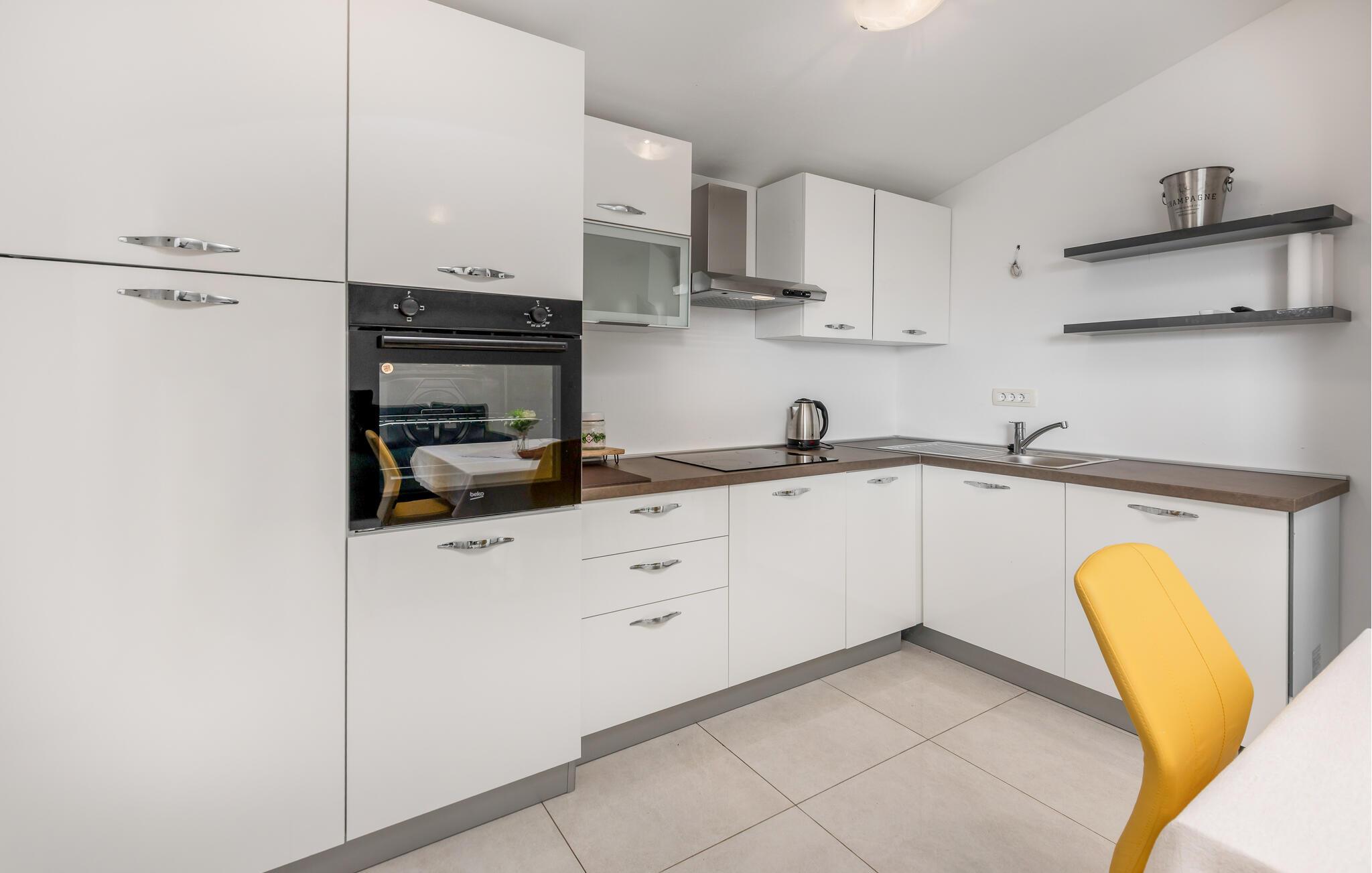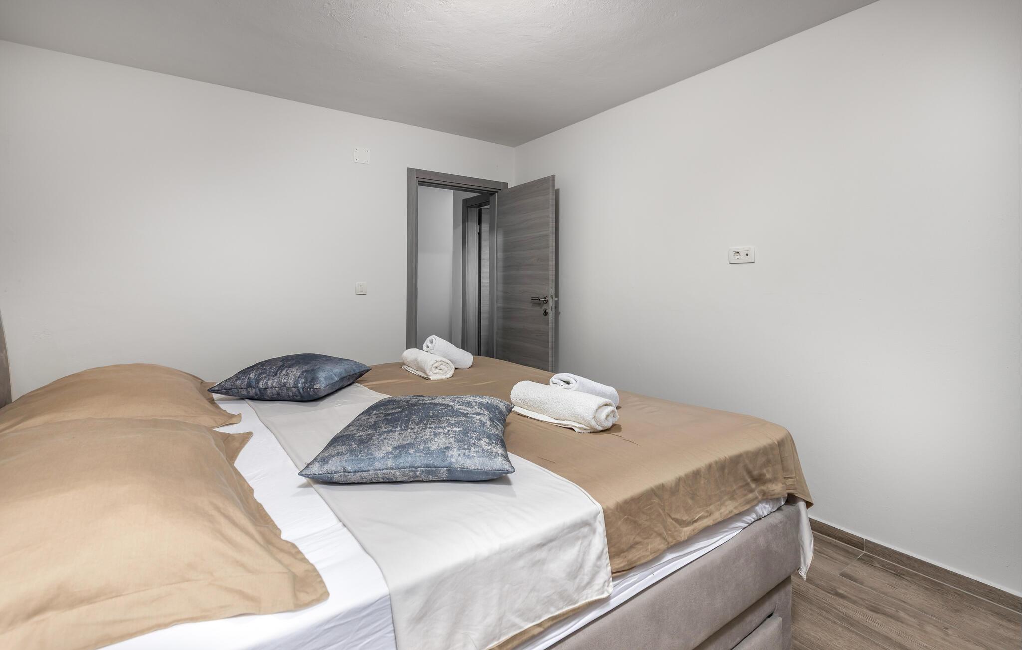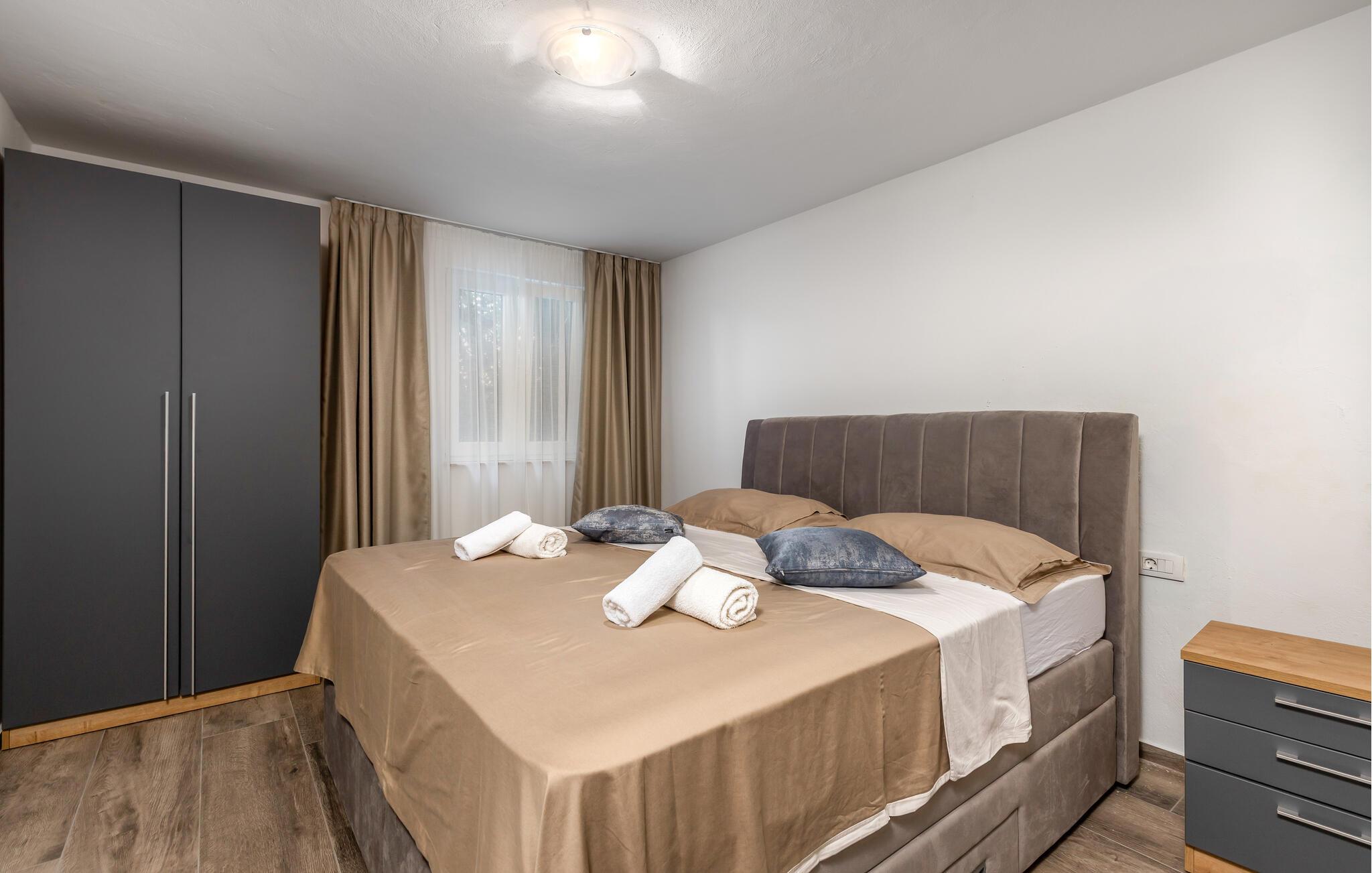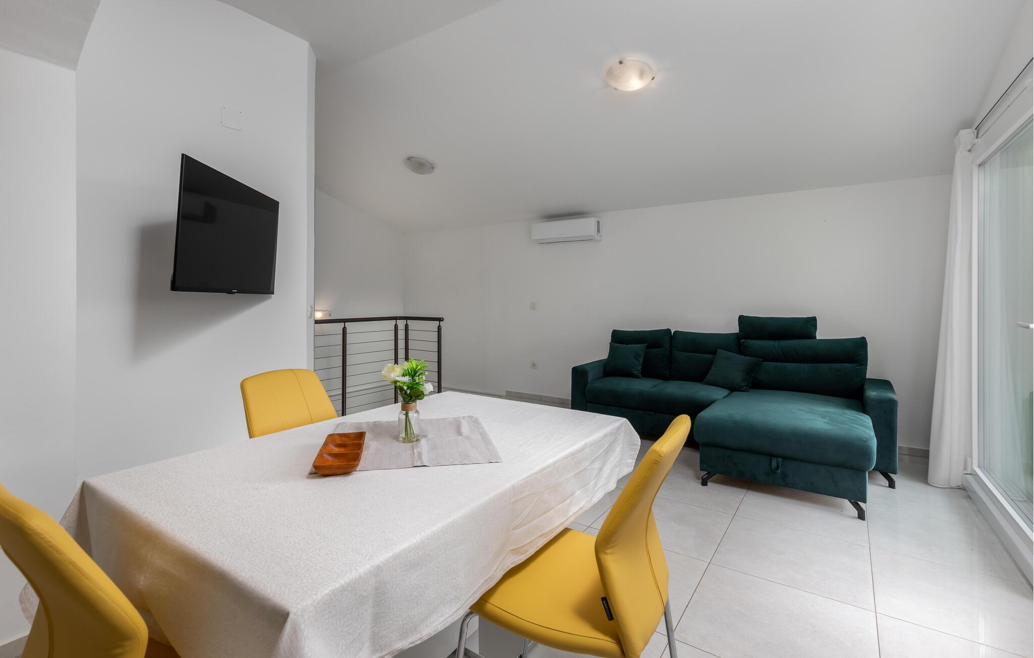 Beliggende i de grønne bakker syd for Dobrec inviterer dette komfortable feriehus jer til at tilbringe afslappende dage og forkæler jer med fortryllende udsigter helt ned til havet. Tilbered middelhavsretter i det åbne køkken og nyd den friske, beroligende atmosfære over afslappede måltider. Efter en lang dag kan I streame en film eller slappe af på den behagelige sofa med en god bog.