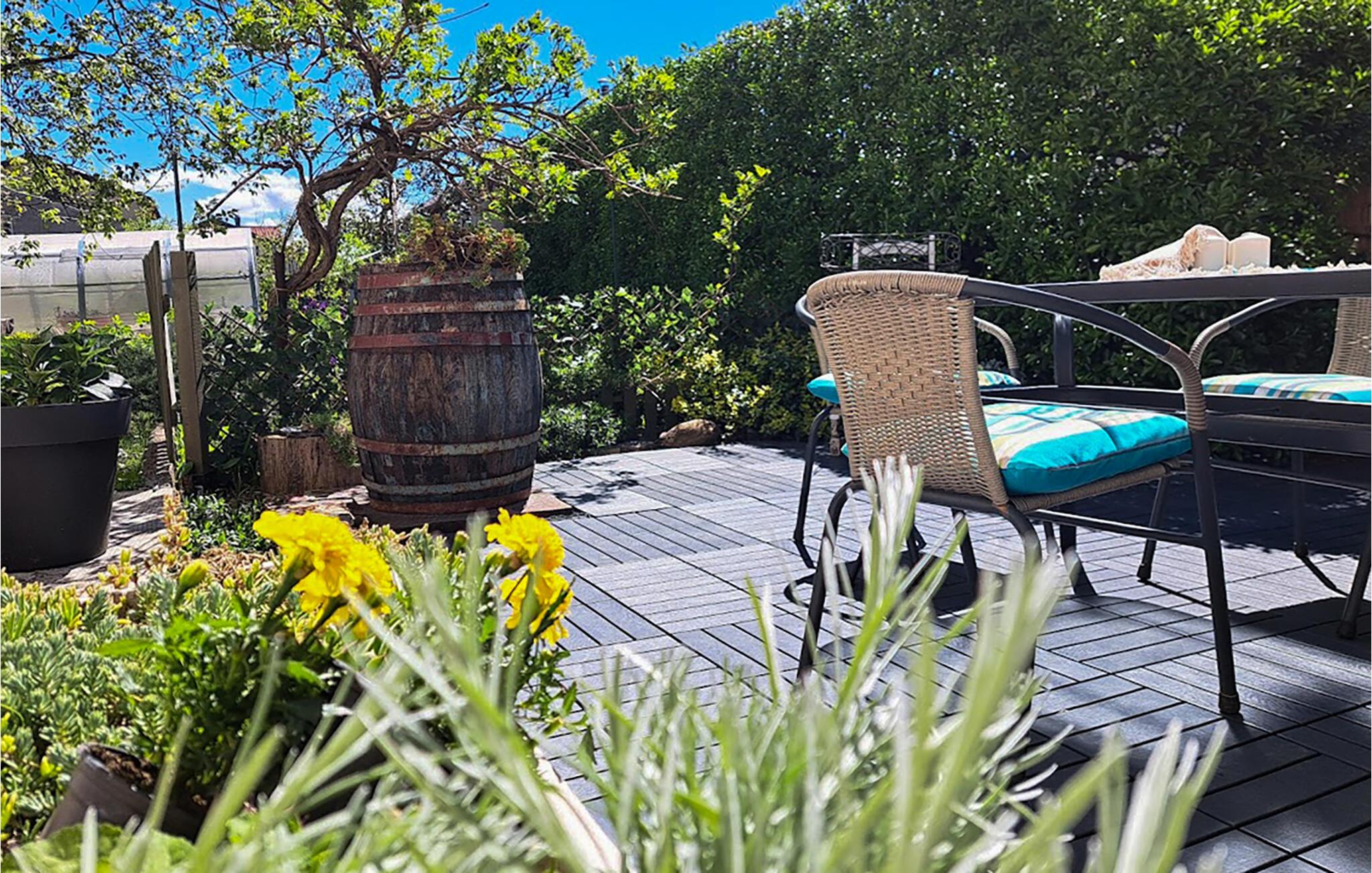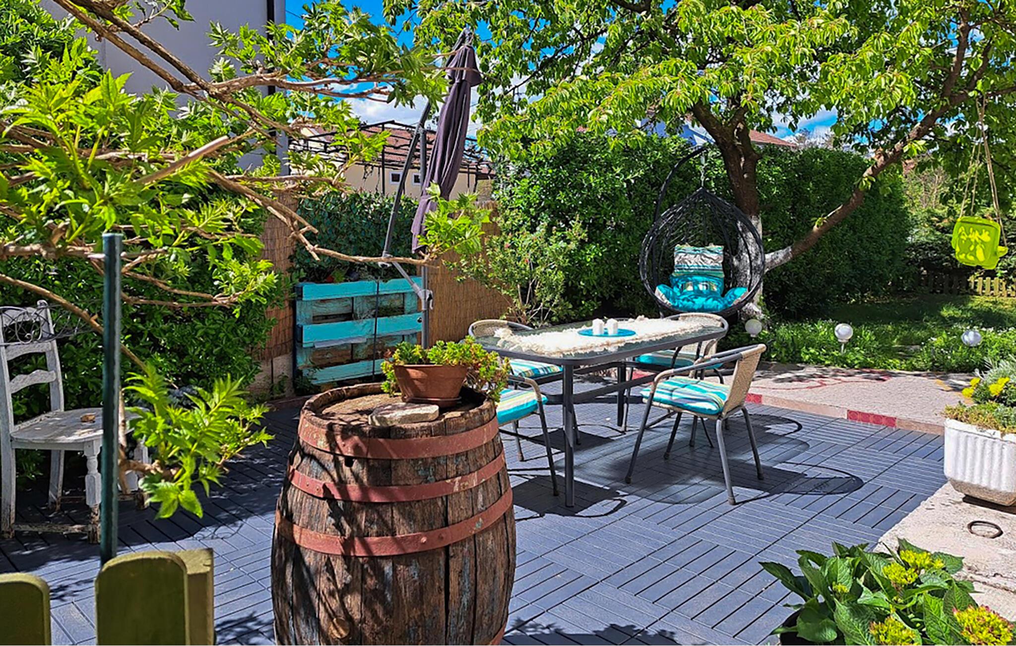 Gå ud på den idylliske terrasse. Slap af i den hængende kurvestol under træet, eller sæt jer på en af ??de farverige havestole. Omgivet af blomster, trædekorationer og gamle vintønder finder I en særlig atmosfære af fred og tryghed. Nyd solen eller læs en bog i skyggen af ??den grønne hæk.