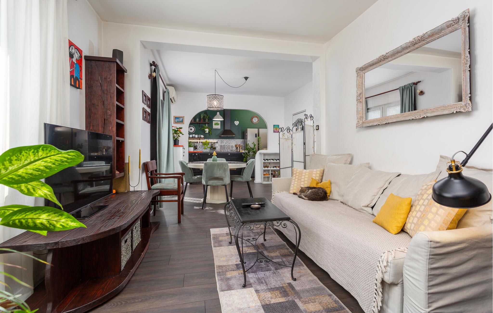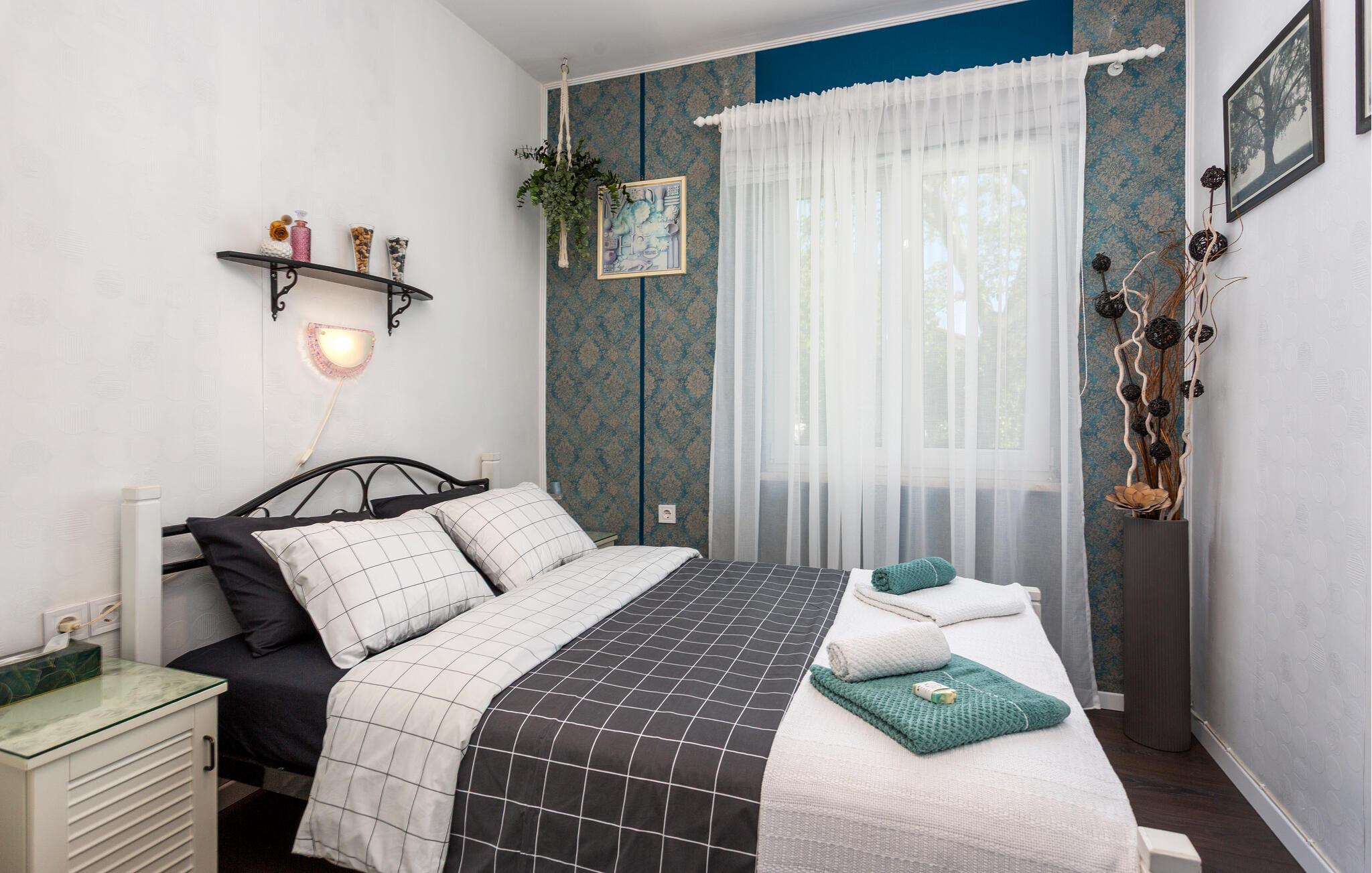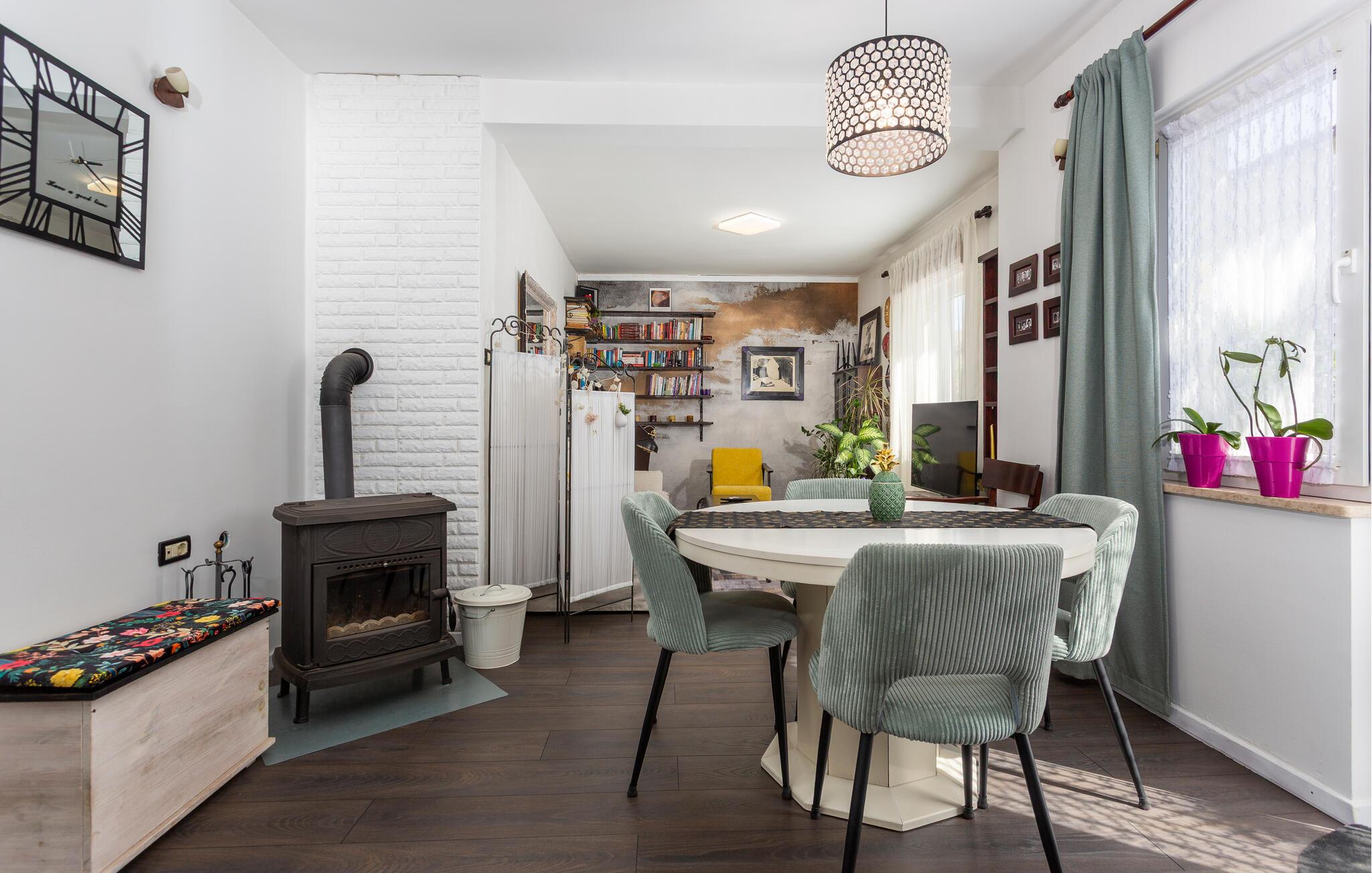 Denne charmerende ferielejlighed tilbyder jer en vellykket kombination af hyggelig boligkomfort og et naturligt udendørsområde. Gør det behageligt i den individuelt indrettede stue med boghjørne, tv og pejs. Lad blikket vandre hen over de smagfuldt dekorerede vægge og nyd indretningens personlige præg. Brug den smukke spiseplads til fælles måltider og lav mad i det praktisk indrettede køkken med moderne apparater.