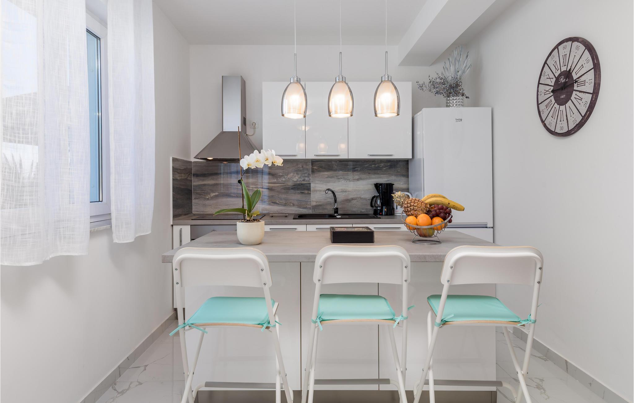 Det komfortable og rummelige hus byder jer velkommen i en god beliggenhed over for stranden Medveja, en af de smukkeste strande i Kvarner. Glæd jer til hyggelige rum med en moderne og maritim indretning. Slap af i de behagelige omgivelser, nyd fælles måltider ved det lange spisebord med fantastisk havudsigt, og hyg jer sammen på sofaen efter oplevelsesrige dage.