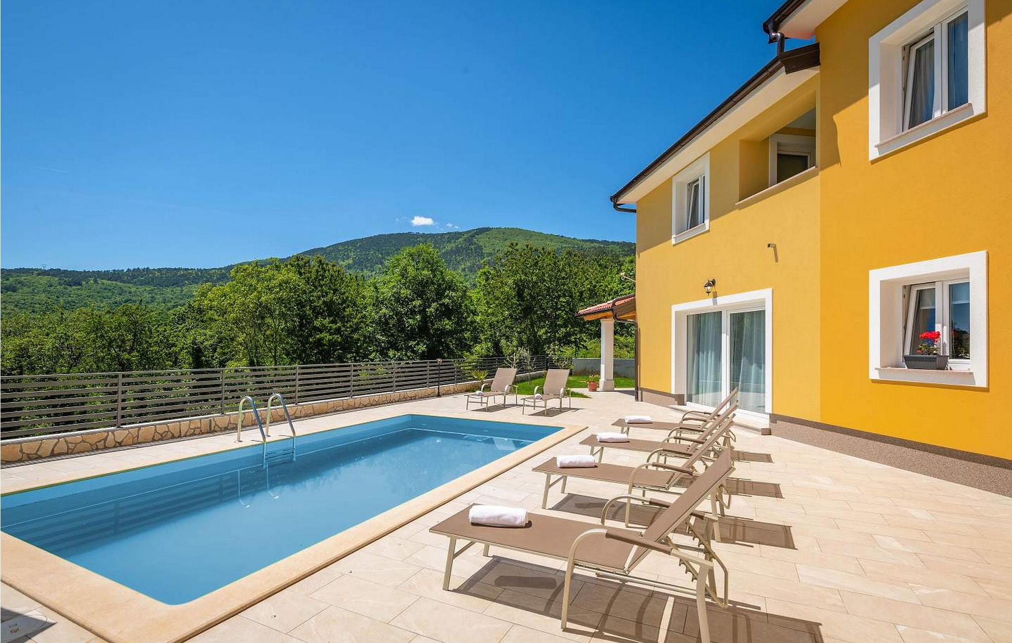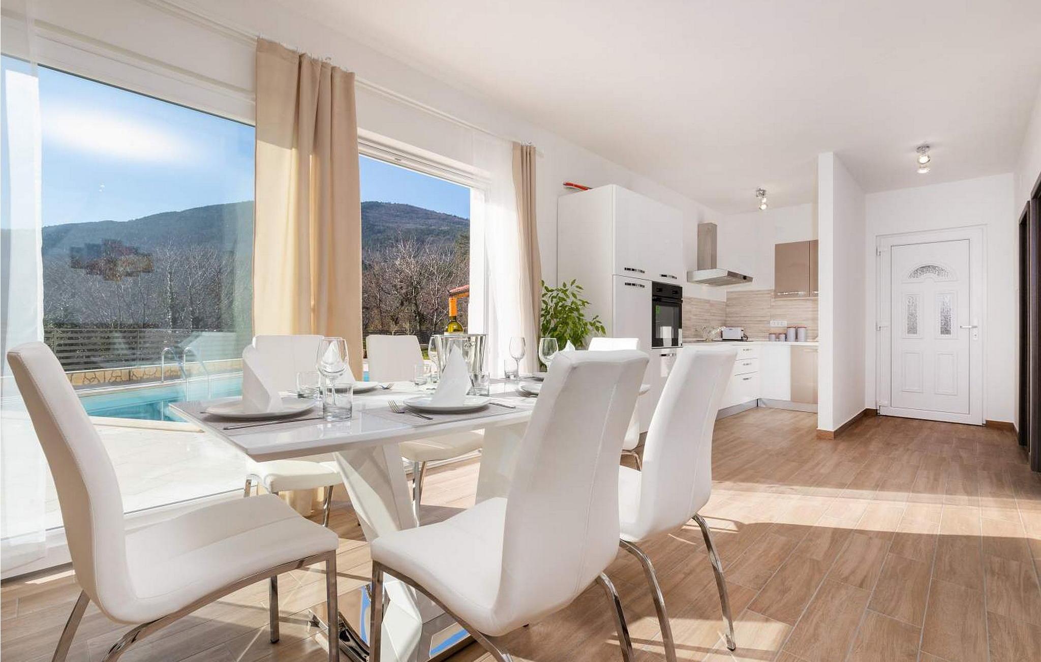 Villa Terra er et nybygget og rummeligt hus beliggende i en rolig beliggenhed, over den lille landsby Moscenice, nær kystbyen Moscenicka Draga med den smukke stenstrand Sipar. Ved siden af ??huset er der en bio-grøntsagshave til gæsternes rådighed. For dem, der ønsker at besøge den berømte Adriaterhavsperle Opatija eller byen Rijeka, vil det kun tage 30 - 40 minutter i bil. Denne unikke beliggenhed giver dig muligheden for en afslappende ferie væk fra de overfyldte, larmende veje med smuk panoramaudsigt over havet i uspoleret natur ved Ucka-bjerget nedad. Villa Terra ligger på en fuldt indhegnet have på 1300 kvm og tilbyder sine gæster en udendørs pool på 32 kvm med en rummelig solterrasse og liggestole, to overdækkede terrasser udstyret med bord og stole til 6 personer, en stor overdækket terrasse på forsiden af huset med grill og faciliteter såsom bordfodbold og bordtennis, 2 parkeringspladser inde i ejendommen og 2 mere på ydersiden og en legeplads. Villa Terra med et samlet areal på 220 kvm kan rumme op til 8 gæster. Den består af to separate boligenheder, hver enhed med følgende layout: i stueetagen er der stue, spisestue og udstyret køkken og et bad/toilet; på øverste etage er der to soveværelser, et med dobbeltseng og eget bad/toilet og et med separate senge og eget bad/toilet. Soveværelserne deler balkon med flot panoramaudsigt. Huset er fuldt airconditioneret. Bemærk venligst, at denne ejendom ikke accepterer ungdomsgrupper eller polterabends. En ungdomsgruppe på denne ejendom er en gruppe bestående af personer på 26 år eller derunder. Book ikke denne ejendom, hvis du er en ungdomsgruppe eller et polterabend, da din reservation vil blive afvist efter booking, hvilket kan omfatte ved ankomst til ejendommen eller under dit ophold, og du vil ikke blive refunderet.