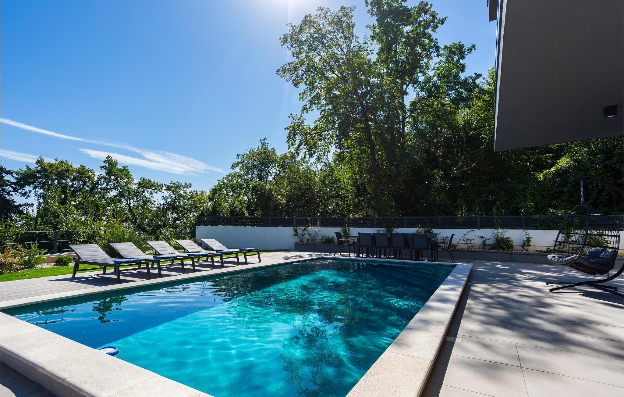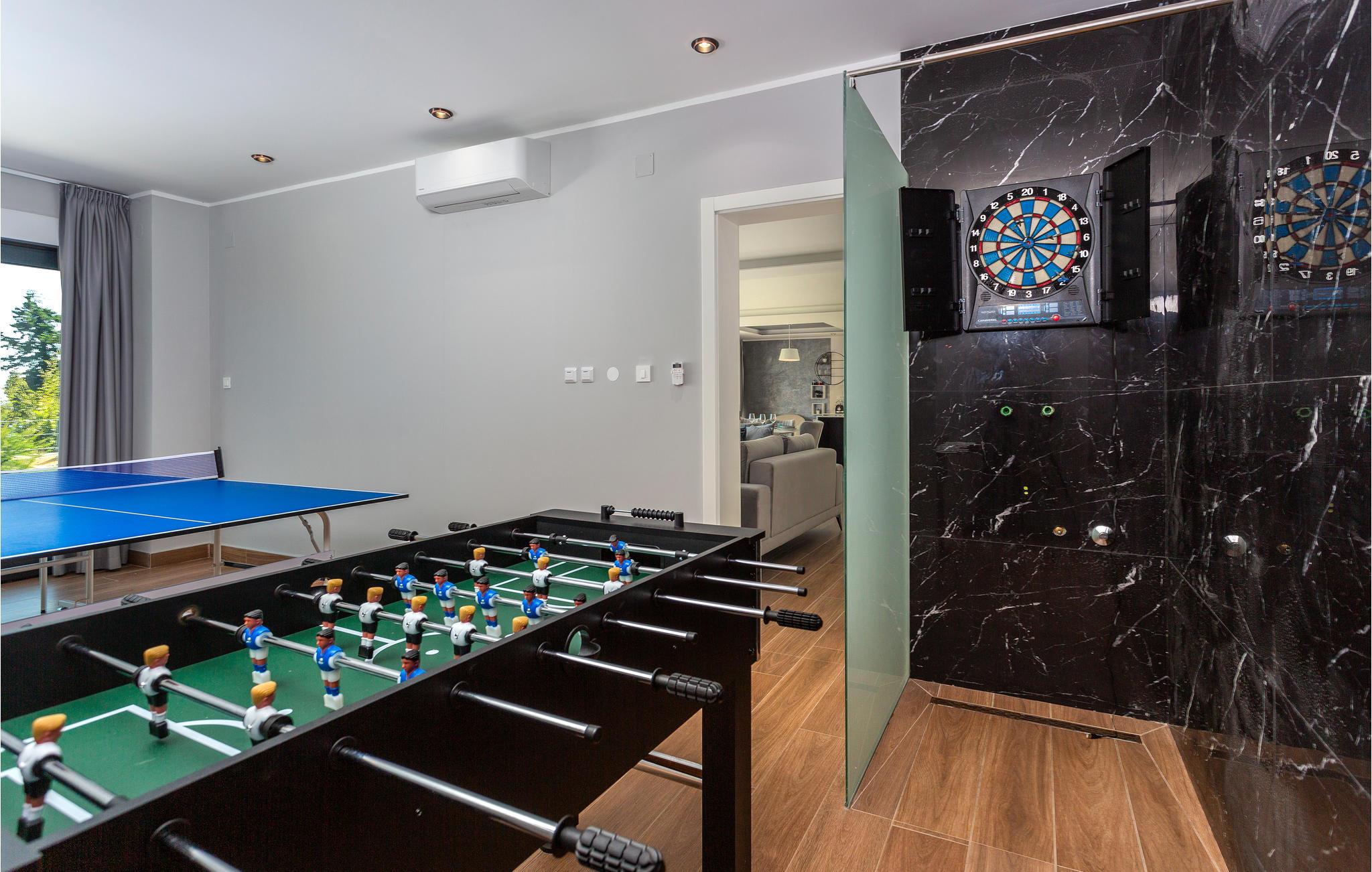 Velkommen til dette skønne og moderne hus med pool og aktivitetsrum. Sammen med jeres udvidede familie eller par kan I trives her og nyde omgivelserne med design, møbler af høj kvalitet og masser af plads. Forkæl jer selv med en pause på de to etager og nyd at være sammen, mens I laver mad eller slapper af i stuen. I kan frit vælge, om I vil bruge jeres fritid i haven ved poolen eller nyde et afslappende solbad med en vidunderlig udsigt på tagterrassen. Mens I slapper af, kan børnene boltre sig og udfordre sig selv i aktivitetsrummet.