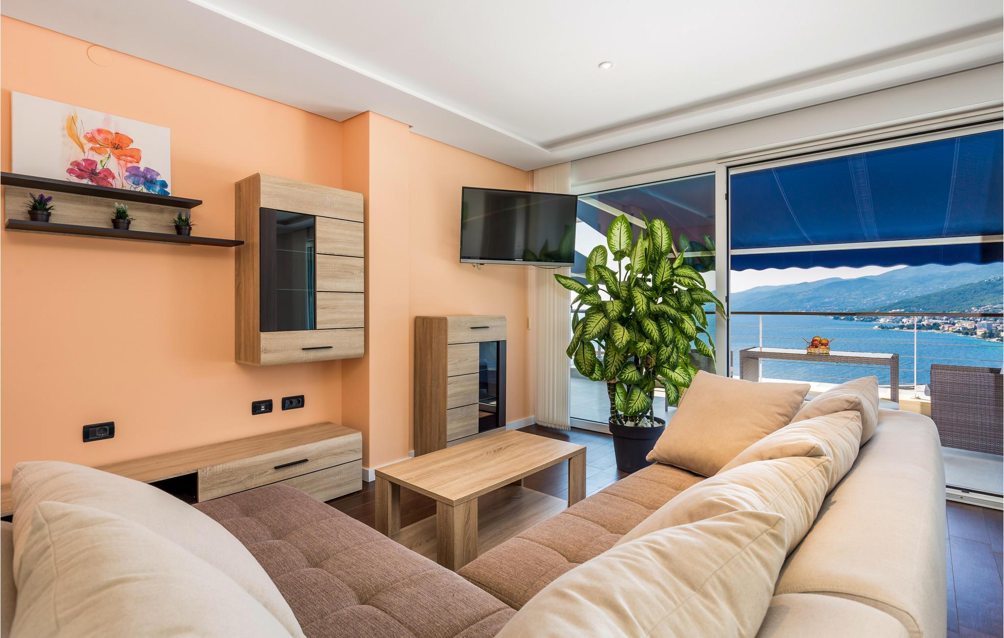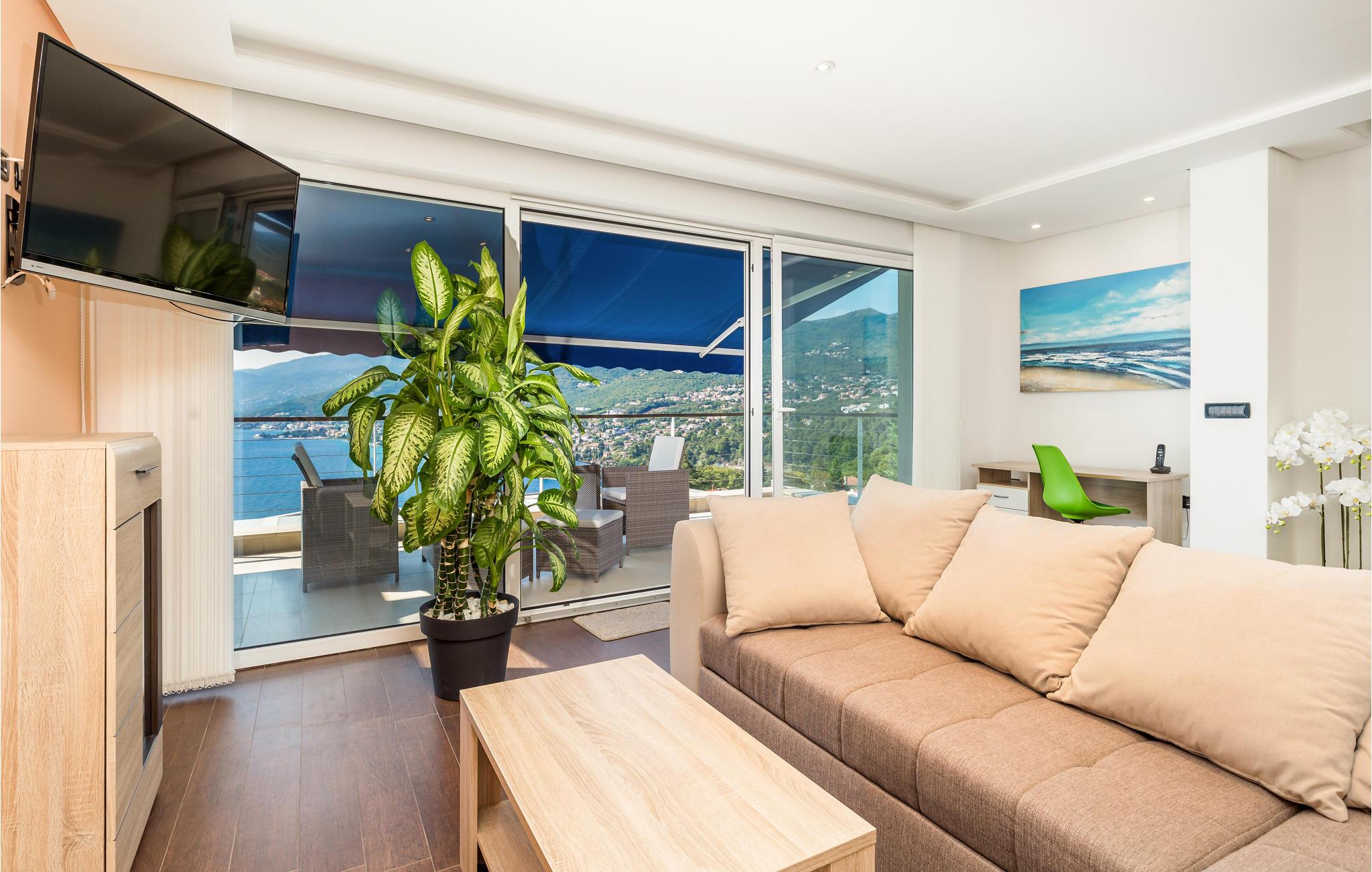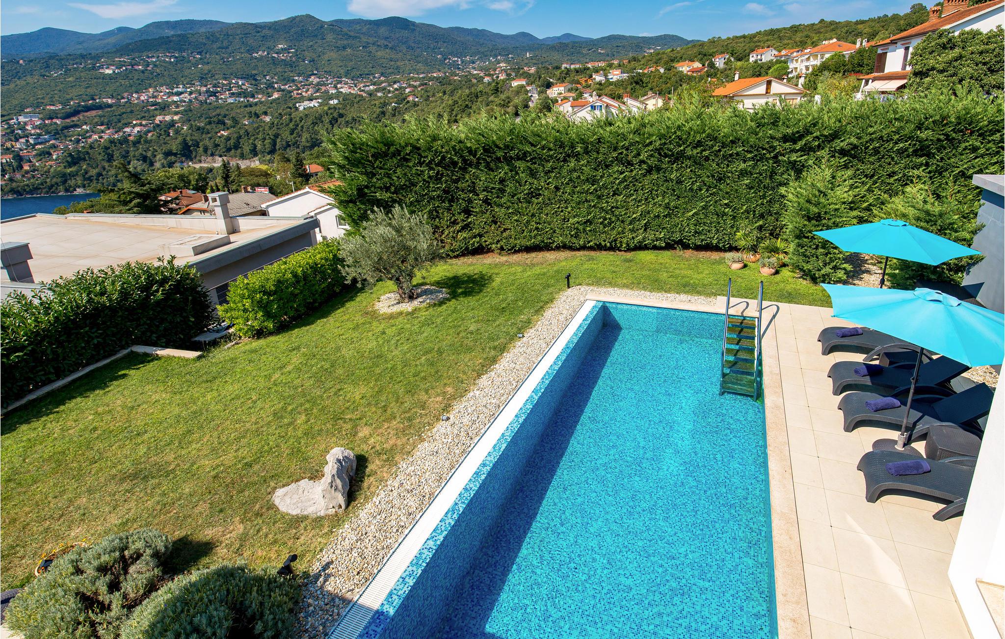 Det ligger over Kvarner-bugten mellem Opatija og Rijeka med en vidunderlig panoramaudsigt over havet. I vil også blive imponeret af det velholdte udendørs område med middelhavsplanter og grillen, der nødig skal mangle til sommeraftenen. Der er to overdækkede og tre åbne parkeringspladser på ejendommen. Huset består af tre boenheder. I stueetagen er en rummelig stue med køkken, to soveværelser og to badeværelser. Eksterne trapper fører til de øverste lejligheder med separate indgange og et soveværelse, badeværelse, stue med køkken og vidunderlige altaner med udsigt over havet og det omkringliggende område.