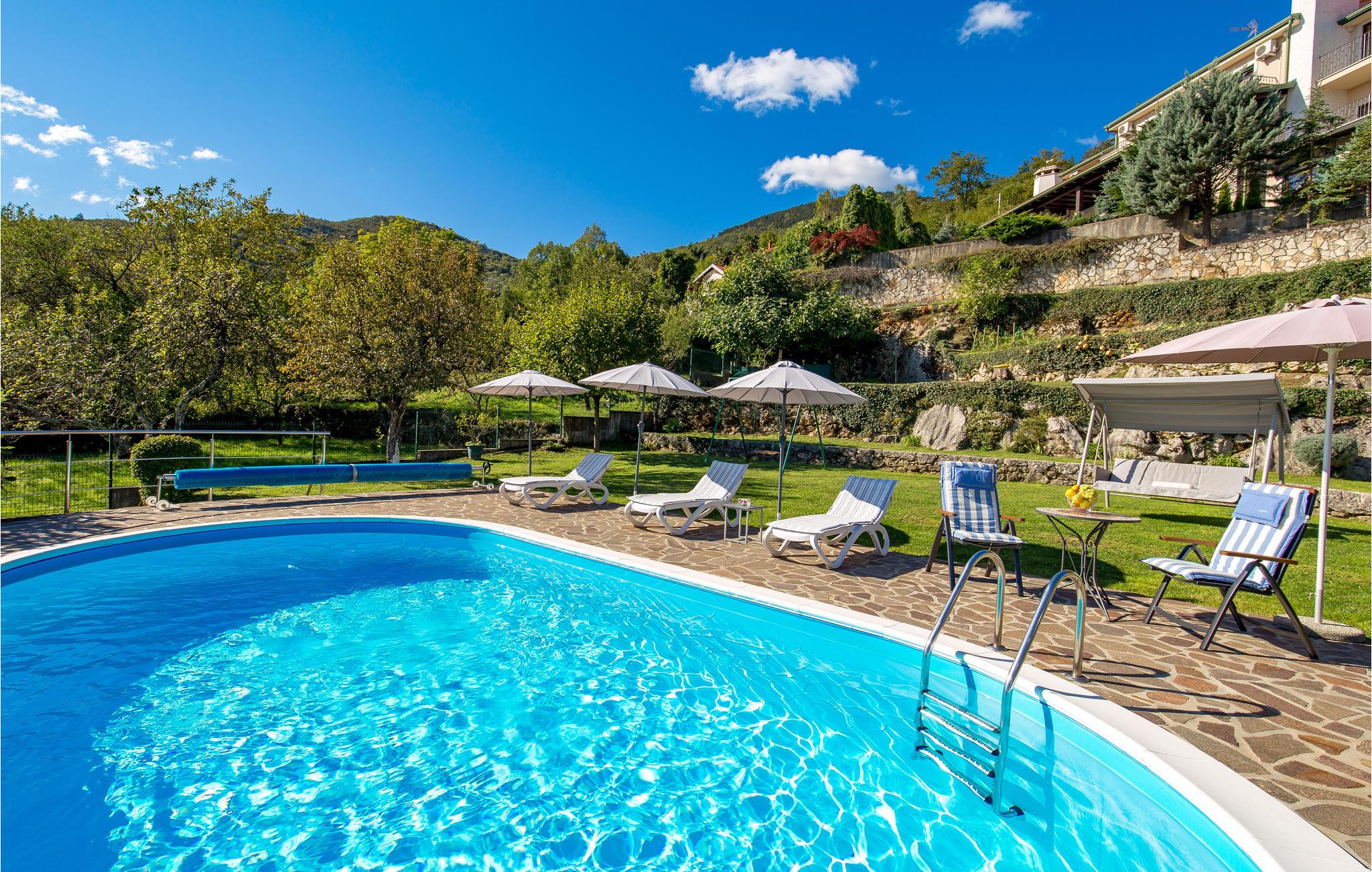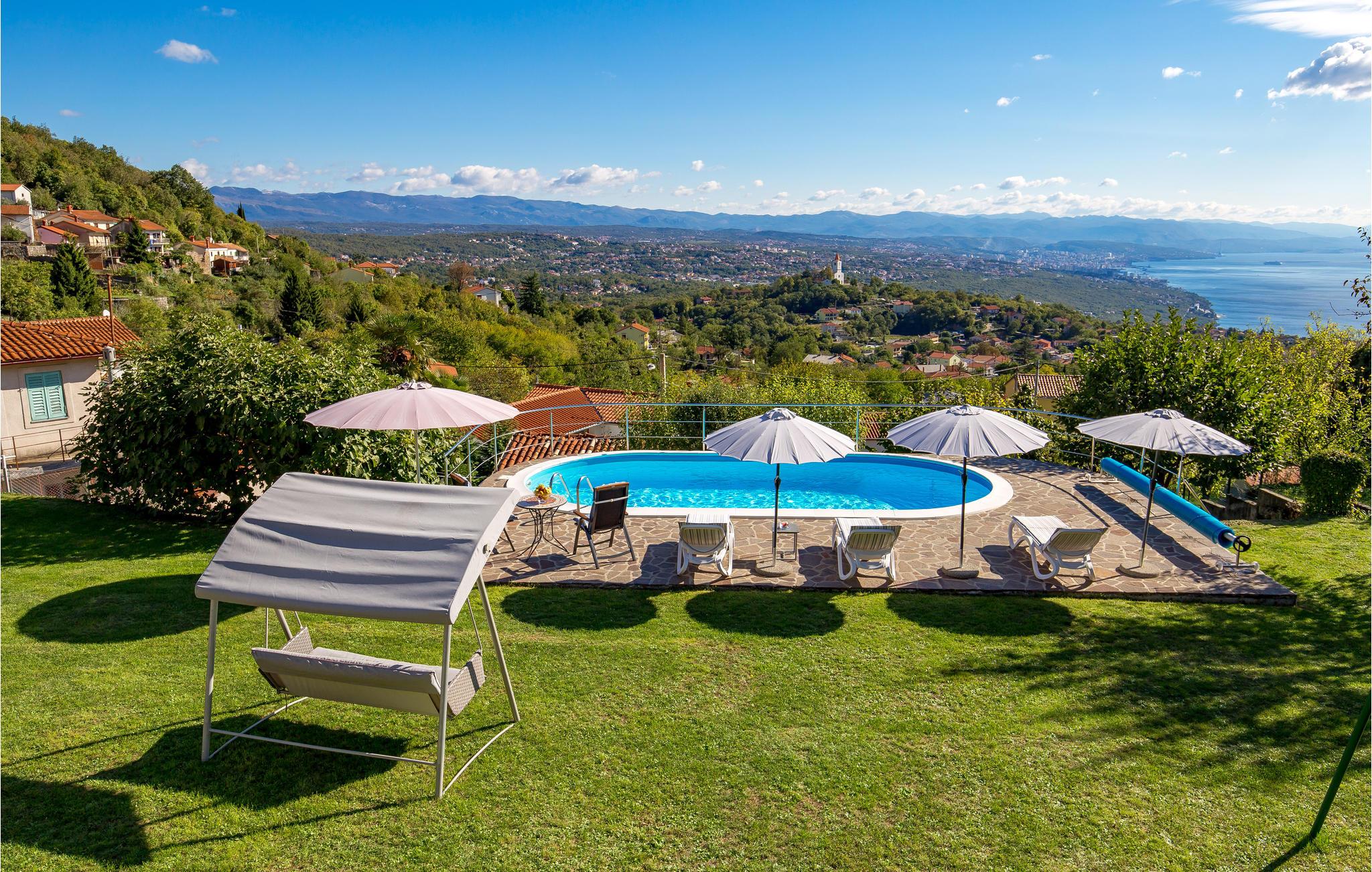 Dette feriehus ligger på skråningerne af Ucka, nord for Opatija. Her kan I se frem til grønne og rolige omgivelser med en unik udsigt til Kvarner-bugten og byen Rijeka. En rummelig, helt lukket have med swimmingpool og stort solbadningsområde giver absolut sikkerhed for jeres børn og et kæledyr. Noget af det særlige ved ejendommen er, at her bliver dyrket økologiske grøntsager og frugter, så I kan spise rå eller lave til forskellige lækre retter.