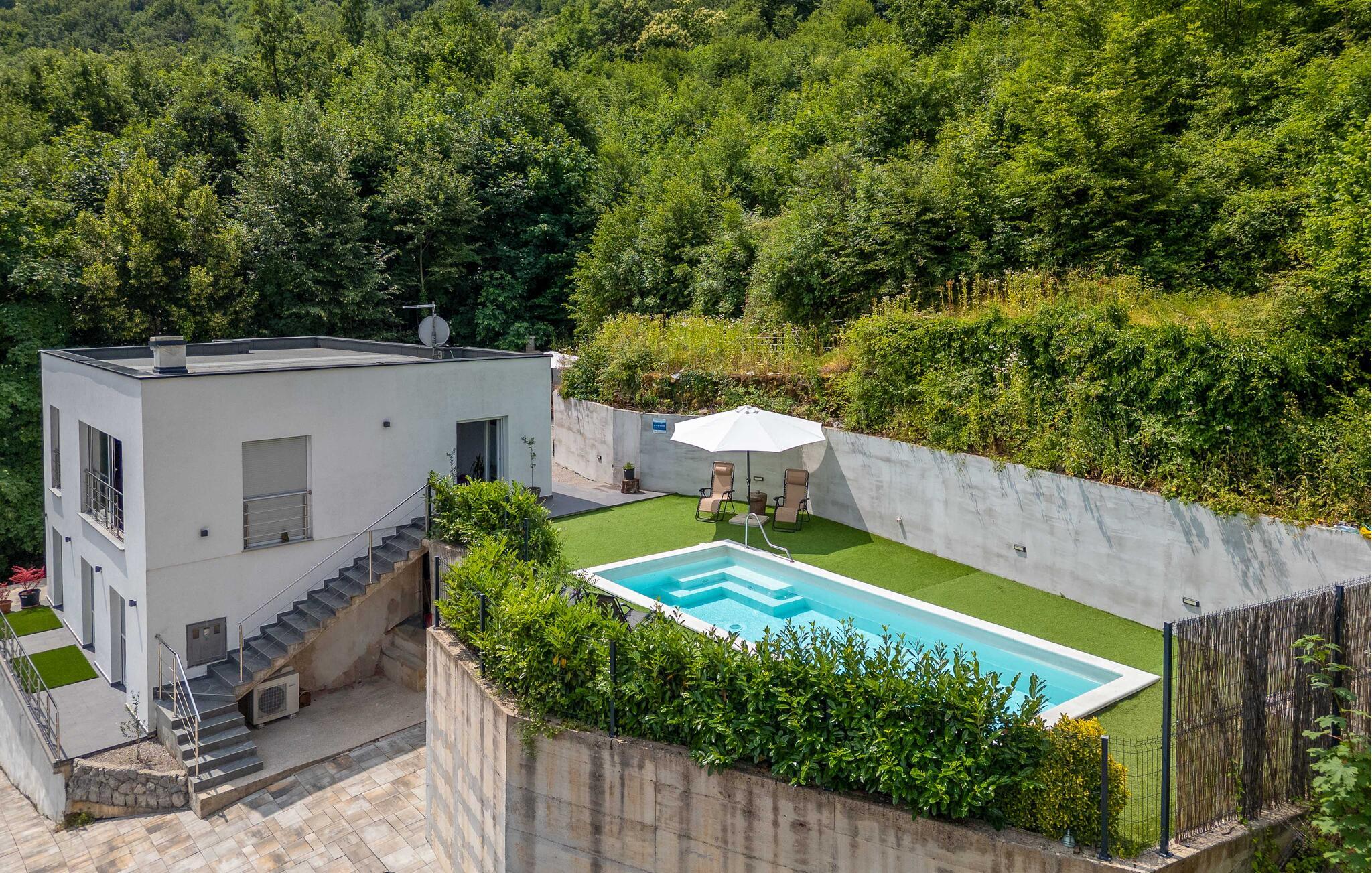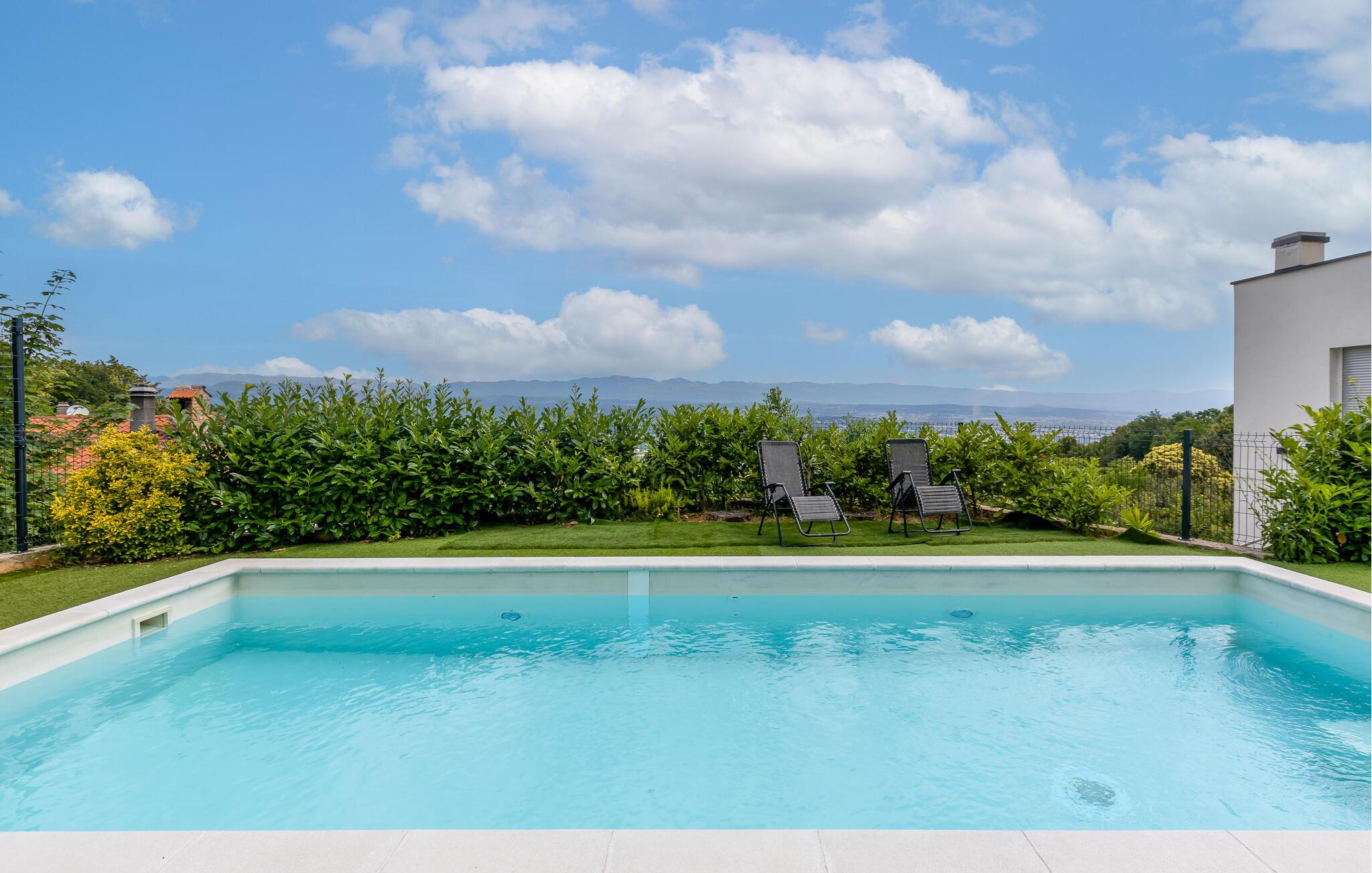 Dette fantastisk beliggende feriehus ligger i Opatija Rivieras bakkede bagland. Et interiør af høj kvalitet venter jer indenfor, som gør et moderne indtryk og giver de optimale rammer for afslapning og velvære. Fremtryl jeres yndlingsretter sammen i det store køkken og tilbring hyggelige timer omkring spisebordet med udsigt til omgivelserne.