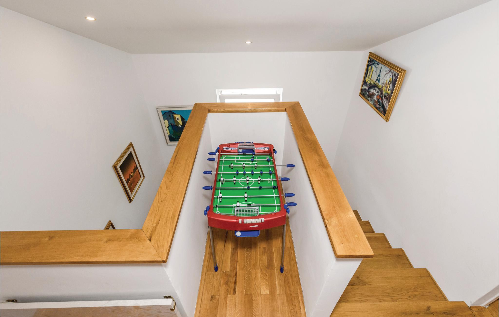 Den er ideelt egnet til en ferie for flere familier. Huset fordeler sig på 1. sal og loftsetagen, som er forbundet med en ydre trappe. Den øverste etages laveste loftshøjde er 120 cm. Huset har et stort køkken, hvor I kan være mange i gang samtidigt om at tilberede lækre feriemåltider. Bag huset er der en udendørspool, hvor I tilbringe timevis med masser af badesjov, samt en havepavillon, hvor I kan sidde hyggeligt sammen og nyde et glas lokal vin. Desuden kan I konkurrere i bordtennis og bordfodbold.