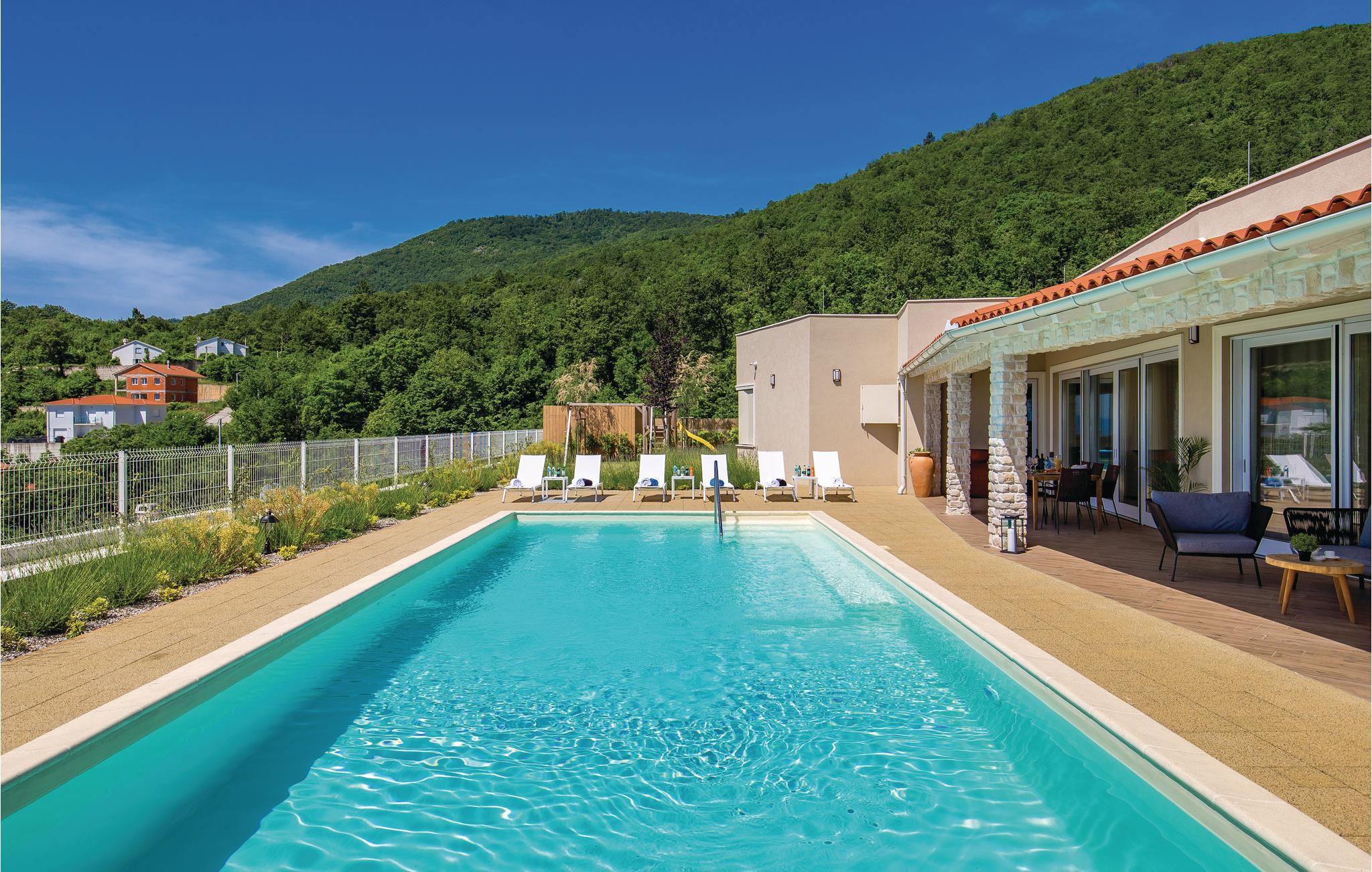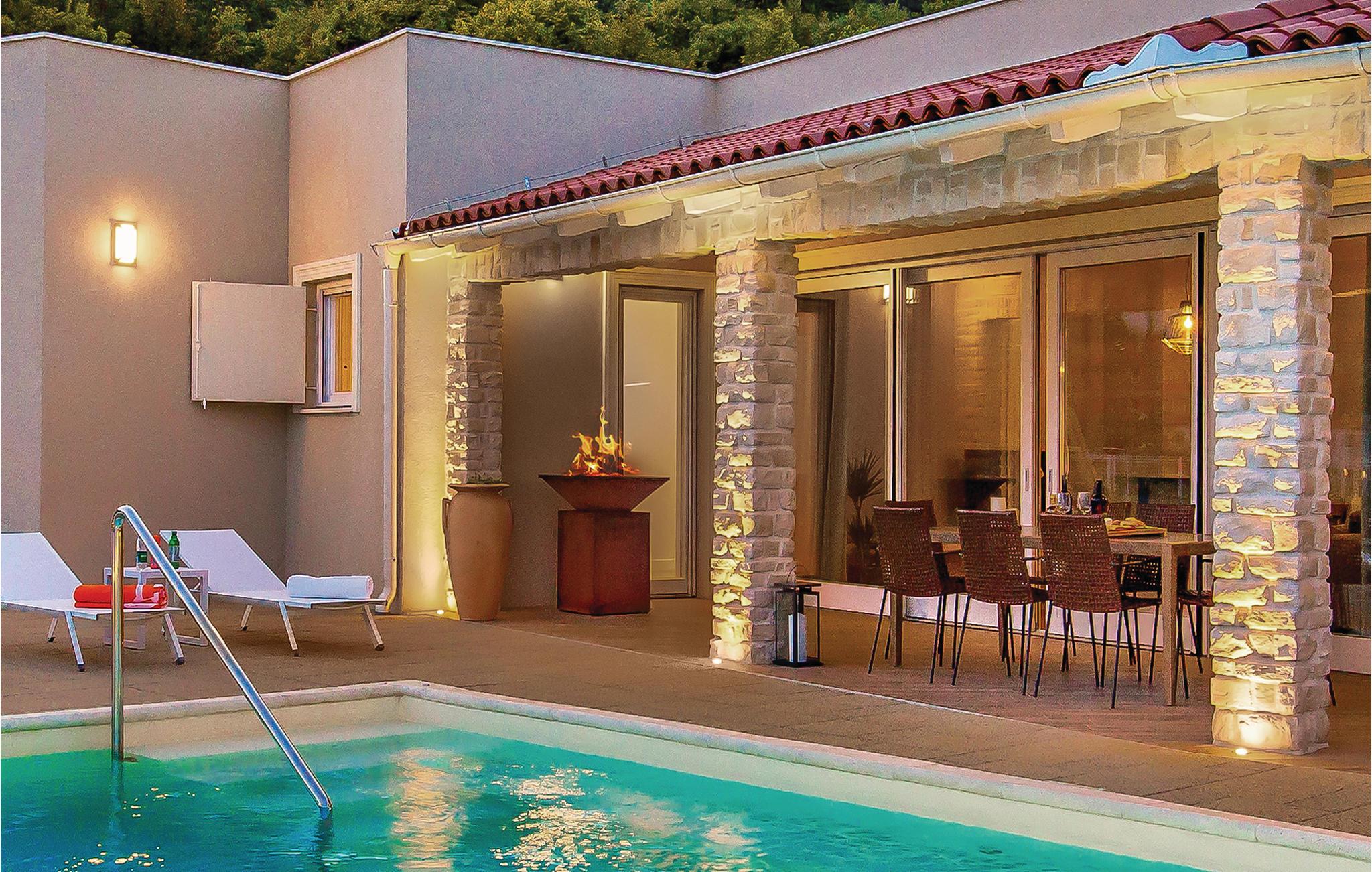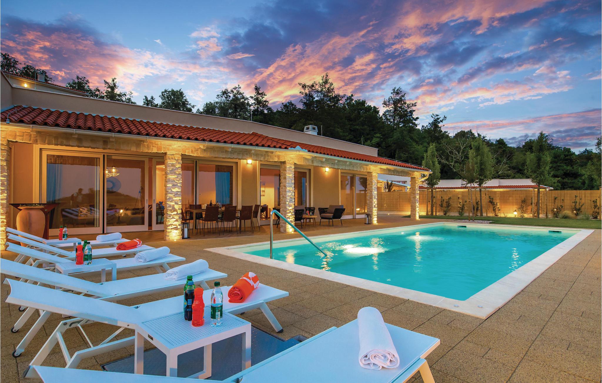 I dette boliganlæg med rummelige og veludstyrede villaer med private pools i Veprinac, ligger dette skønne feriehus med herlig havudsigt. Indvendigt er der rigtig god plads, med opholdsstue, spisestue med køkken. Herfra er der adgang til have og pool samt overdækket terrasse, hvor I sandsynligvis vil tilbringe mange timer på de varme sommerdage. Der hører endda et aktivitetsrum til huset asamt fitnessområde, en sauna samt vinkælder.