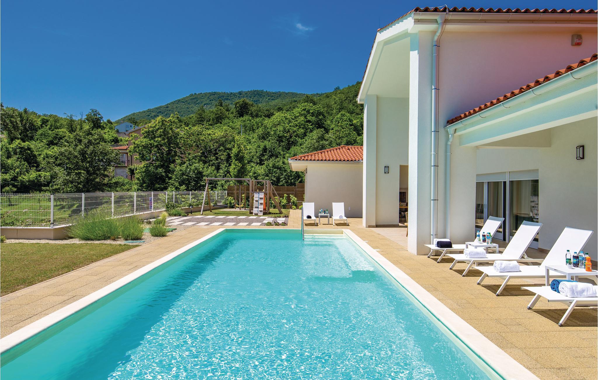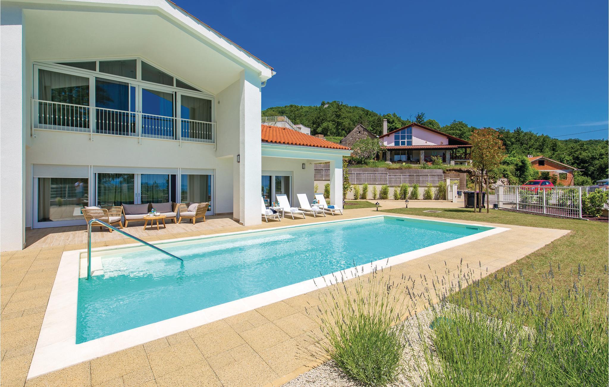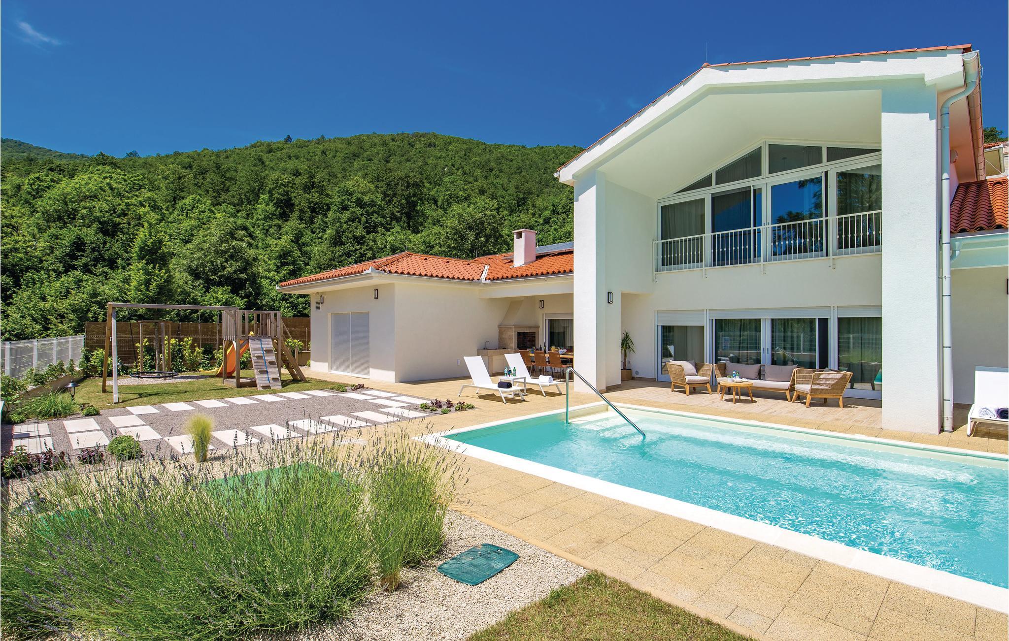 Denne skønne villa med pool er en af fem villaer som ligger i en lille klynge lige ved Ucka bjergets fod, og hævet over Opatijas Riviera. Den enestående beliggenhed gør at der er en skøn udsigt til Kvarner bugtens blå hav, og at der kun er få minutter til strandene, forlystelserne, og ikke mindst områdets gode restauranter. Samtidig er der roligt og I mærker ikke noget til feriehektikken nede ved kysten. Naturparken Ucka er den nærmeste nabo her og det betyder at luften er dejlig frisk om natten, den er endda kendt for at være beriget med jod og salt.