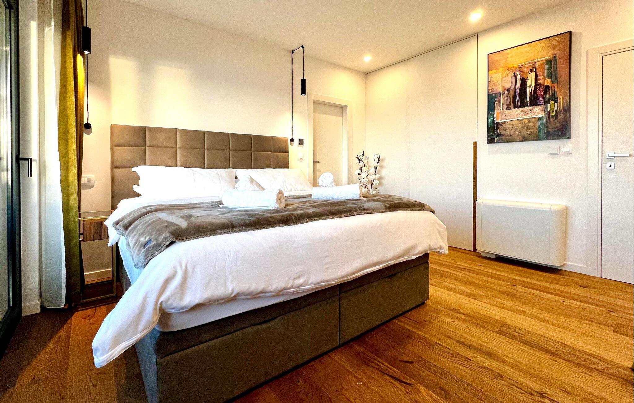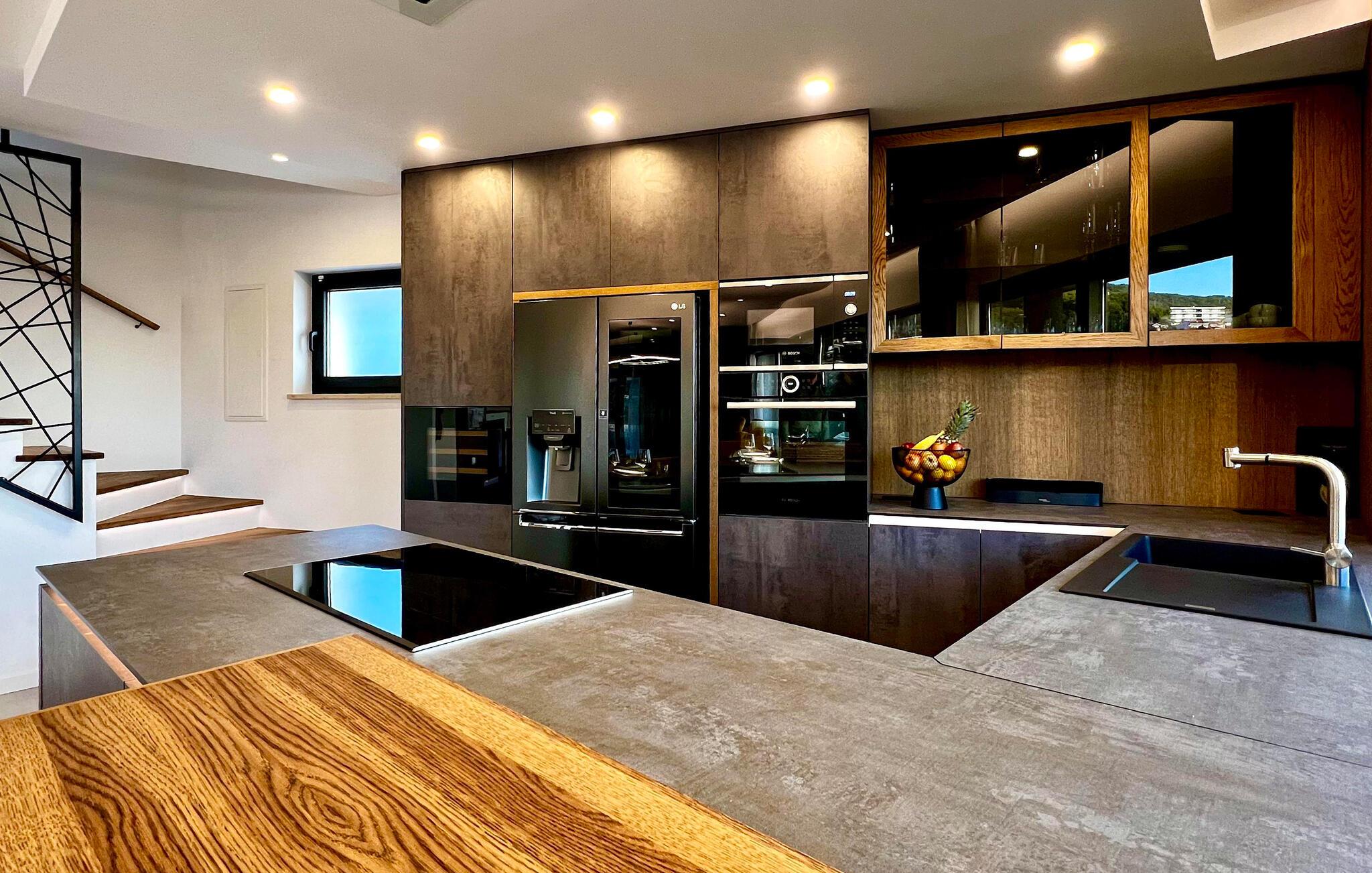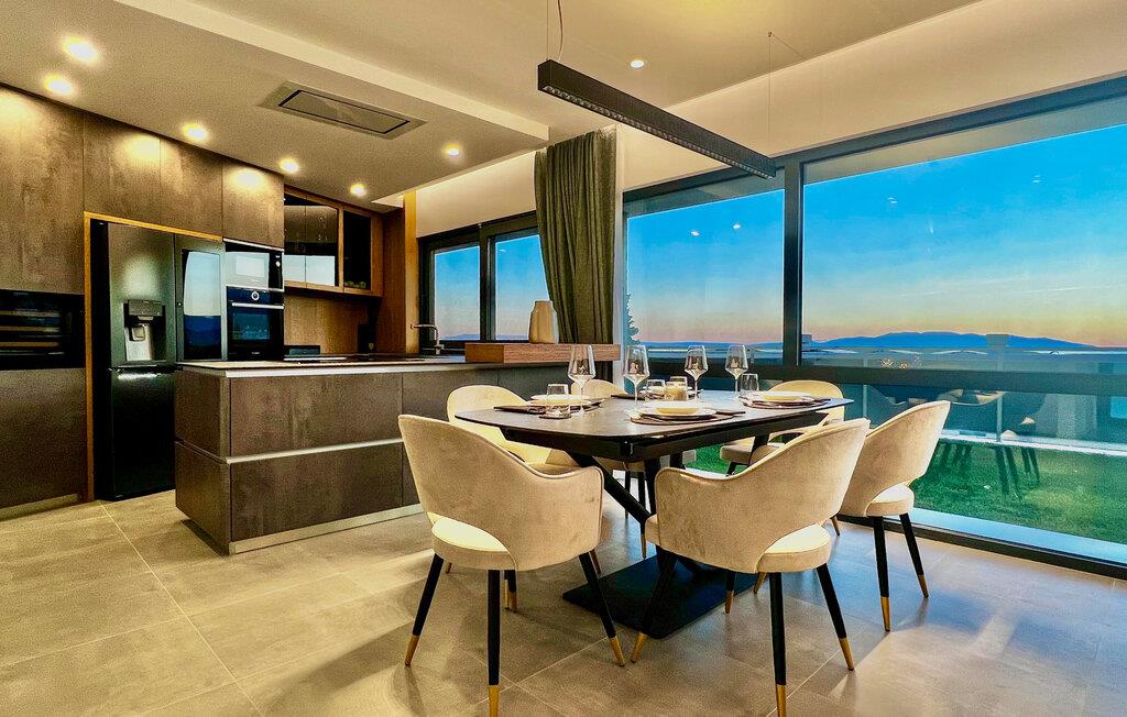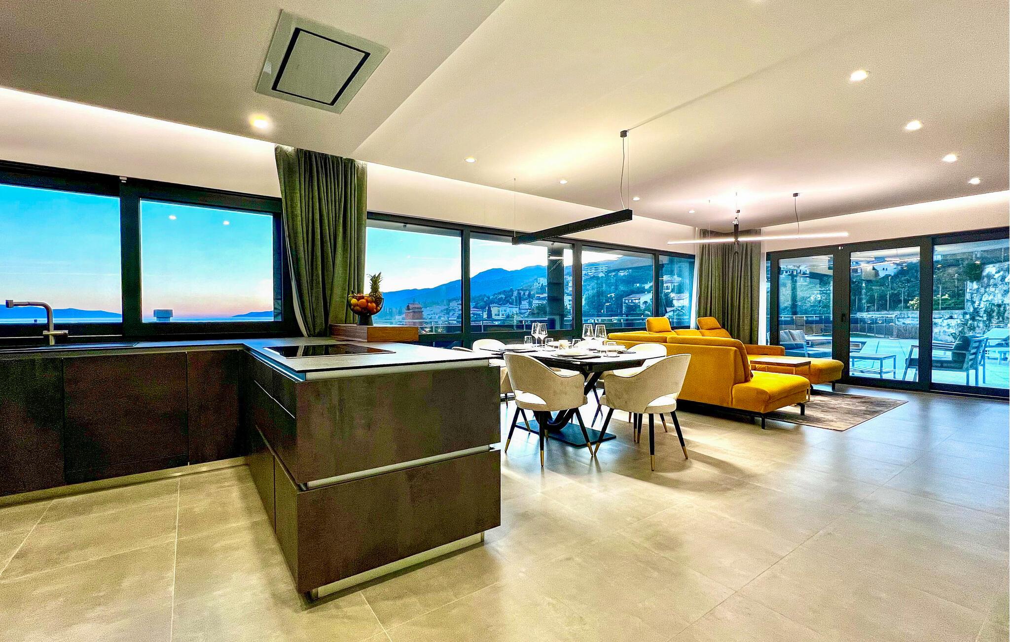 Denne exceptionelle luksusejendom forkæler jer med et stilfuldt interiør af høj kvalitet og en fantastisk panoramaudsigt over havet. Fremtryll kulinariske højdepunkter i det moderne køkken, og nyd måltiderne i den åbne opholdsstue, hvor store vinduer giver masser af naturligt lys. Om aftenen fremhæves de smagfulde møbler af varmt lys – lad brændeovnen sørge for ekstra hygge, mens I slapper af i sofaen.