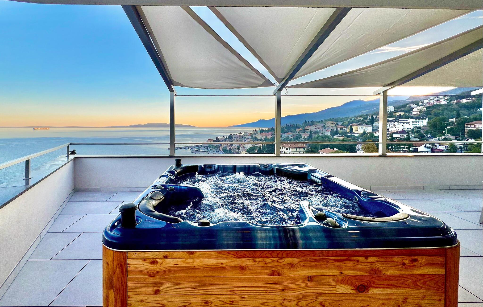 Nyd privatlivet på den afsondrede poolterrasse – Begynd dagene med morgenmad udendørs og glæd jer til timevis af solbadning. Forkæl jer selv med afslappende øjeblikke i spabadet på den panoramiske terrasse og nyd delikatesser fra grillen.