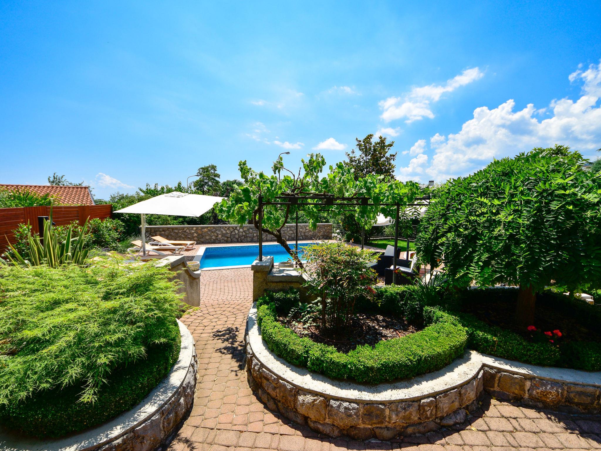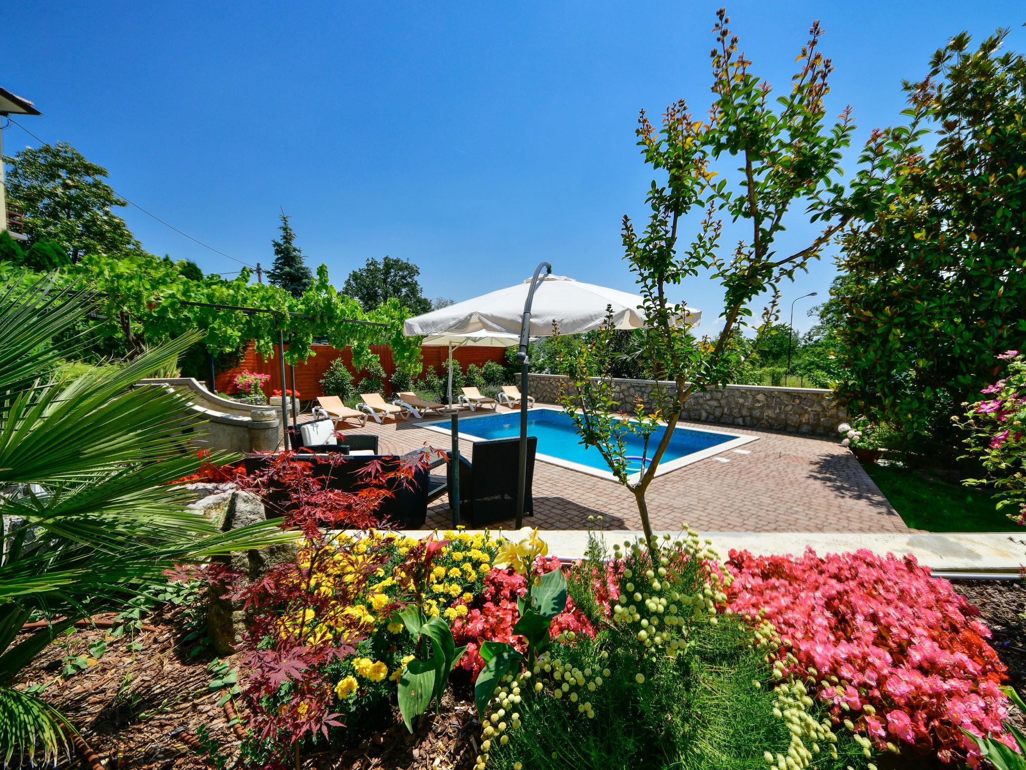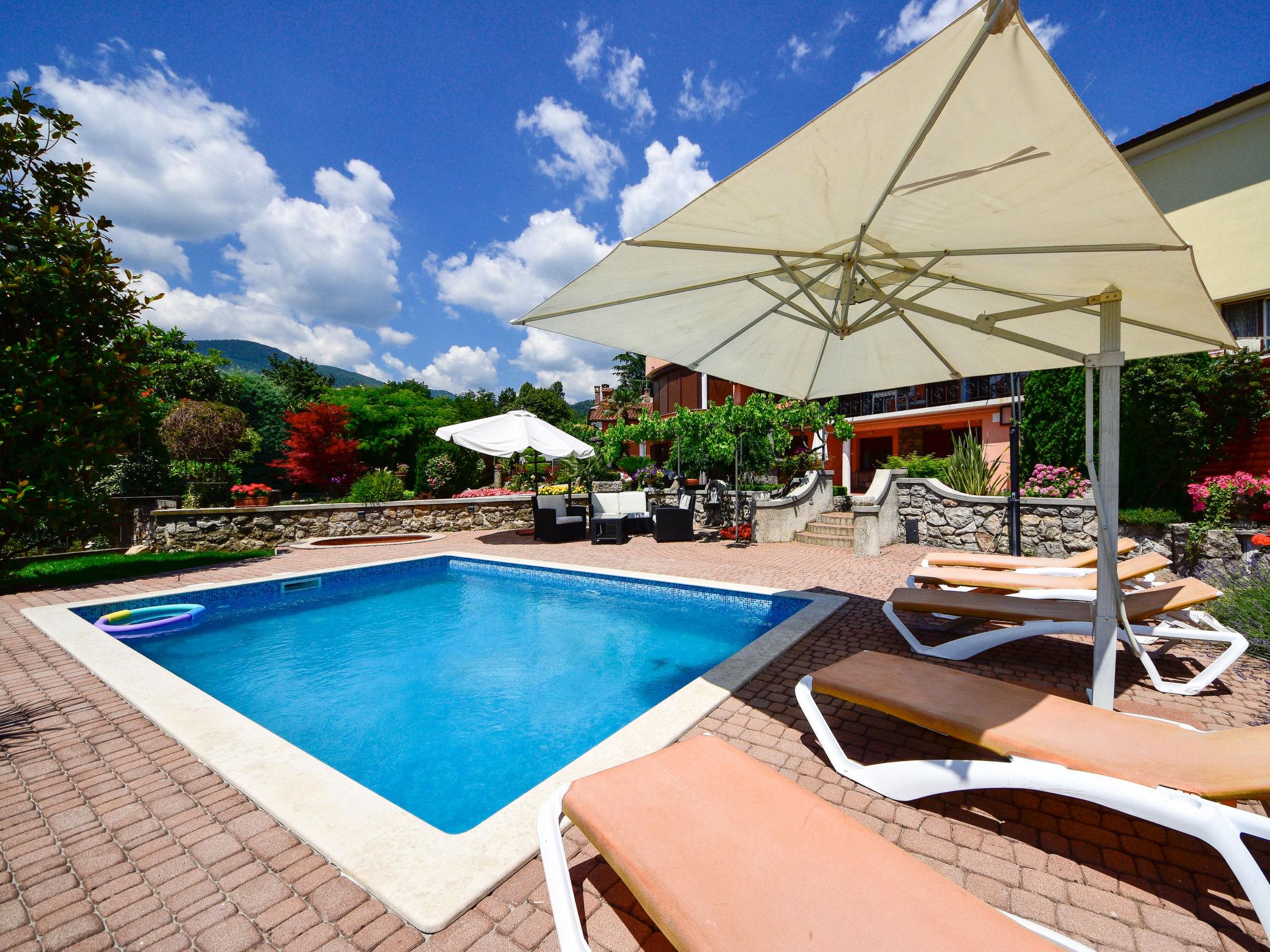 Matulji: Apartment house "Lidija". 800 m from the centre of Matulji, 5.5 km from the centre of Opatija, in a sunny position, 3.5 km from the sea, 3.5 km from the beach. For shared use: property 1'200 m2. Private: property 400 m2, garden with wildlife garden and flowers, swimming pool angular (6 x 4 m, depth 140 cm, seasonal availability: 27.Apr. - 12.Oct.). Paddling pool, outdoor shower, terrace (50 m2), garden furniture, barbecue. In the house: internet access. Parking (for 3 cars) at the house on the premises. Shop 800 m, supermarket 1.4 km, restaurant 800 m, bus stop 260 m, pebble beach 3.5 km, concrete beach 3.5 km.