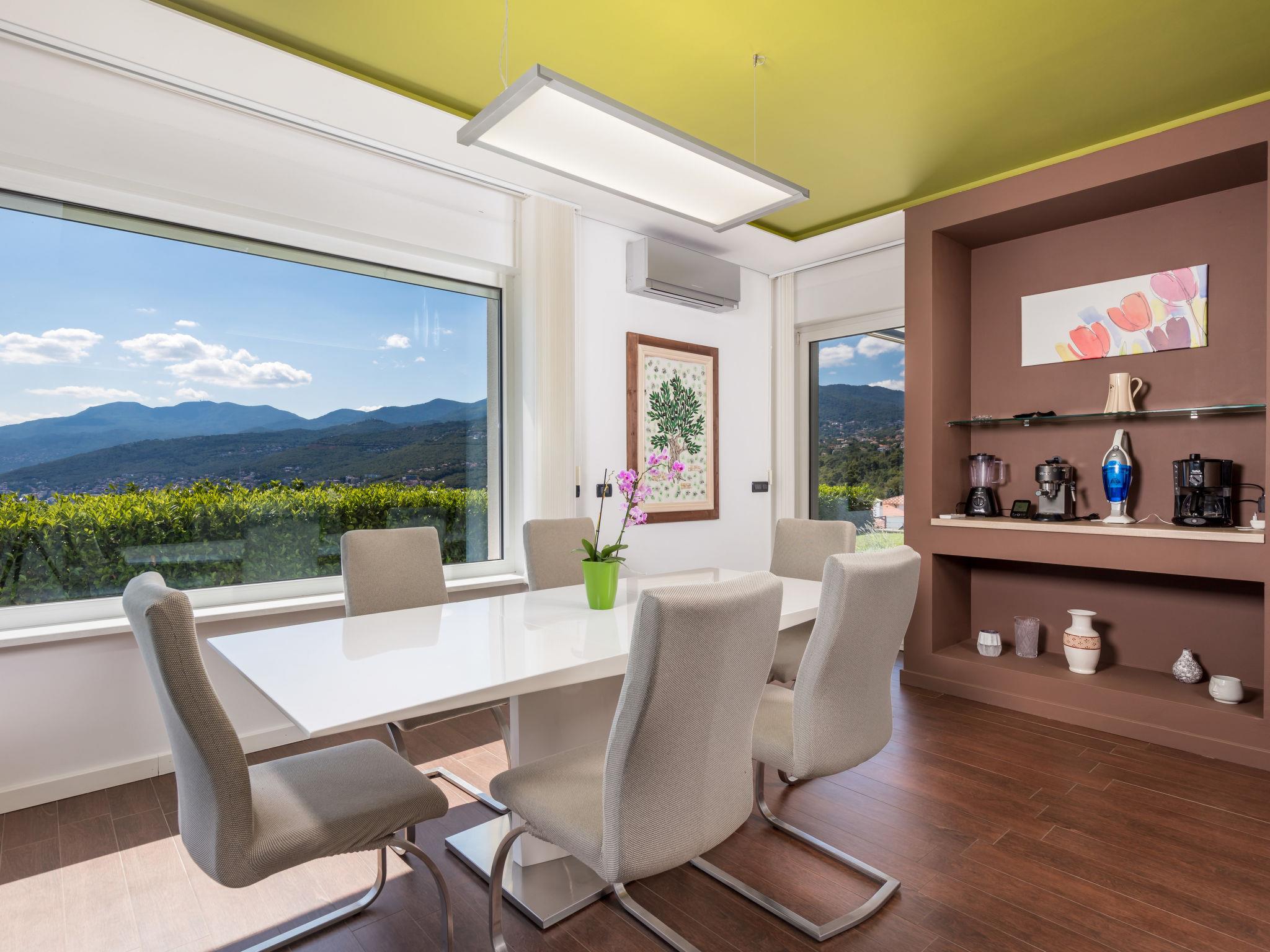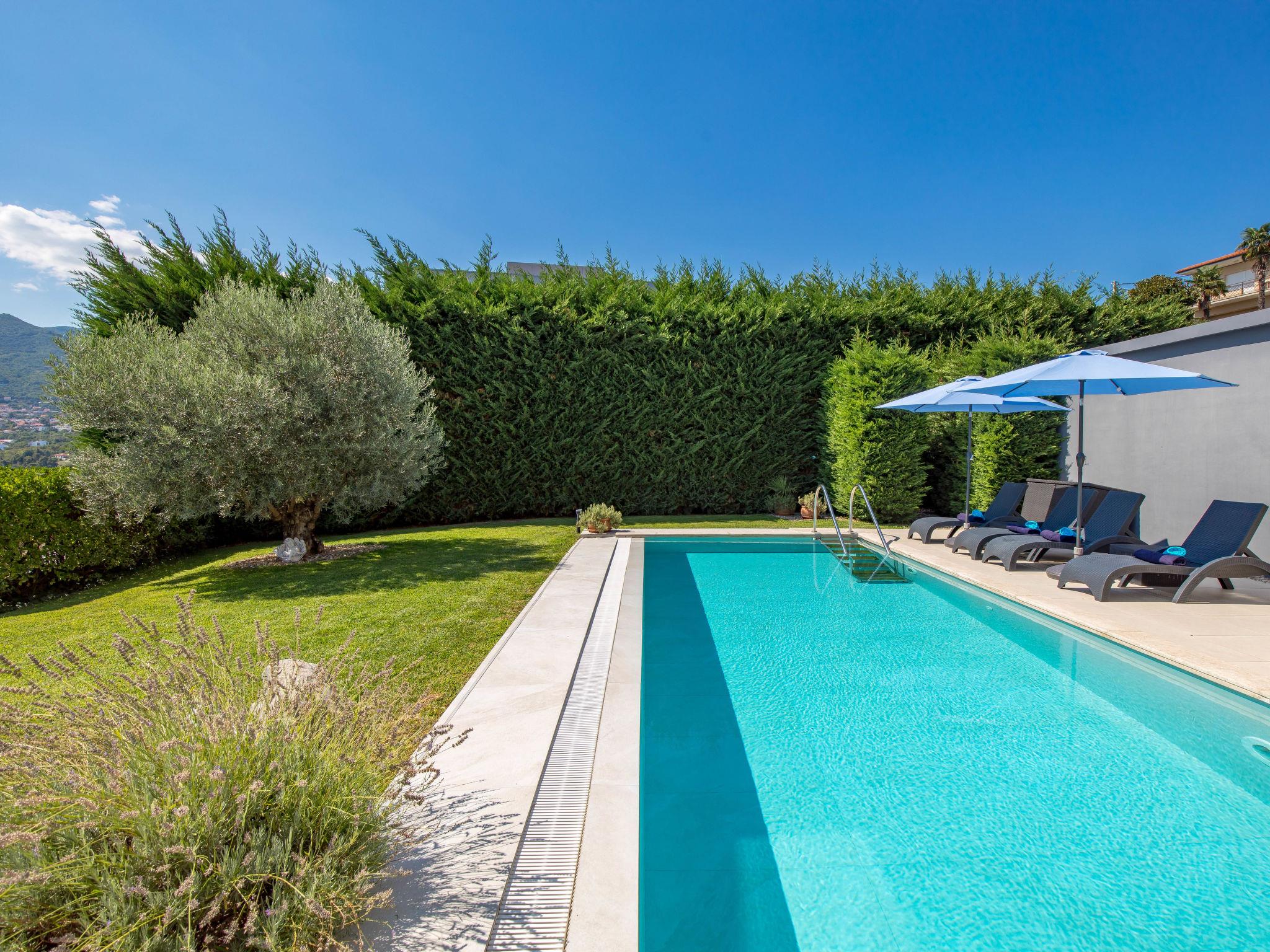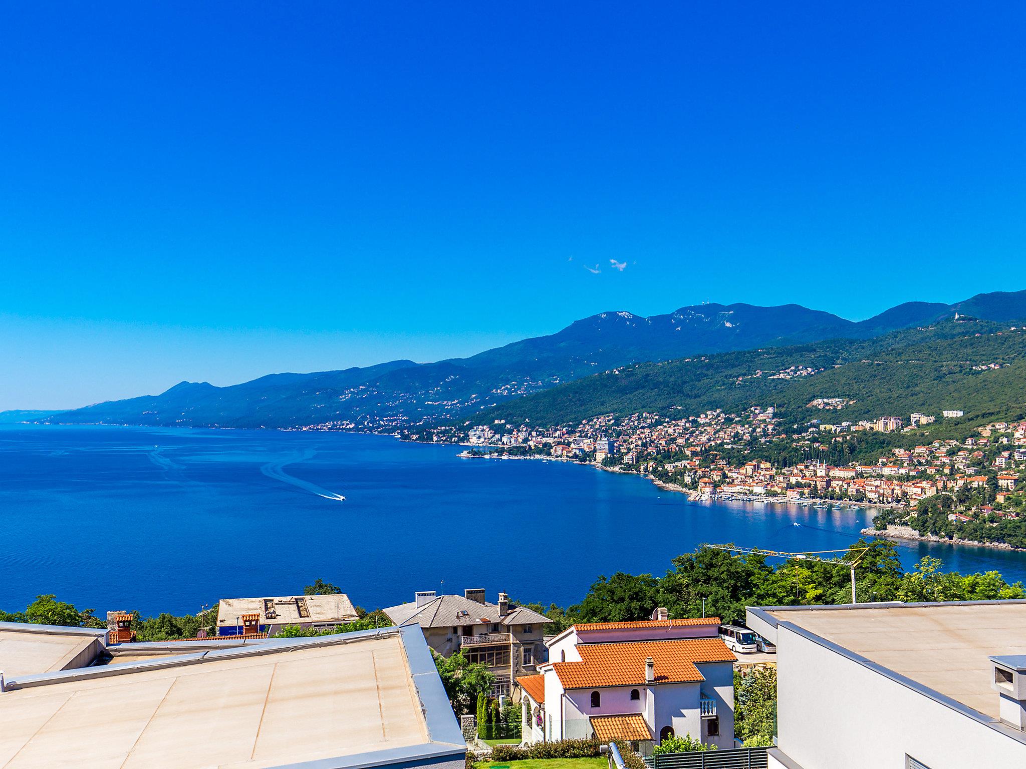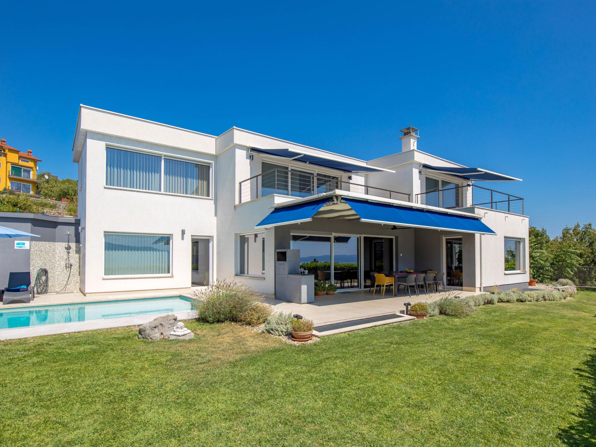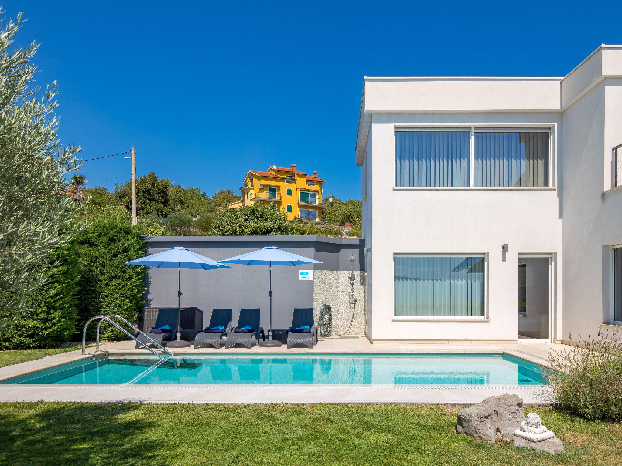 Matulji: Modern, beautiful villa "Vista", 2 storeys. 1.7 km from the centre of Matulji, 3.5 km from the centre of Opatija, in a quiet, sunny, elevated position, 2.5 km from the sea, 2.5 km from the beach, in a cul-de-sac. Private: property 1'050 m2 (fenced), lawn 300 m2, swimming pool angular (32 m2, depth 150 - 160 cm, seasonal availability: 21.May. - 15.Sep.). Outdoor shower, barbecue. In the house: internet access, washing machine, tumble dryer. Parking (for 6 cars) at the house on the premises. Shop, supermarket 700 m, restaurant 2 km, bus stop 400 m, pebble beach 2.5 km, concrete beach 2.5 km. Walking paths from the house 2 km. Please note: suitable for families. The owner does not accept any youth groups. Neighbourhood highly sensitive to noise. Quietness and good behaviour expected. Organizing a party is not allowed. The house consists of 3 apartments rented as one unit: one apartment on the ground floor and two apartments on the first floor.