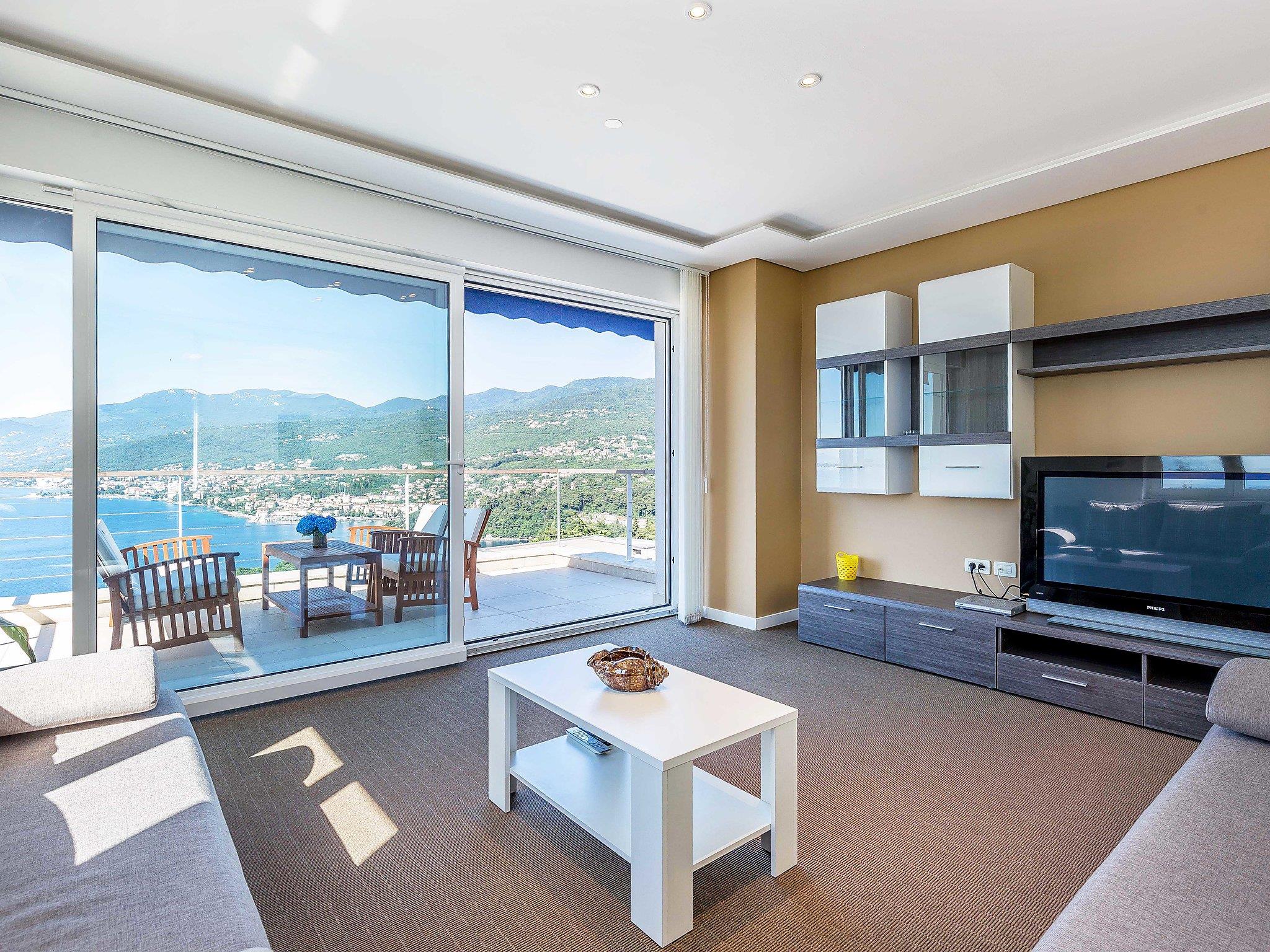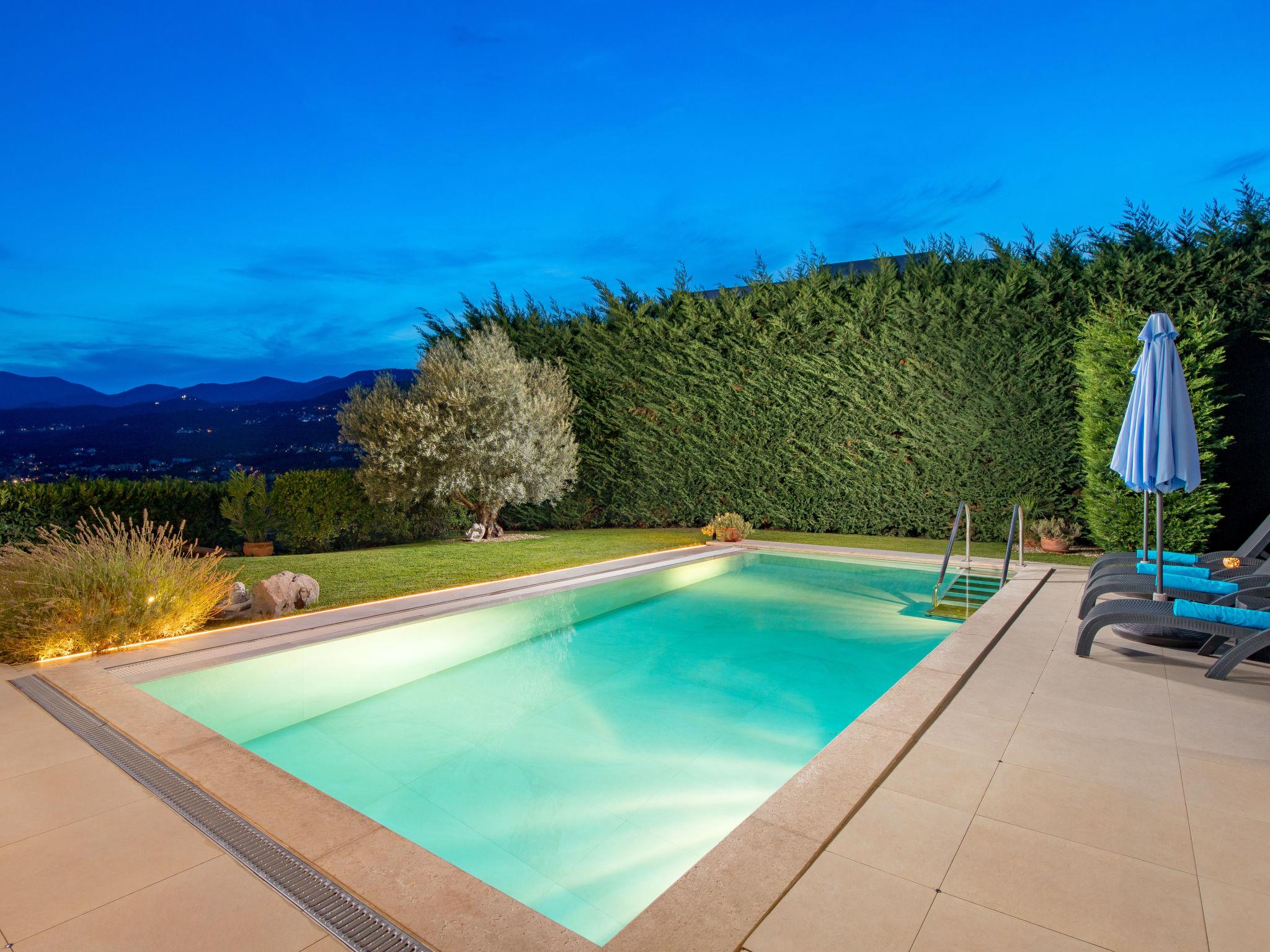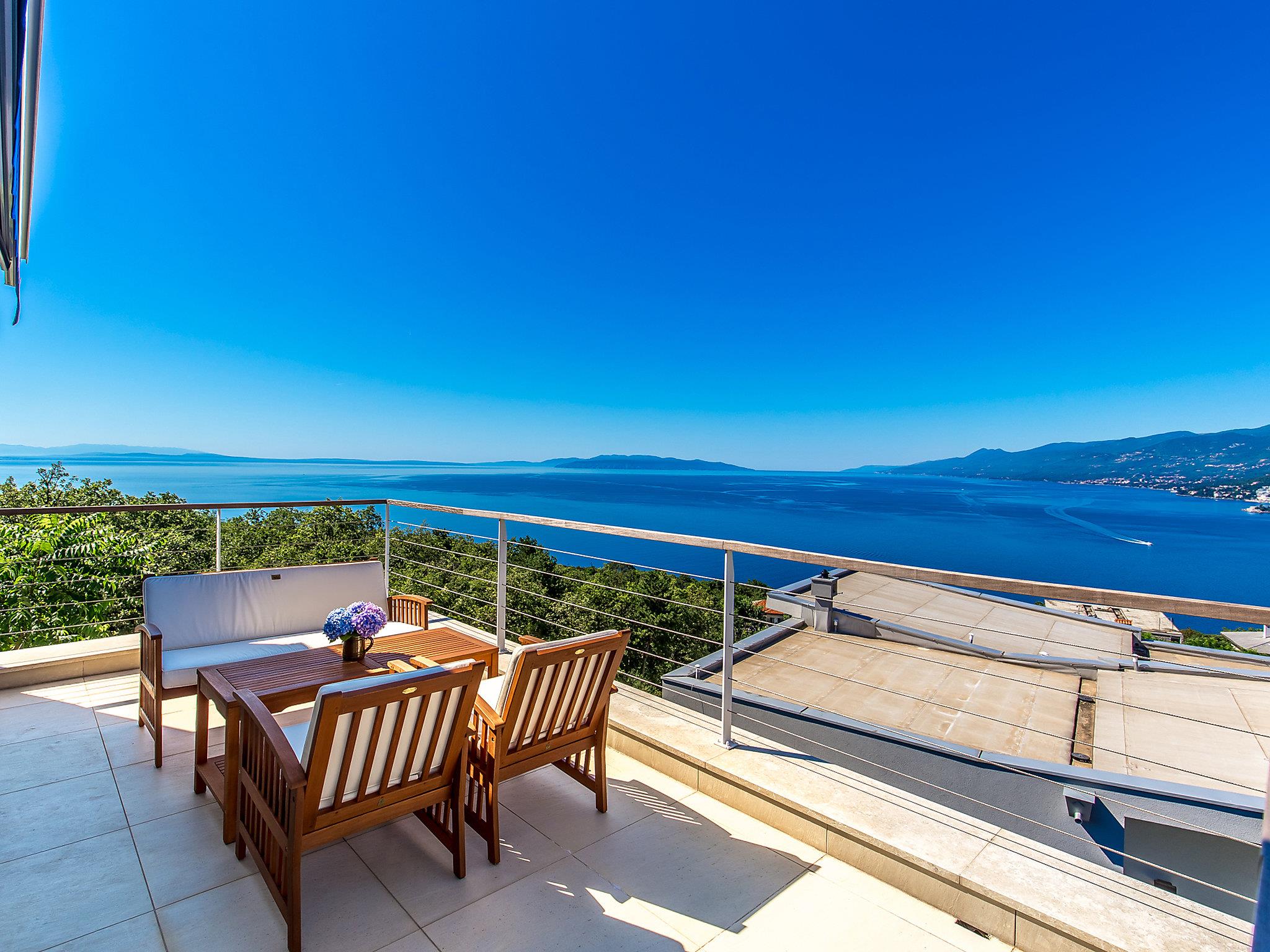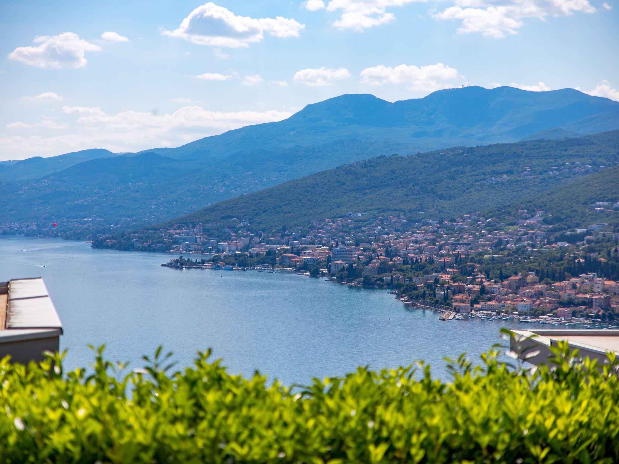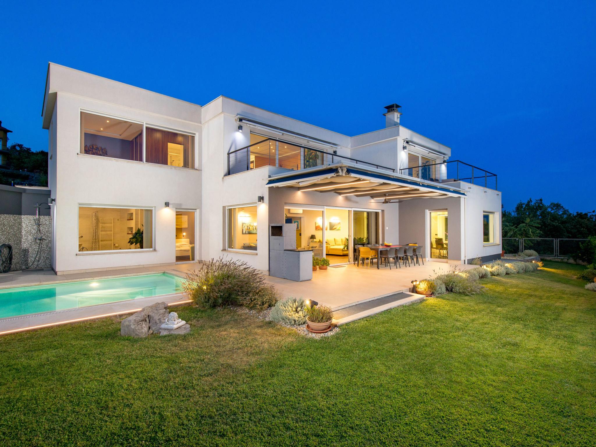 Matulji: Modern, beautiful villa "Vista", 2 storeys. 1.7 km from the centre of Matulji, 3.5 km from the centre of Opatija, in a quiet, sunny, elevated position, 2.5 km from the sea, 2.5 km from the beach, in a cul-de-sac. Private: property 1'050 m2 (fenced), lawn 300 m2, swimming pool angular (32 m2, depth 150 - 160 cm, seasonal availability: 21.May. - 15.Sep.). Outdoor shower, barbecue. In the house: internet access, washing machine, tumble dryer. Parking (for 6 cars) at the house on the premises. Shop, supermarket 700 m, restaurant 2 km, bus stop 400 m, pebble beach 2.5 km, concrete beach 2.5 km. Walking paths from the house 2 km. Please note: suitable for families. The owner does not accept any youth groups. Neighbourhood highly sensitive to noise. Quietness and good behaviour expected. Organizing a party is not allowed. The house consists of 3 apartments rented as one unit: one apartment on the ground floor and two apartments on the first floor.