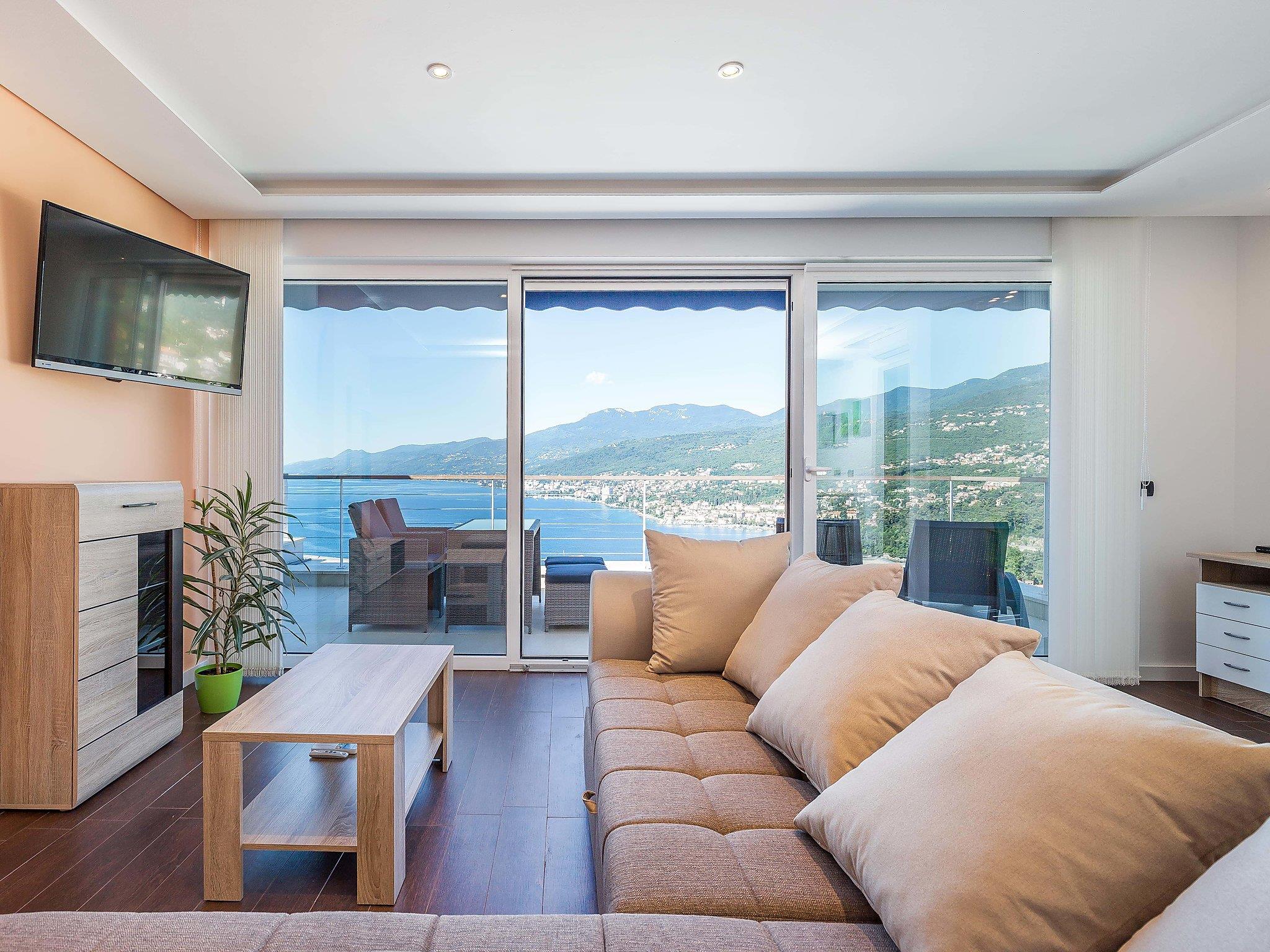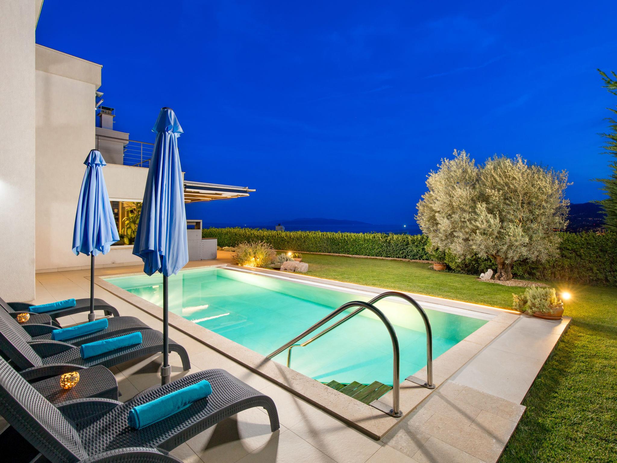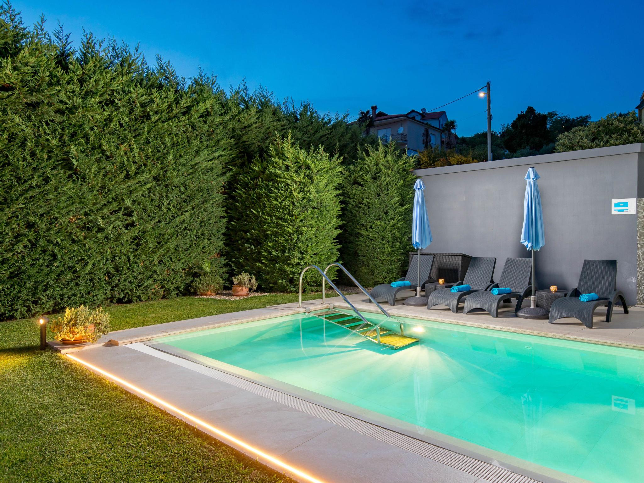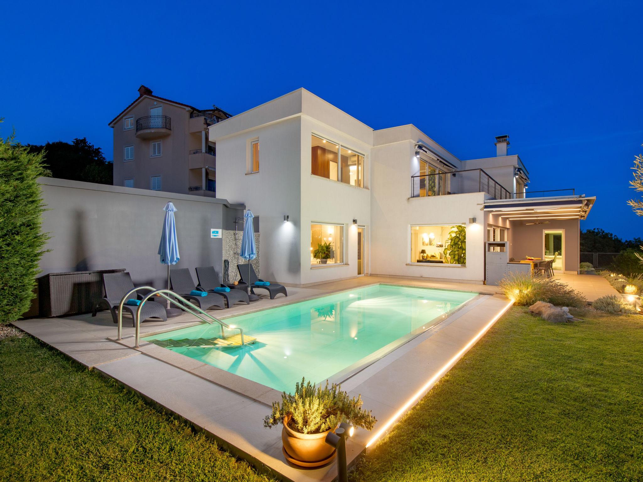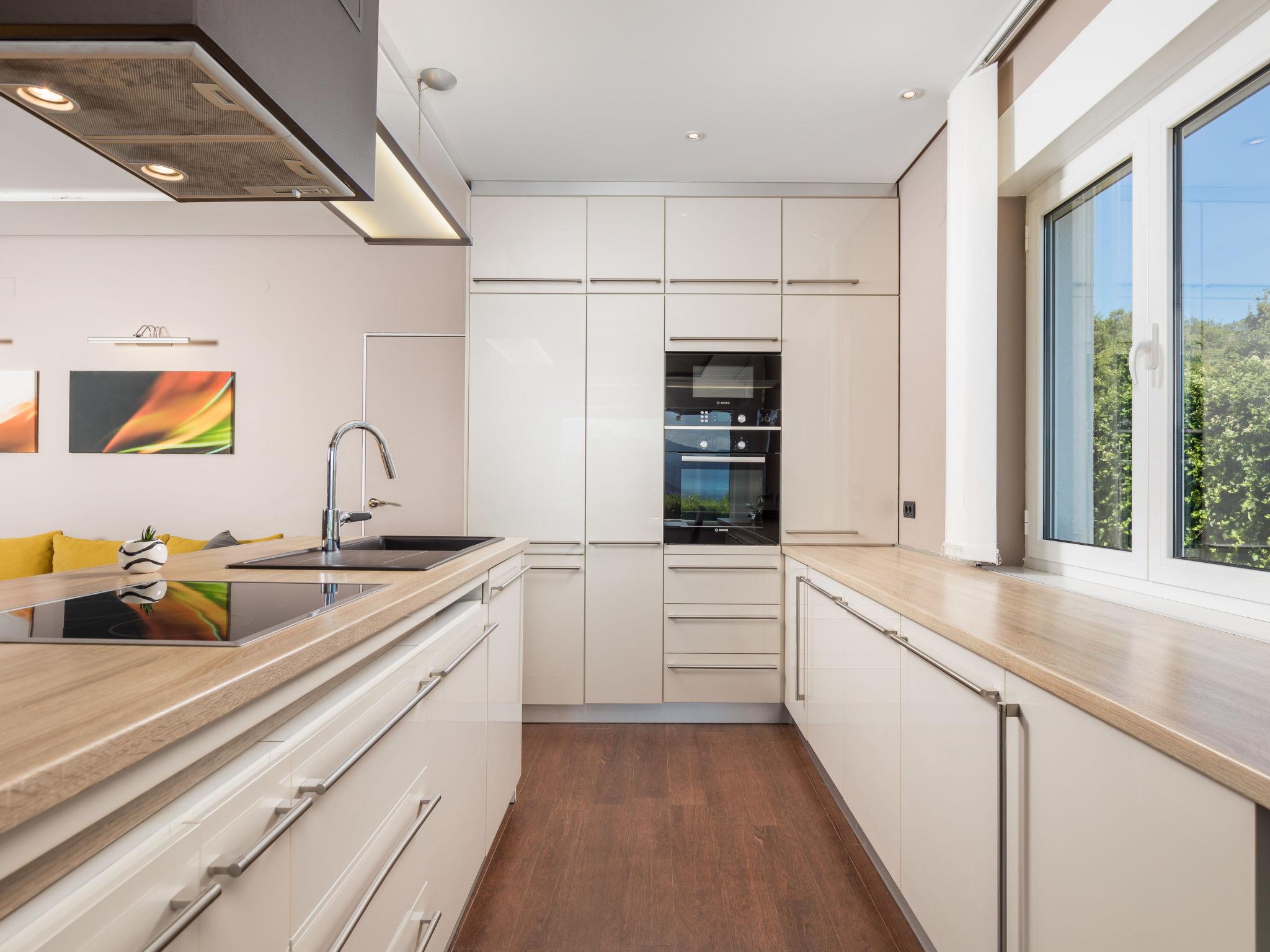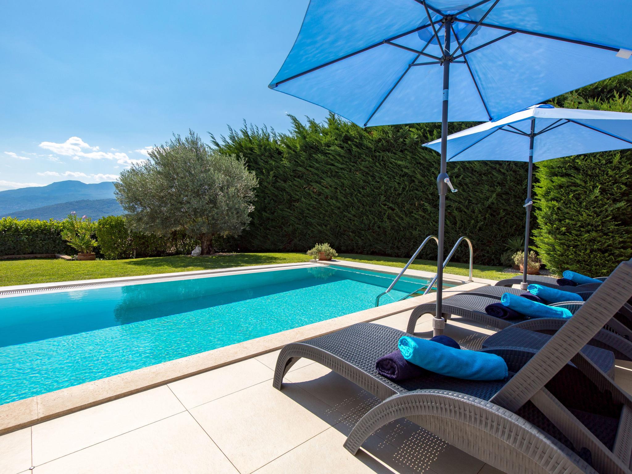 Matulji: Modern, beautiful villa "Vista", 2 storeys. 1.7 km from the centre of Matulji, 3.5 km from the centre of Opatija, in a quiet, sunny, elevated position, 2.5 km from the sea, 2.5 km from the beach, in a cul-de-sac. Private: property 1'050 m2 (fenced), lawn 300 m2, swimming pool angular (32 m2, depth 150 - 160 cm, seasonal availability: 21.May. - 15.Sep.). Outdoor shower, barbecue. In the house: internet access, washing machine, tumble dryer. Parking (for 6 cars) at the house on the premises. Shop, supermarket 700 m, restaurant 2 km, bus stop 400 m, pebble beach 2.5 km, concrete beach 2.5 km. Walking paths from the house 2 km. Please note: suitable for families. The owner does not accept any youth groups. Neighbourhood highly sensitive to noise. Quietness and good behaviour expected. Organizing a party is not allowed. The house consists of 3 apartments rented as one unit: one apartment on the ground floor and two apartments on the first floor.