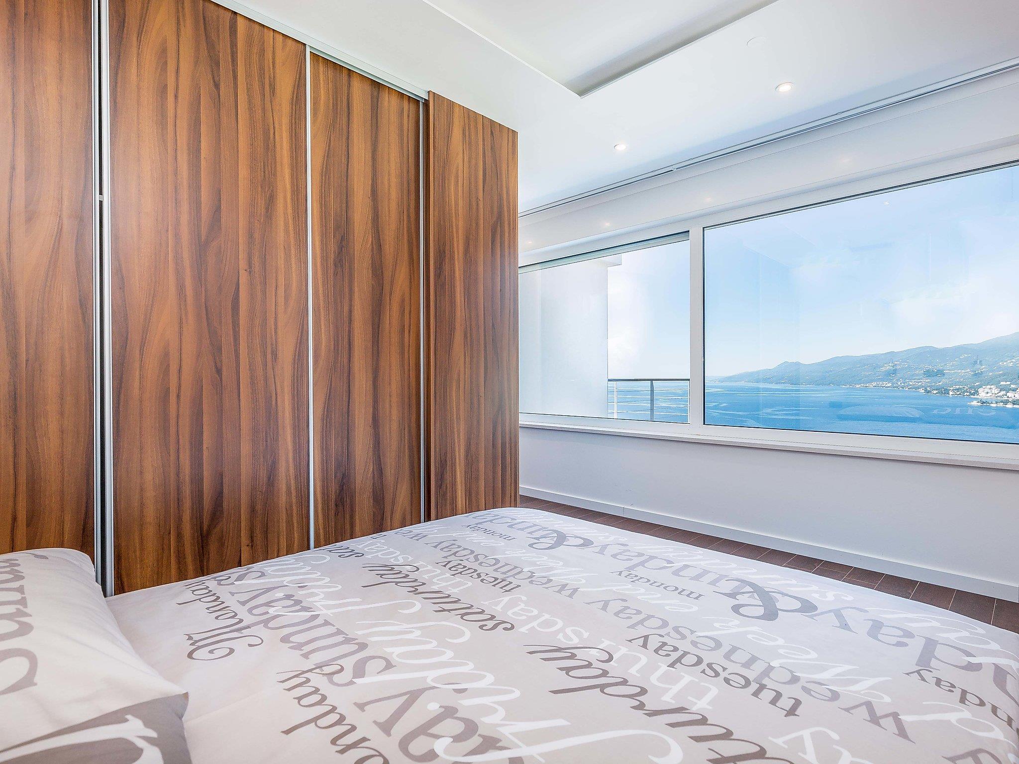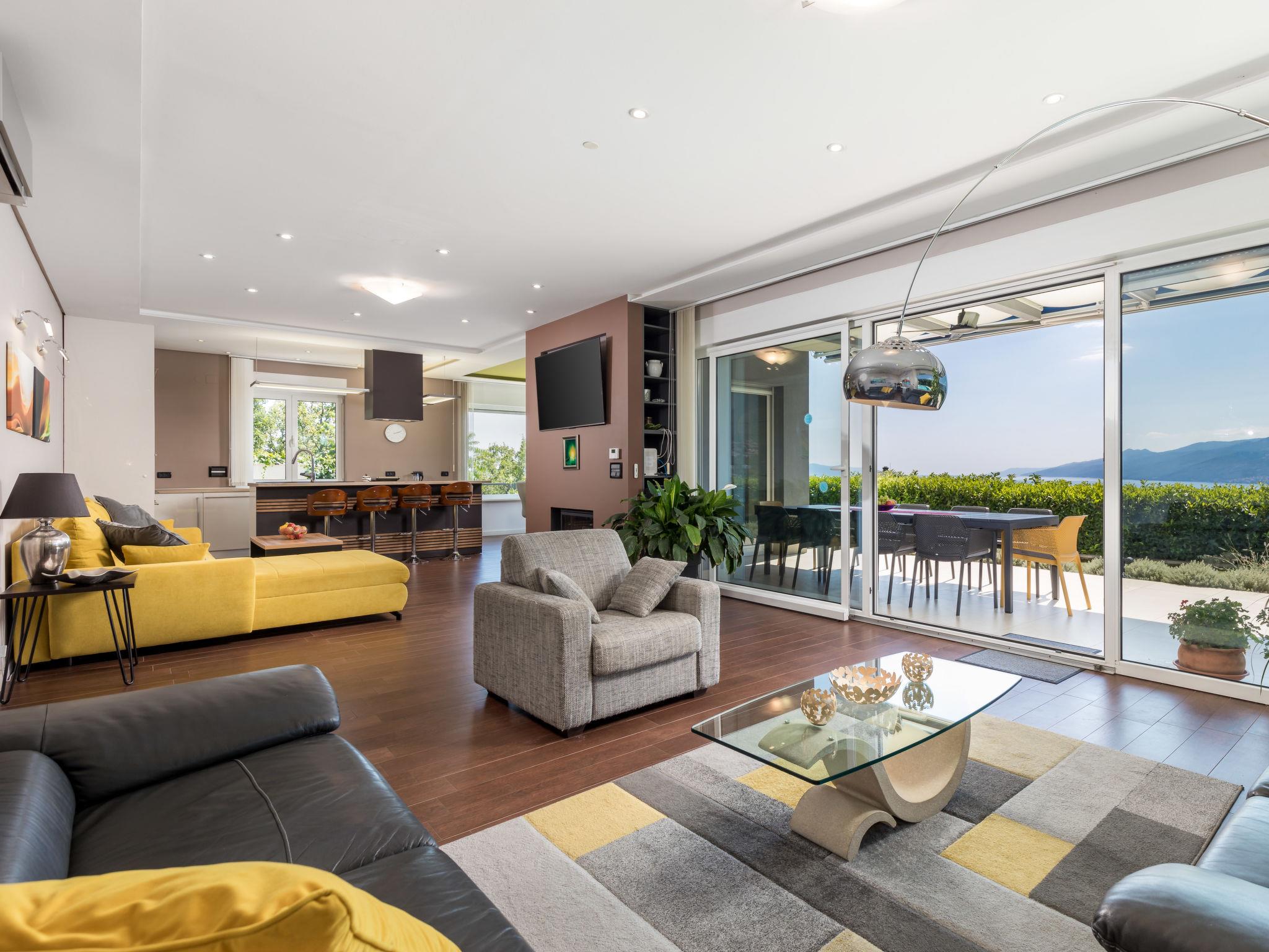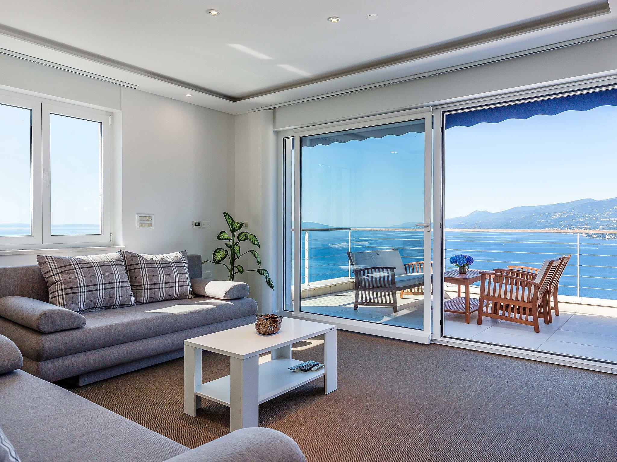 7-room villa 240 m2 on 2 levels, south facing position. Comfortable and tasteful furnishings: large living/dining room 70 m2 with panoramic window with open-hearth fireplace (only for decoration), satellite TV (flat screen), air conditioning. Exit to the terrace, to the swimming pool. 1 room with 2 beds (120 cm, length 200 cm), air conditioning. 1 room with Dressing room with 1 french bed (180 cm, length 210 cm), bath/shower/bidet/WC and air conditioning. Exit to the terrace, to the swimming pool. Open kitchen (oven, dishwasher, 4 ceramic glass hob hotplates, microwave, freezer, electric coffee machine). Shower/WC. Upper floor: (exterior staircase) living/dining room with panoramic window with kitchen corner and satellite TV (flat screen), air conditioning. Exit to the terrace. 1 room with panoramic window with 1 french bed (160 cm, length 200 cm), shower/WC and air conditioning. Living/dining room with panoramic window with 1 double sofabed and satellite TV (flat screen), air conditioning. Exit to the terrace. 1 room with 1 double bed (2 x 80 cm, length 200 cm). Open kitchen (oven, 2 ceramic glass hob hotplates, freezer). Shower/WC. No heating option. Terrace 40 m2, roofed, 2 terraces 12 m2. Terrace furniture, deck chairs, box-room. Marvellous panoramic view of the sea and the bay. Facilities: safe. Internet (WiFi, free). Parking (roofed, 2 cars). Apartment on the ground floor with living/dining area, kitchen, 2 bedrooms. 2 apartments on the first floor, each with living/dining area, kitchen, 1 bedroom. UP/I-335-03/16-01/85