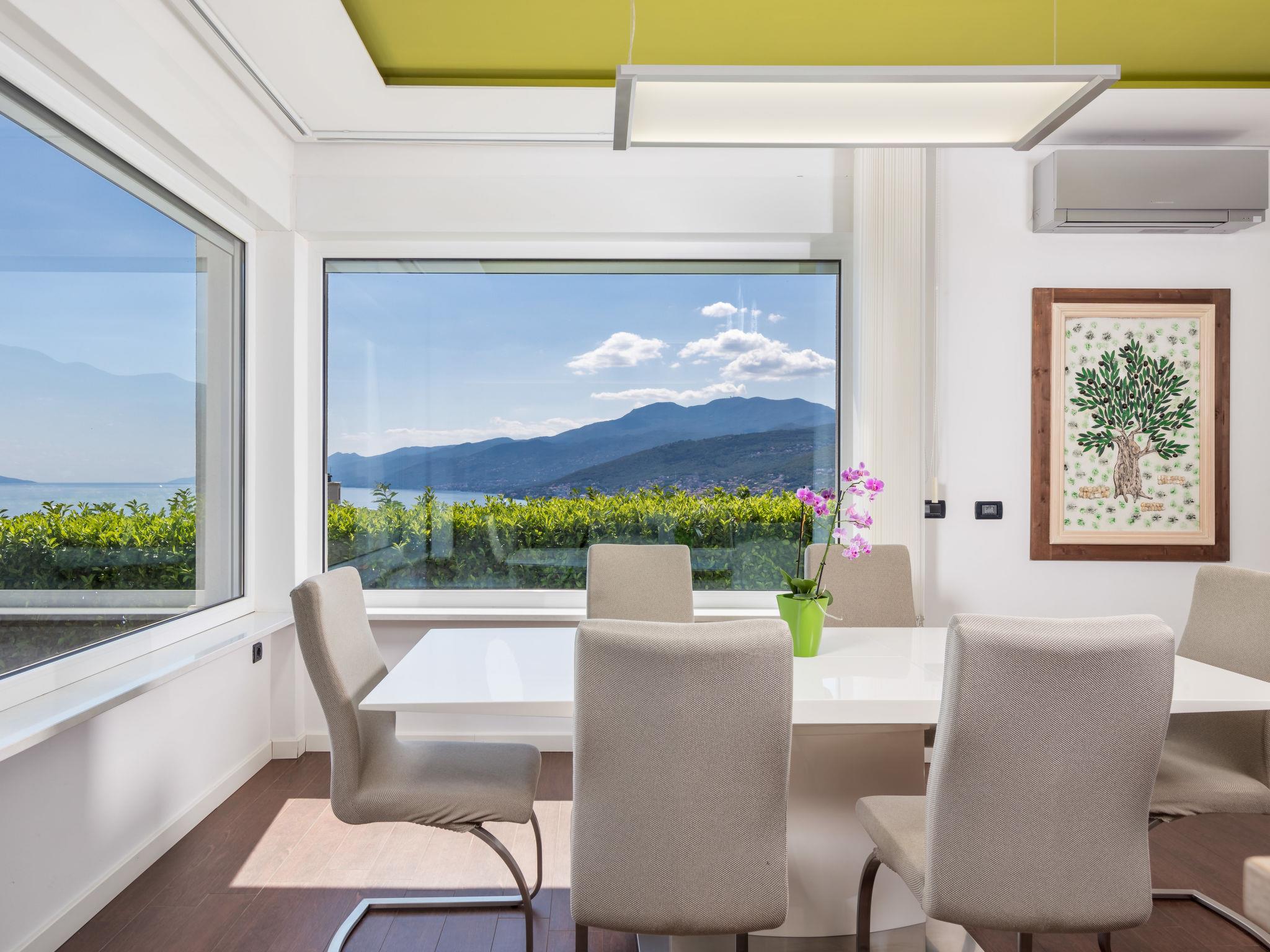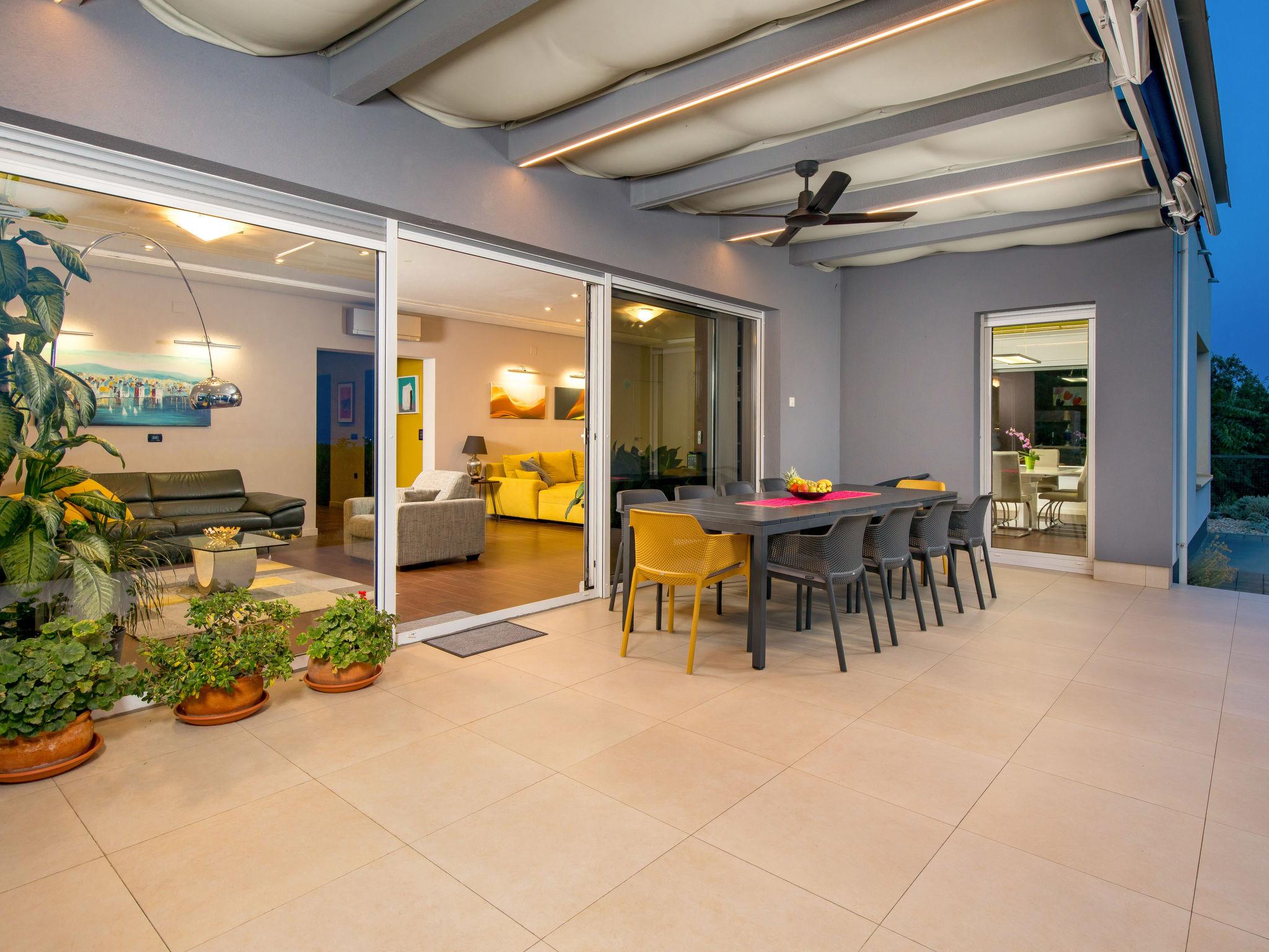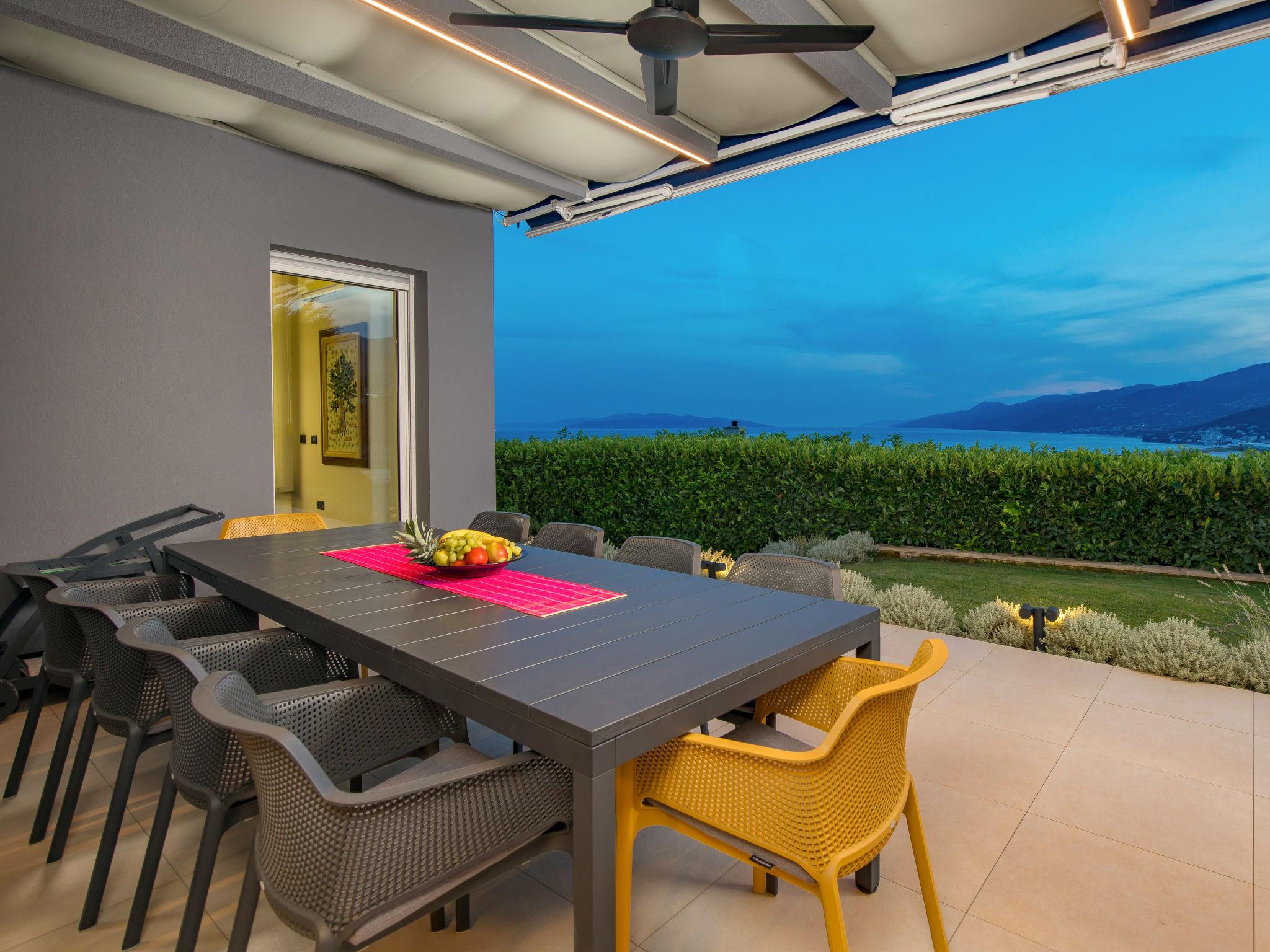 7-room villa 240 m2 on 2 levels, south facing position. Comfortable and tasteful furnishings: large living/dining room 70 m2 with panoramic window with open-hearth fireplace (only for decoration), satellite TV (flat screen), air conditioning. Exit to the terrace, to the swimming pool. 1 room with 2 beds (120 cm, length 200 cm), air conditioning. 1 room with Dressing room with 1 french bed (180 cm, length 210 cm), bath/shower/bidet/WC and air conditioning. Exit to the terrace, to the swimming pool. Open kitchen (oven, dishwasher, 4 ceramic glass hob hotplates, microwave, freezer, electric coffee machine). Shower/WC. Upper floor: (exterior staircase) living/dining room with panoramic window with kitchen corner and satellite TV (flat screen), air conditioning. Exit to the terrace. 1 room with panoramic window with 1 french bed (160 cm, length 200 cm), shower/WC and air conditioning. Living/dining room with panoramic window with 1 double sofabed and satellite TV (flat screen), air conditioning. Exit to the terrace. 1 room with 1 double bed (2 x 80 cm, length 200 cm). Open kitchen (oven, 2 ceramic glass hob hotplates, freezer). Shower/WC. No heating option. Terrace 40 m2, roofed, 2 terraces 12 m2. Terrace furniture, deck chairs, box-room. Marvellous panoramic view of the sea and the bay. Facilities: safe. Internet (WiFi, free). Parking (roofed, 2 cars). Apartment on the ground floor with living/dining area, kitchen, 2 bedrooms. 2 apartments on the first floor, each with living/dining area, kitchen, 1 bedroom. UP/I-335-03/16-01/85
