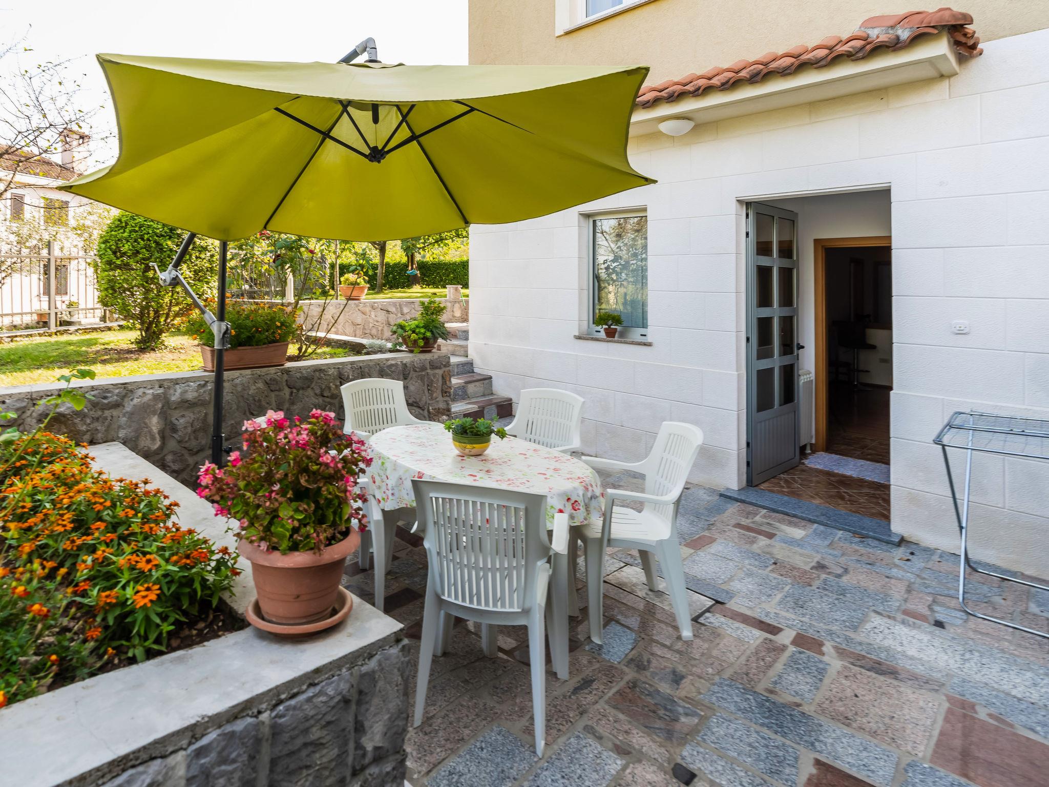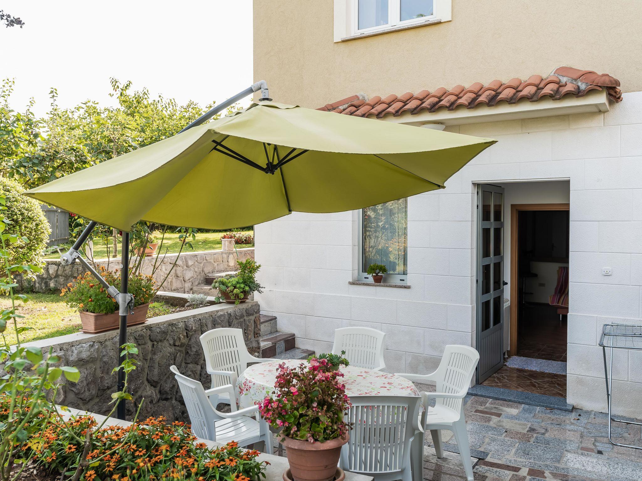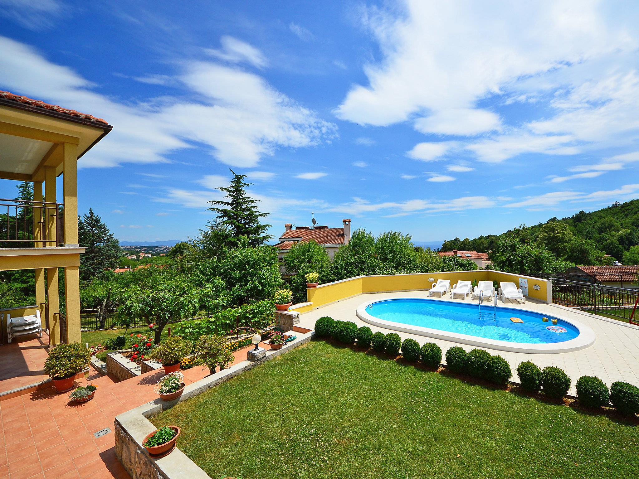 Mihelici 5 km from Opatija: Beautiful 3-family house "Kate". Above Opatija, in the hamlet Mihelici 5 km from the centre of Opatija, in a quiet, sunny position, 5 km from the sea, 5 km from the beach, located by a road, in the countryside. For shared use: property 1'400 m2, well-kept garden with lawn and flowers, swimming pool (23 m2, depth 150 cm, seasonal availability: 15.May. - 15.Sep.). Arbour (26 m2), garden furniture, barbecue (swing). In the house: internet access, trampoline. Parking at the house on the premises. Shop 2 km, restaurant 300 m, bus stop 500 m, pebble beach 5 km, public bathing area 6 km, concrete beach 5 km. Tennis 1 km. The owner does not accept any groups. Please note: Additional accommodations can be booked. Neighbourhood highly sensitive to noise. Quietness and good behaviour expected. The swimming pool is oval shaped.
