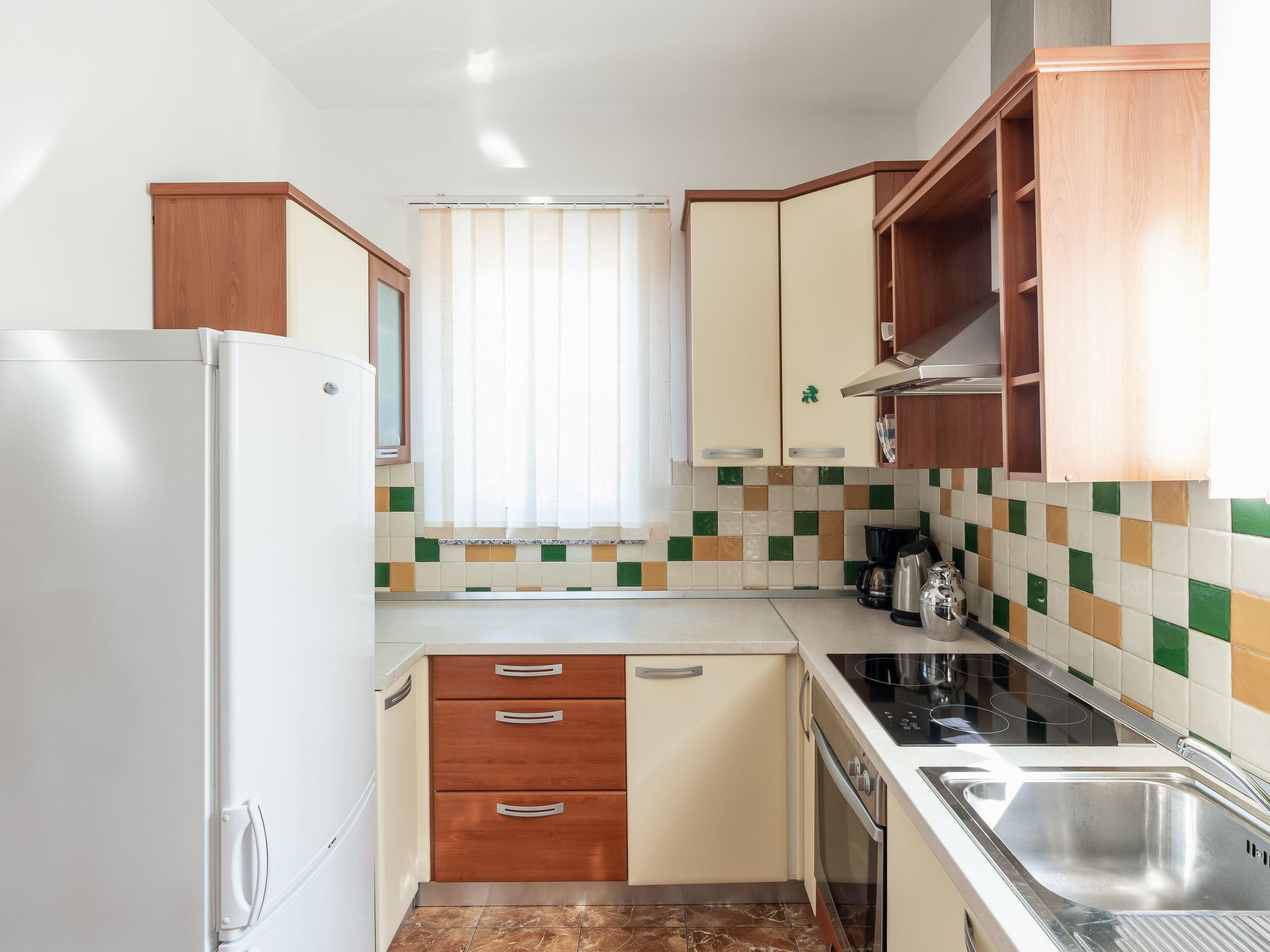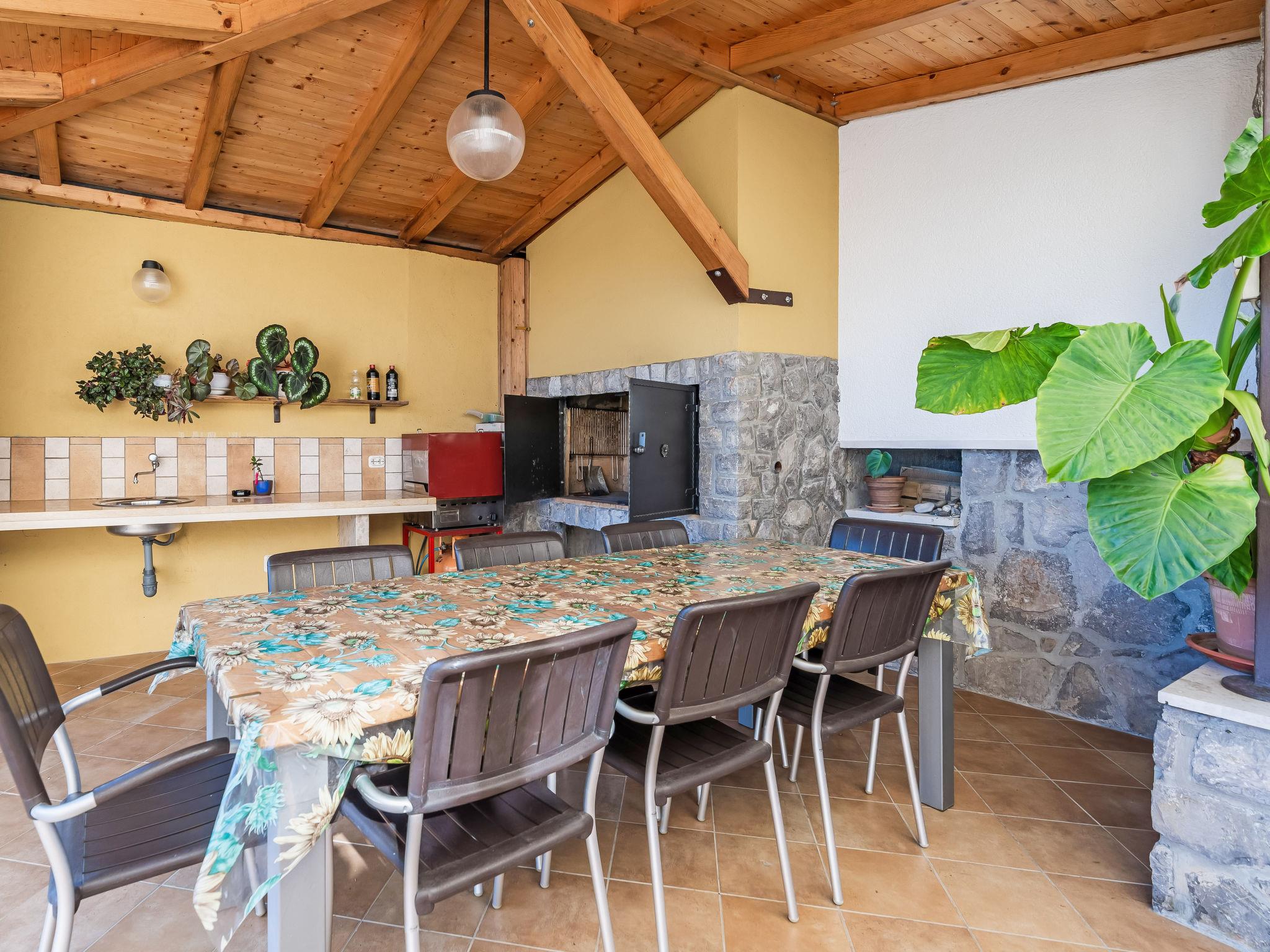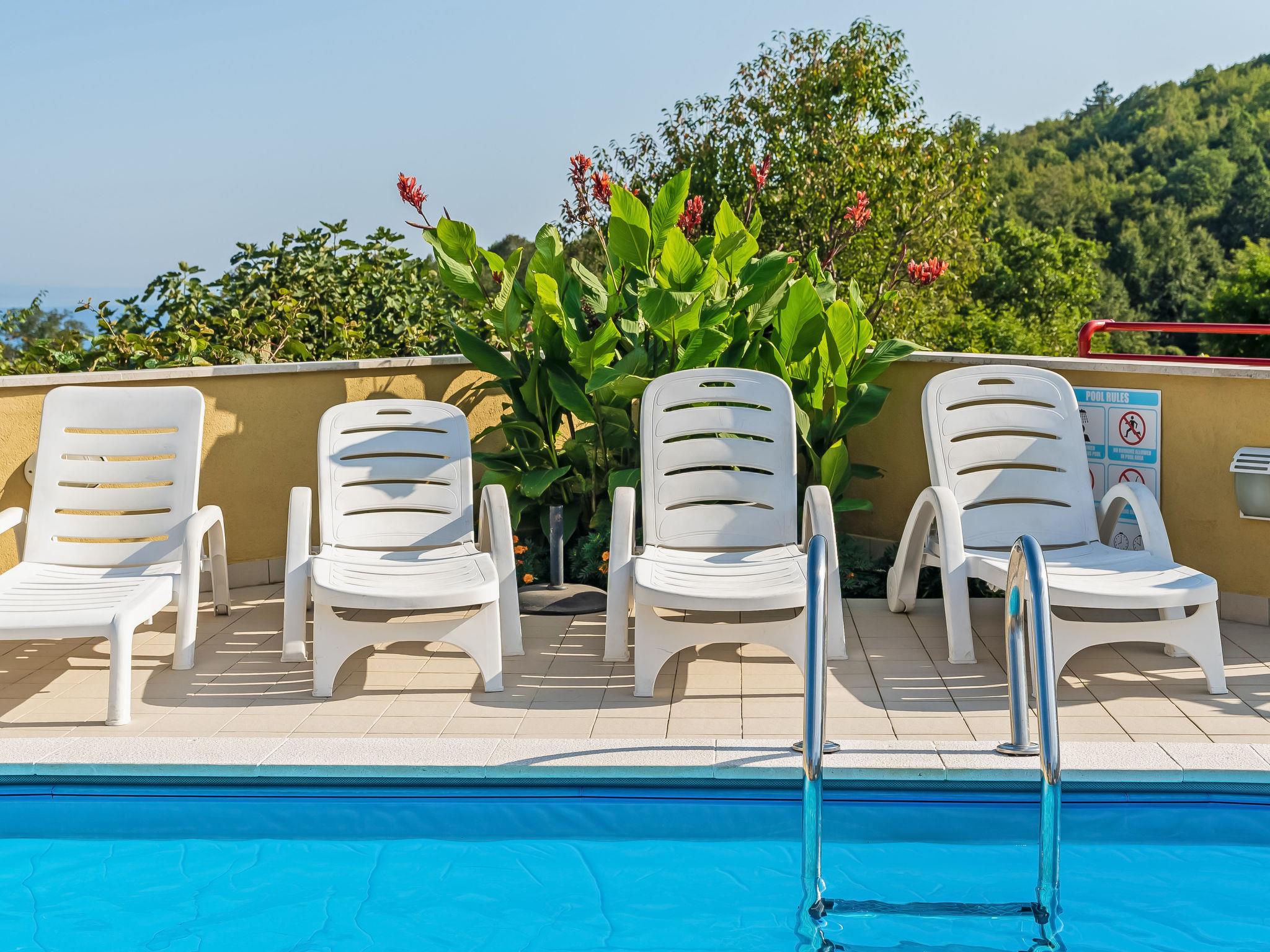 Mihelici 5 km from Opatija: Beautiful 3-family house "Kate". Above Opatija, in the hamlet Mihelici 5 km from the centre of Opatija, in a quiet, sunny position, 5 km from the sea, 5 km from the beach, located by a road, in the countryside. For shared use: property 1'400 m2, well-kept garden with lawn and flowers, swimming pool (23 m2, depth 150 cm, seasonal availability: 15.May. - 15.Sep.). Arbour (26 m2), garden furniture, barbecue (swing). In the house: internet access, trampoline. Parking at the house on the premises. Shop 2 km, restaurant 300 m, bus stop 500 m, pebble beach 5 km, public bathing area 6 km, concrete beach 5 km. Tennis 1 km. The owner does not accept any groups. Please note: Additional accommodations can be booked. Neighbourhood highly sensitive to noise. Quietness and good behaviour expected. The swimming pool is oval shaped.