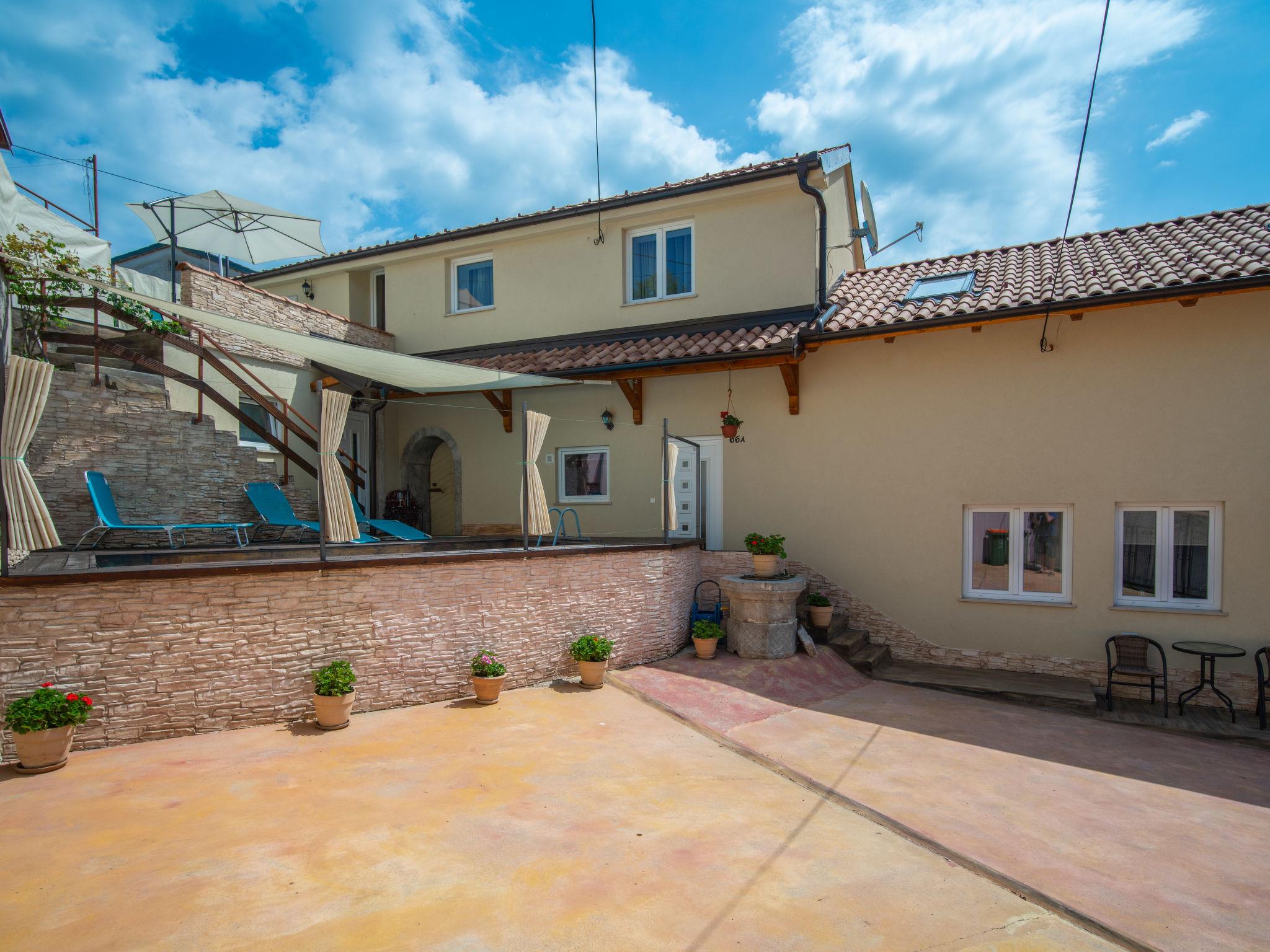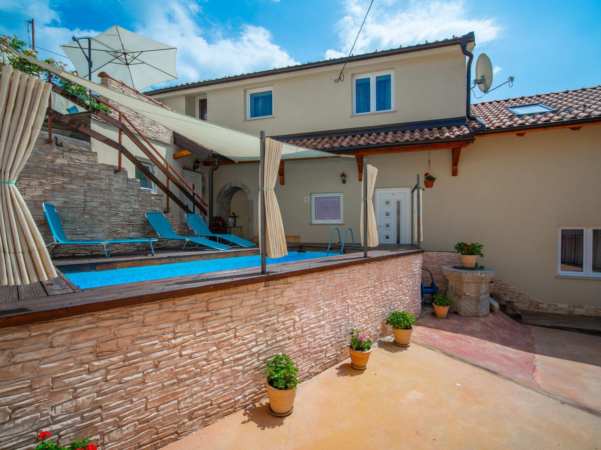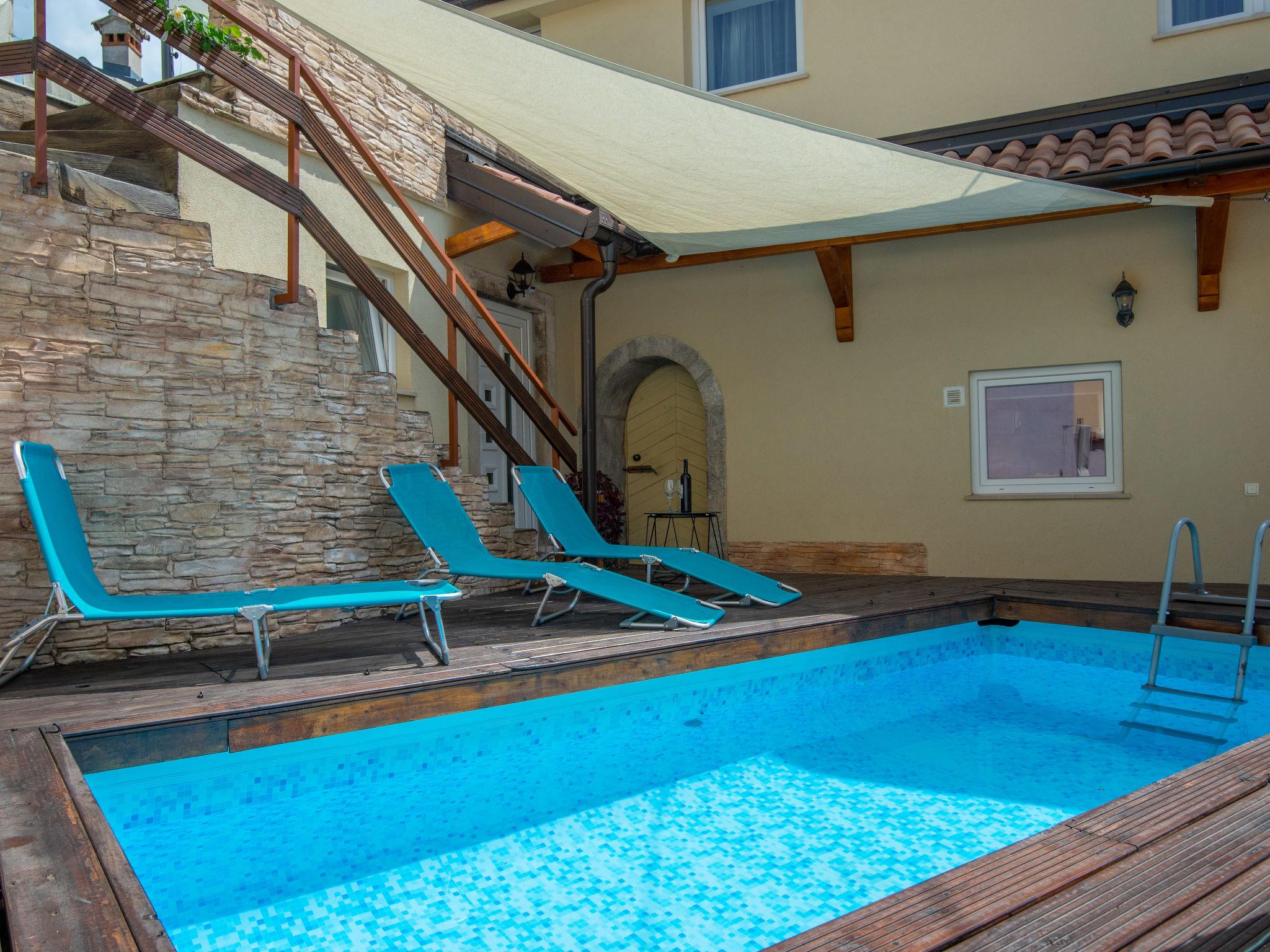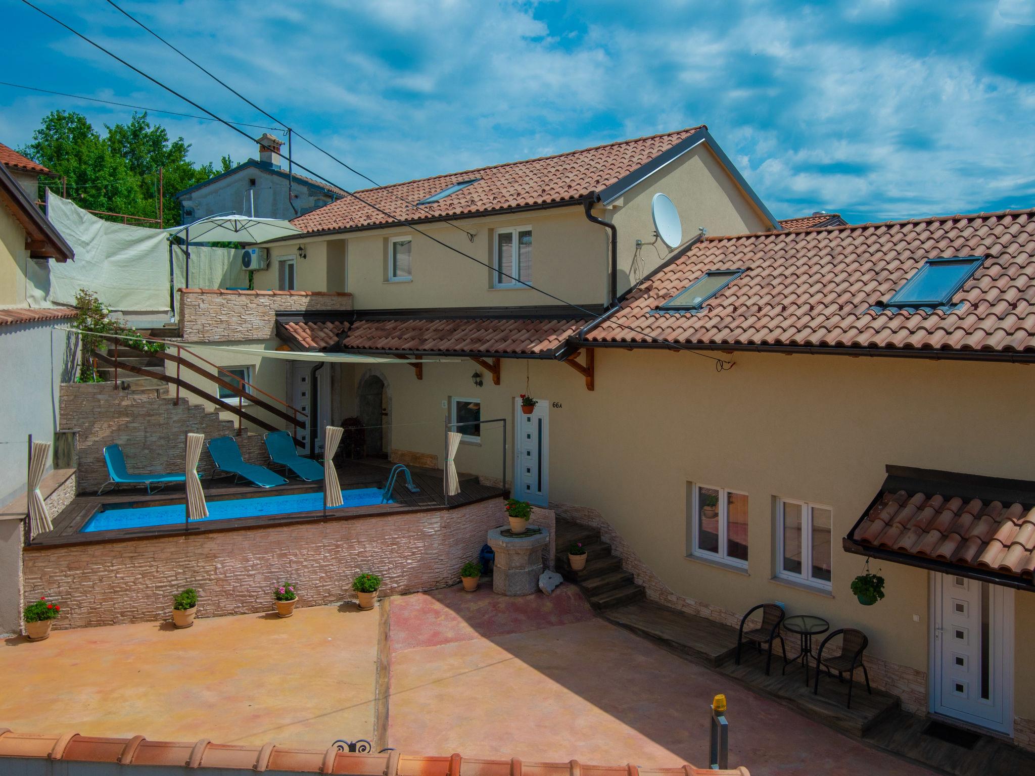 Veli Brgud 13 km from Opatija: Single-family house "Veli", 2 storeys. 10 km from the centre of Matulji, in a sunny position, 13 km from the sea. Private: property 480 m2 (fenced), swimming pool angular (4 x 2 m, 9 m2, depth 120 cm, seasonal availability: 01.May. - 30.Sep.). Garden furniture. In the house: internet access, washing machine. Parking (for 3 cars) at the house on the premises. Shop 350 m, supermarket 10 km, restaurant 4.4 km, bus stop 250 m, pebble beach 13 km, concrete beach 13 km. Groups of teenagers on request only. Part of the house is closed and unoccupied. The house consists of 2 apartments rented as one unit. Each apartment with external and separate entrance.