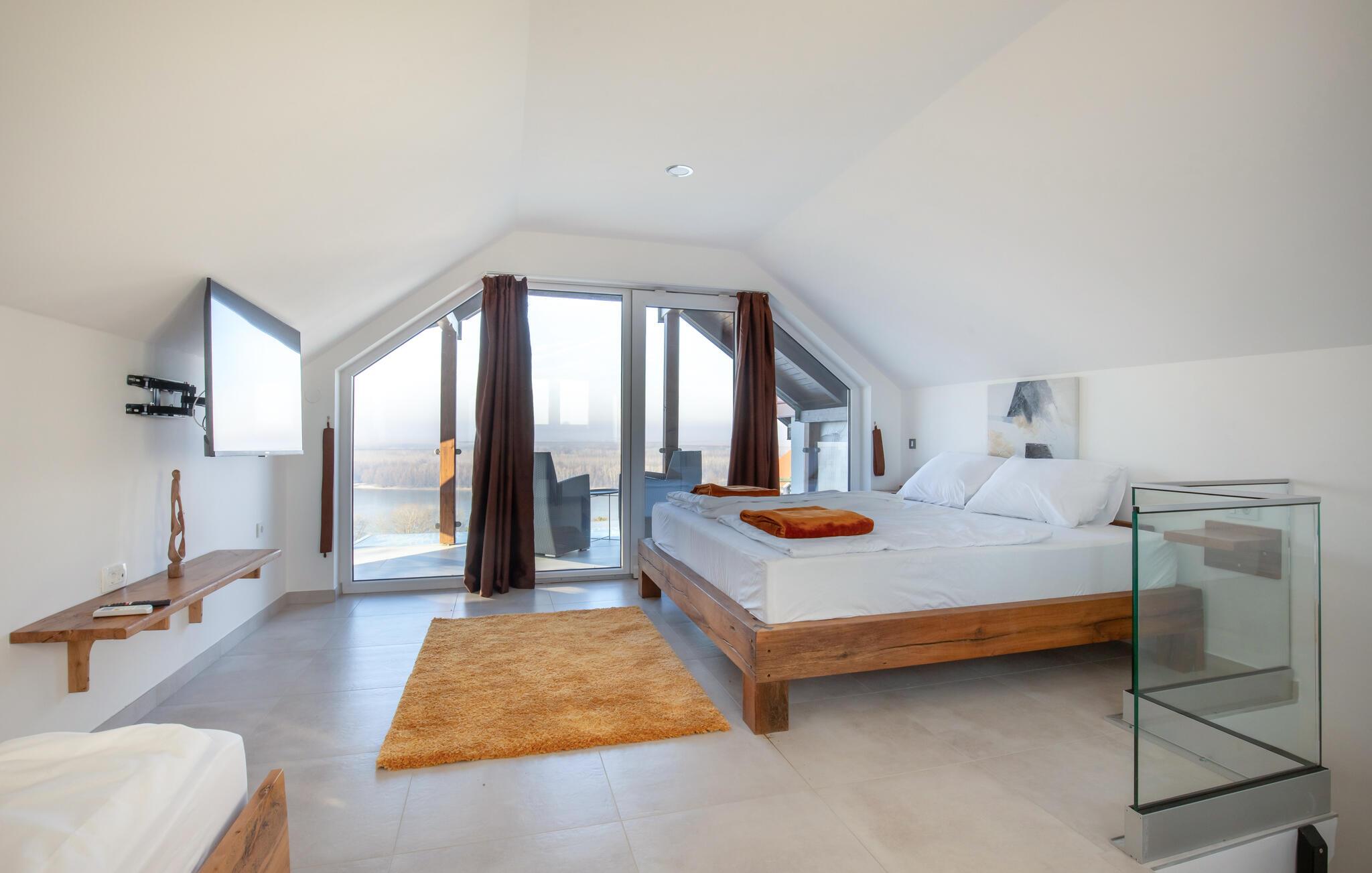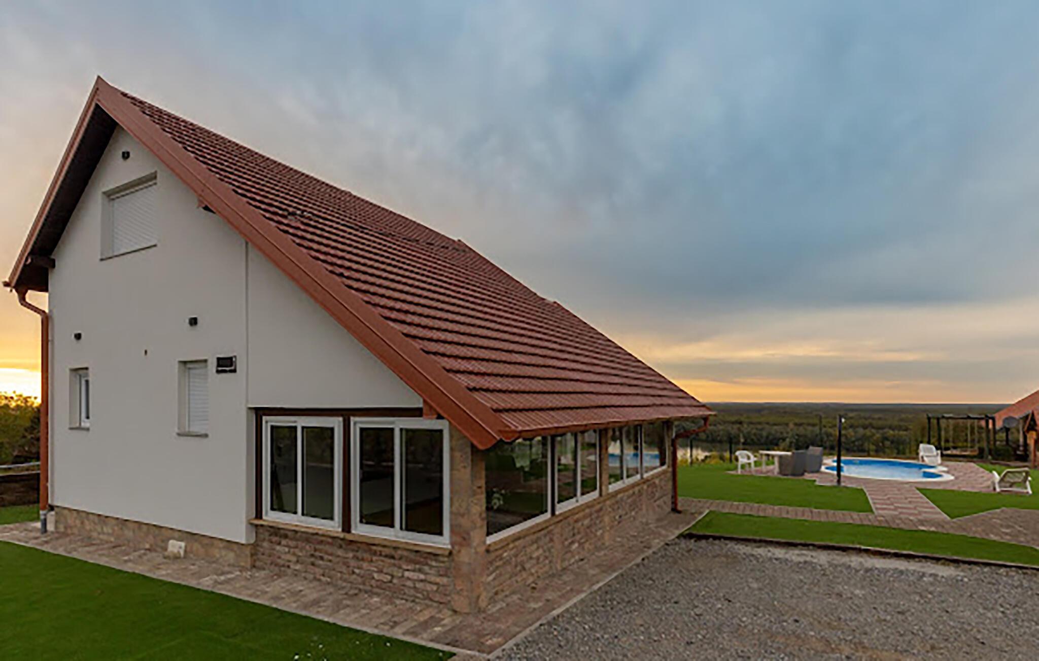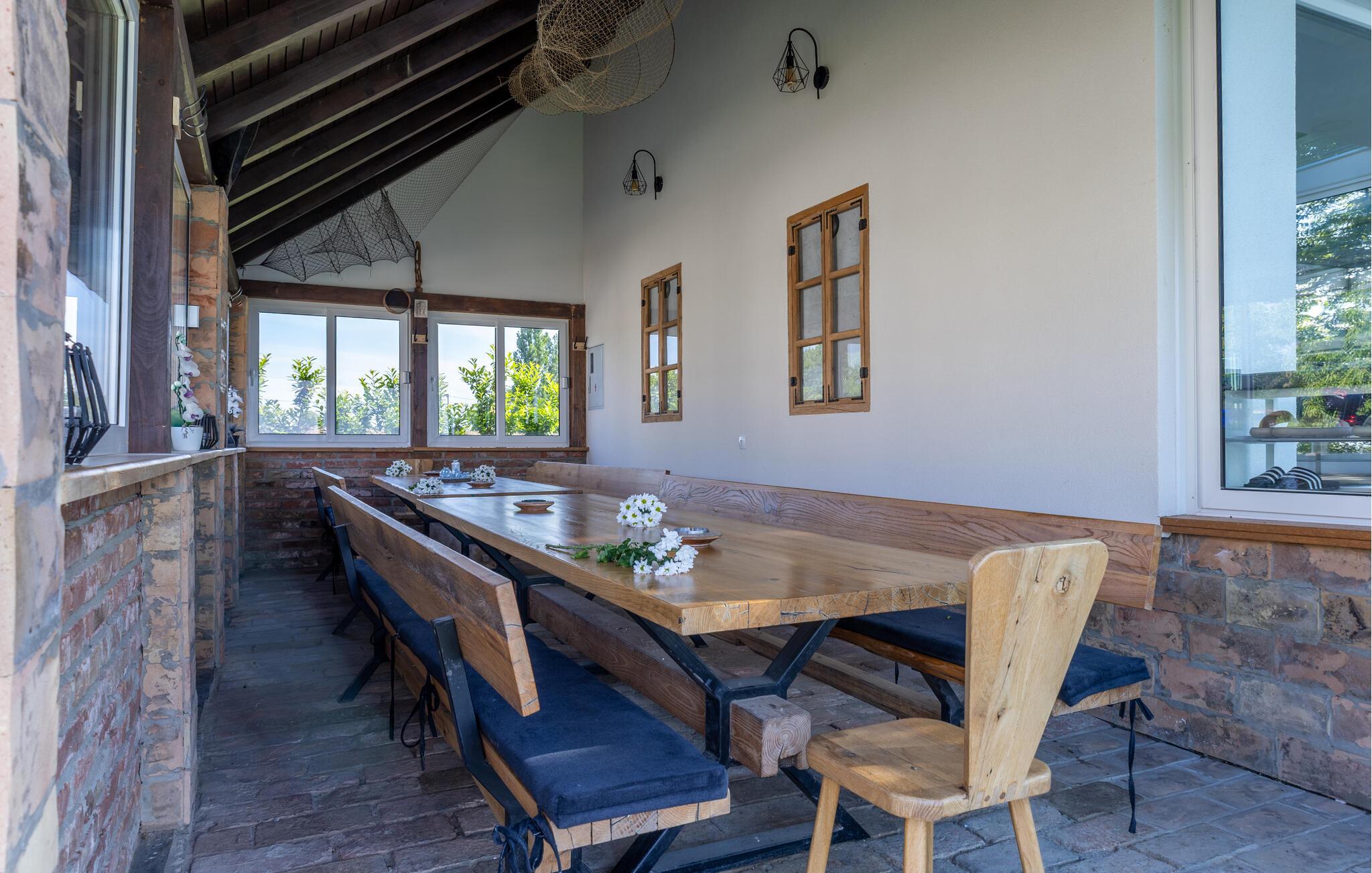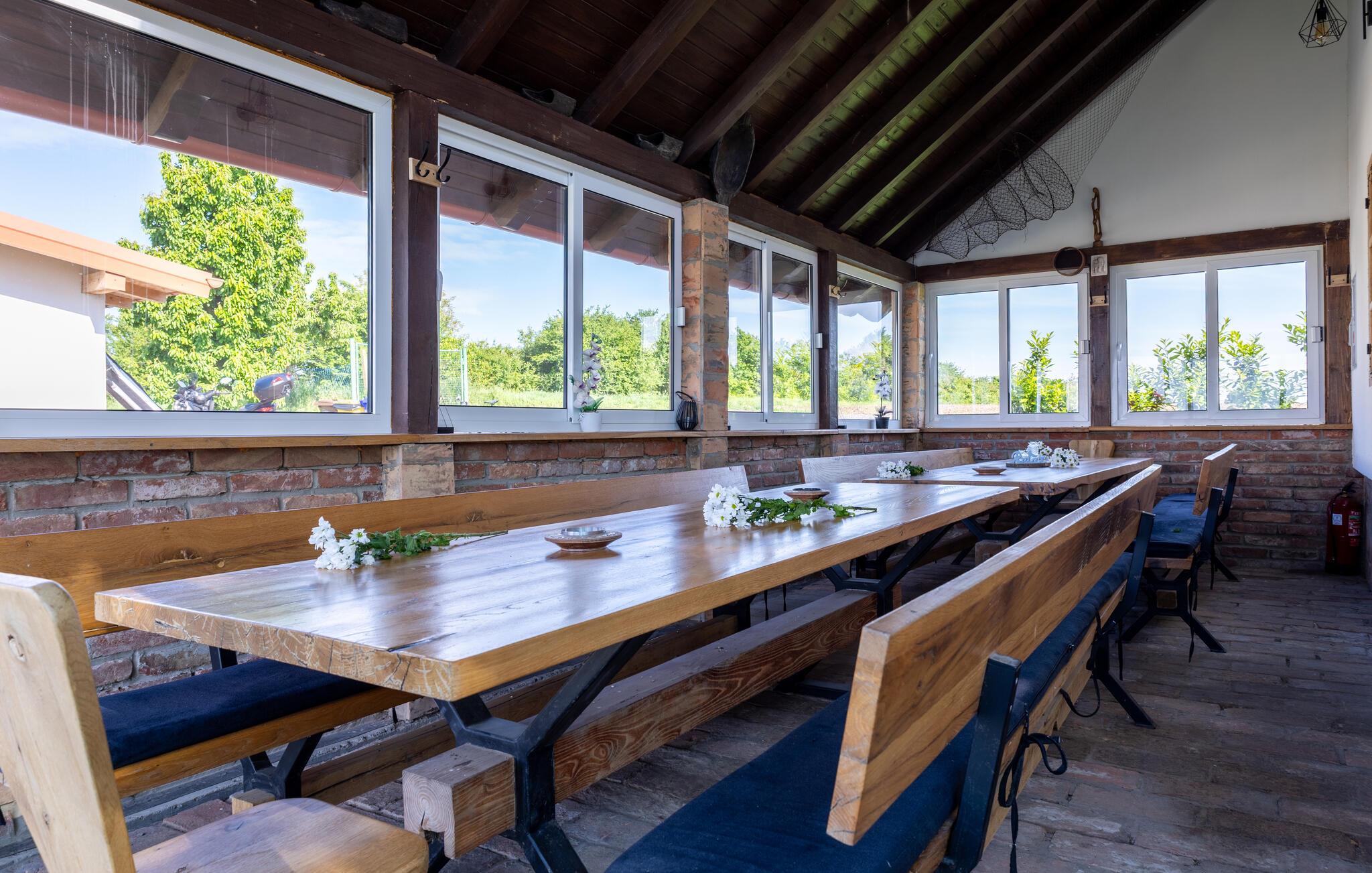 Beliggende i det idylliske landskab nær Aljmaš tilbyder dette hus et unikt tilflugtssted for friluftsmennesker, der ikke vil gå glip af moderne bekvemmeligheder og en hyggelig atmosfære. Slap af på den rummelige sofa med en filmaften, spil et brætspil eller forkæl jer selv med behagelige stunder i saunaen. Den glaserede vinterhave tilbyder jer et behageligt tilflugtssted med en smuk udsigt over landskabet.