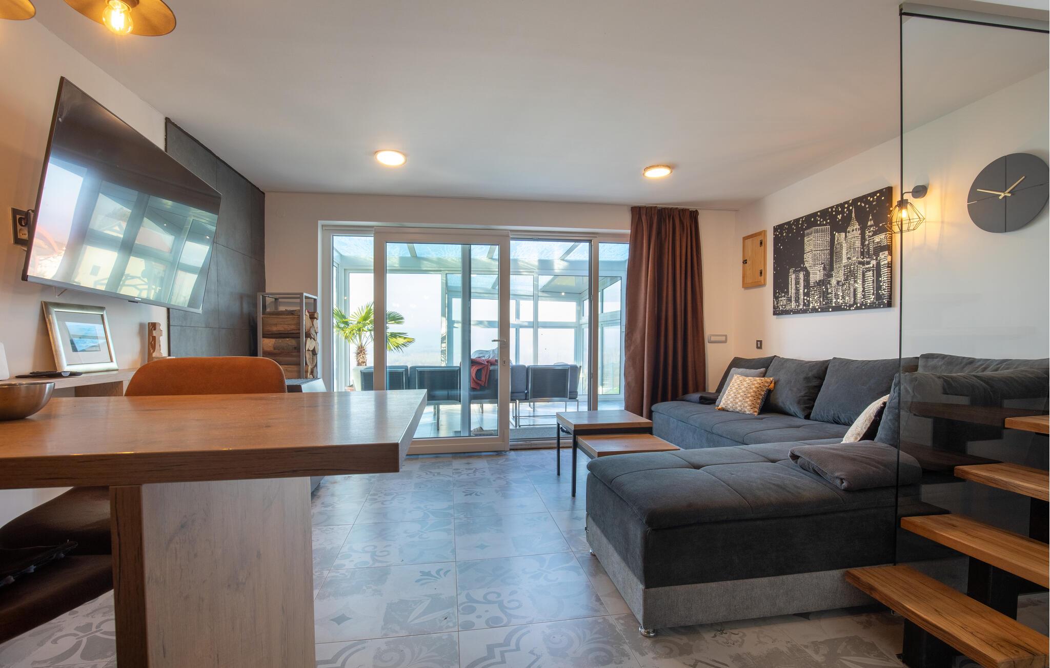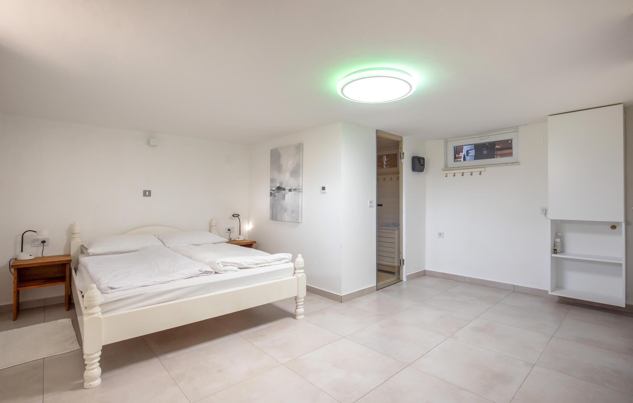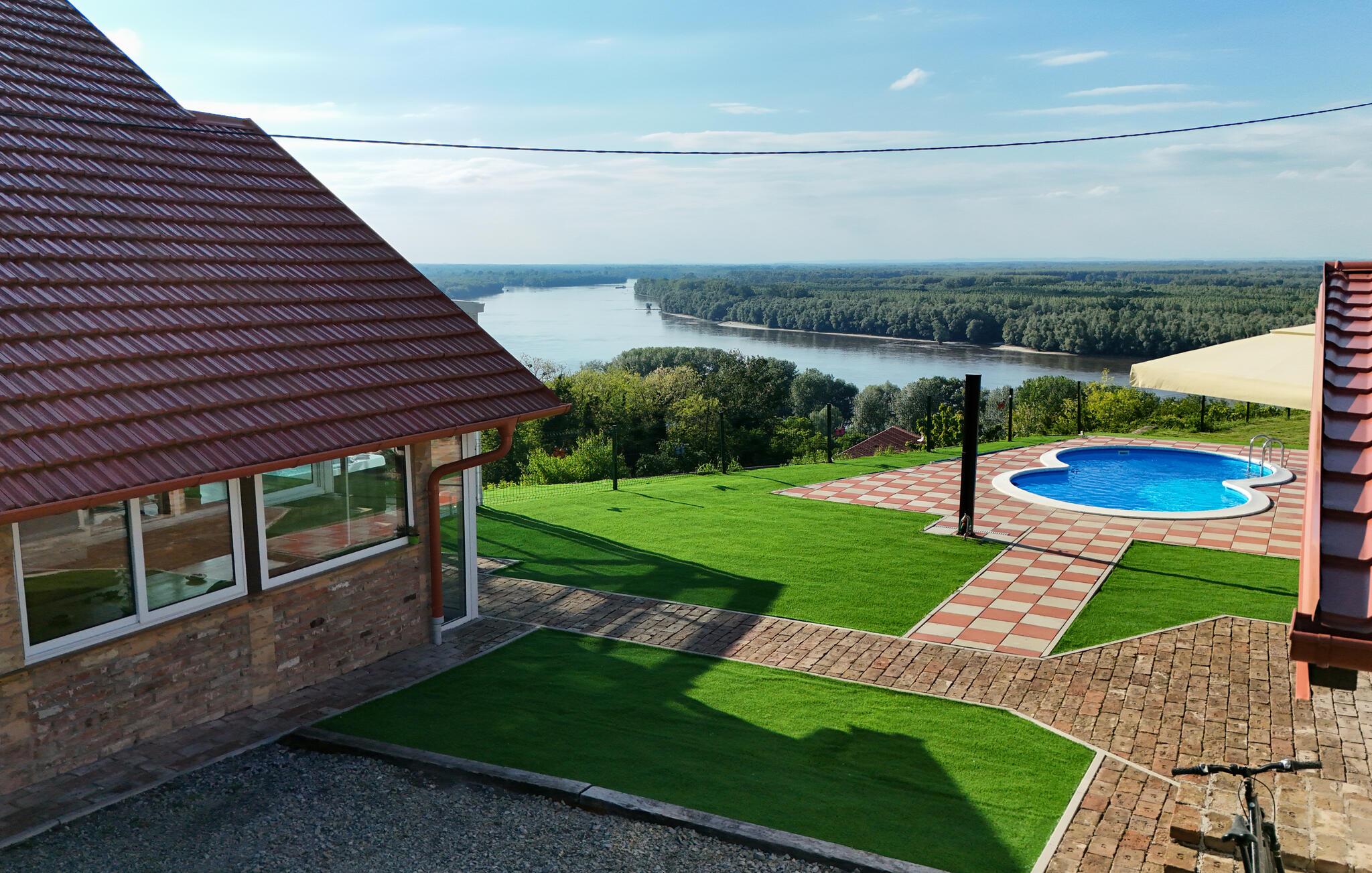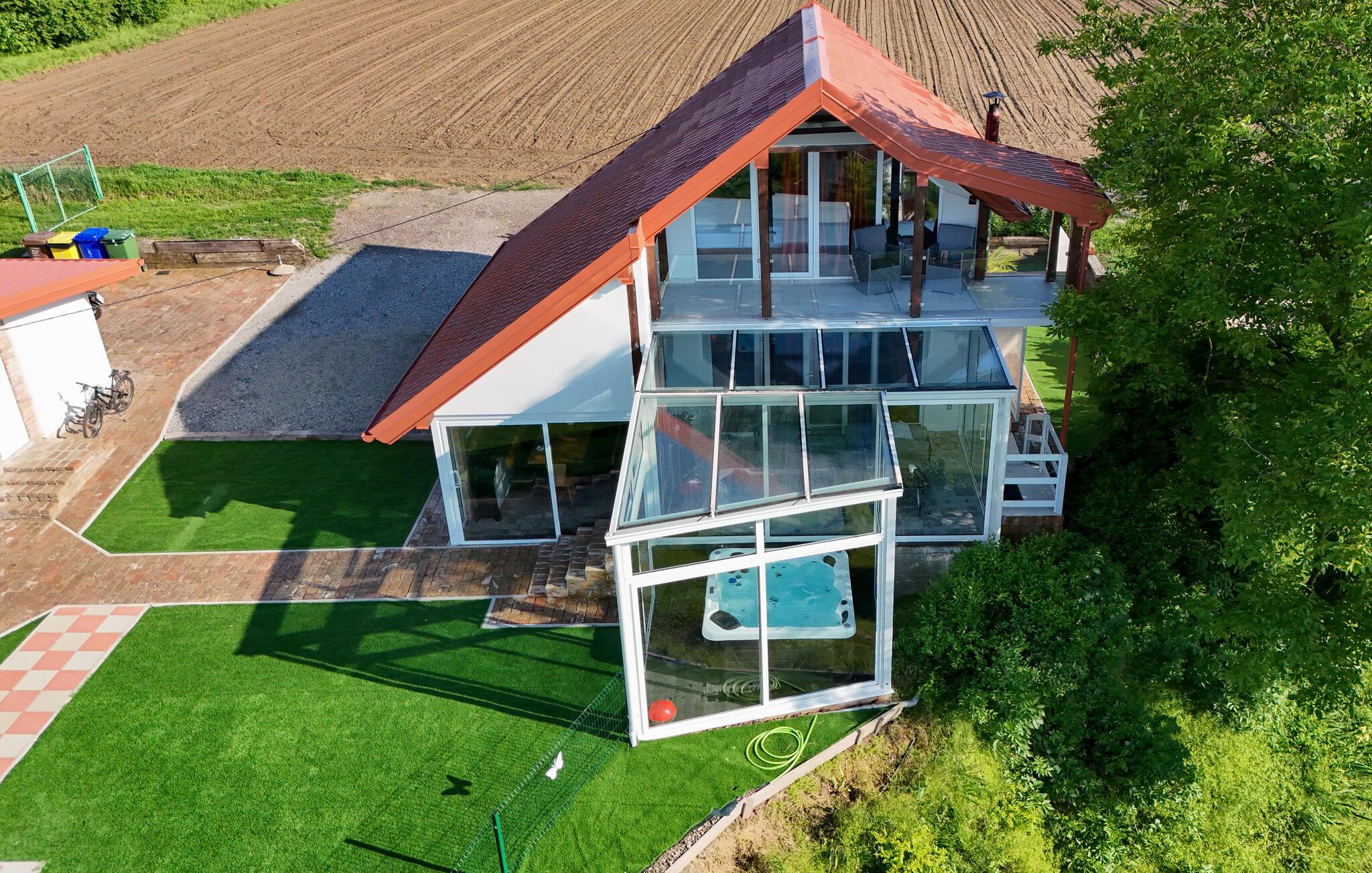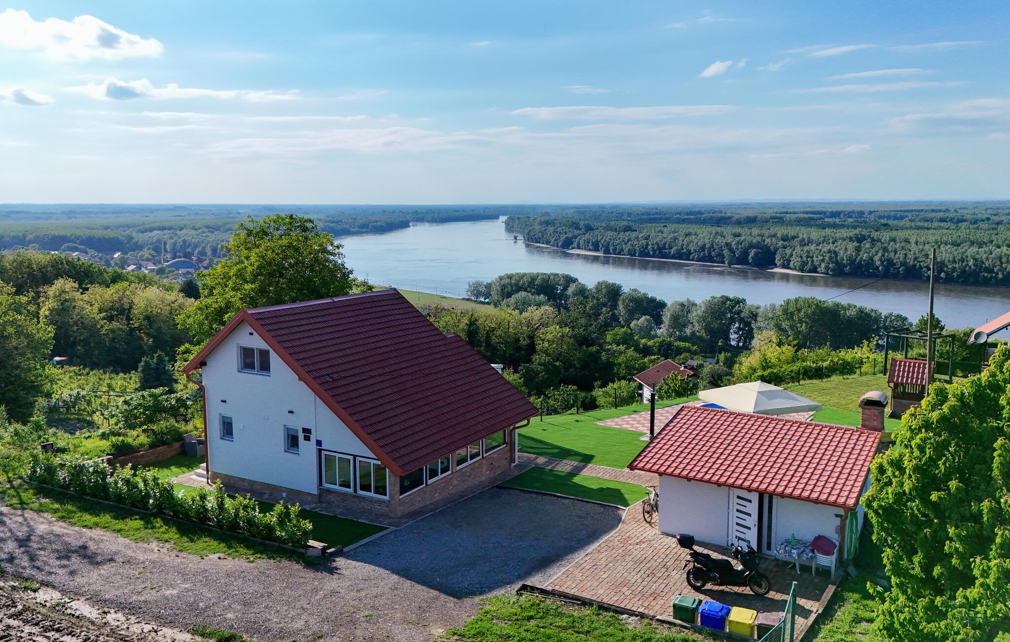 Beliggende i det idylliske landskab nær Aljmaš tilbyder dette hus et unikt tilflugtssted for friluftsmennesker, der ikke vil gå glip af moderne bekvemmeligheder og en hyggelig atmosfære. Slap af på den rummelige sofa med en filmaften, spil et brætspil eller forkæl jer selv med behagelige stunder i saunaen. Den glaserede vinterhave tilbyder jer et behageligt tilflugtssted med en smuk udsigt over landskabet.