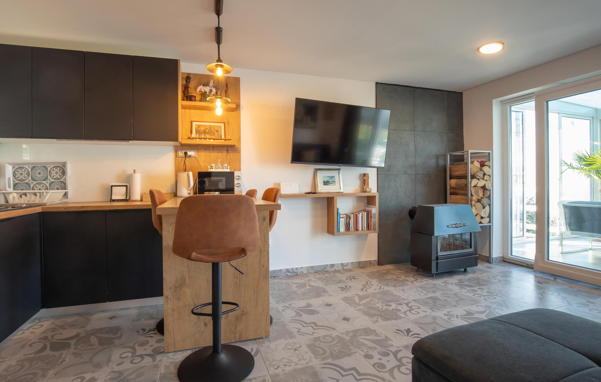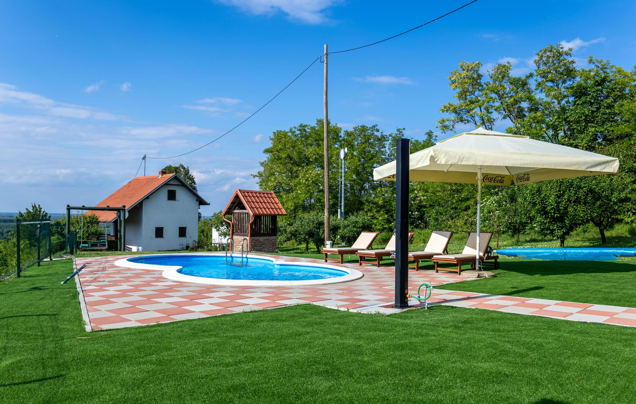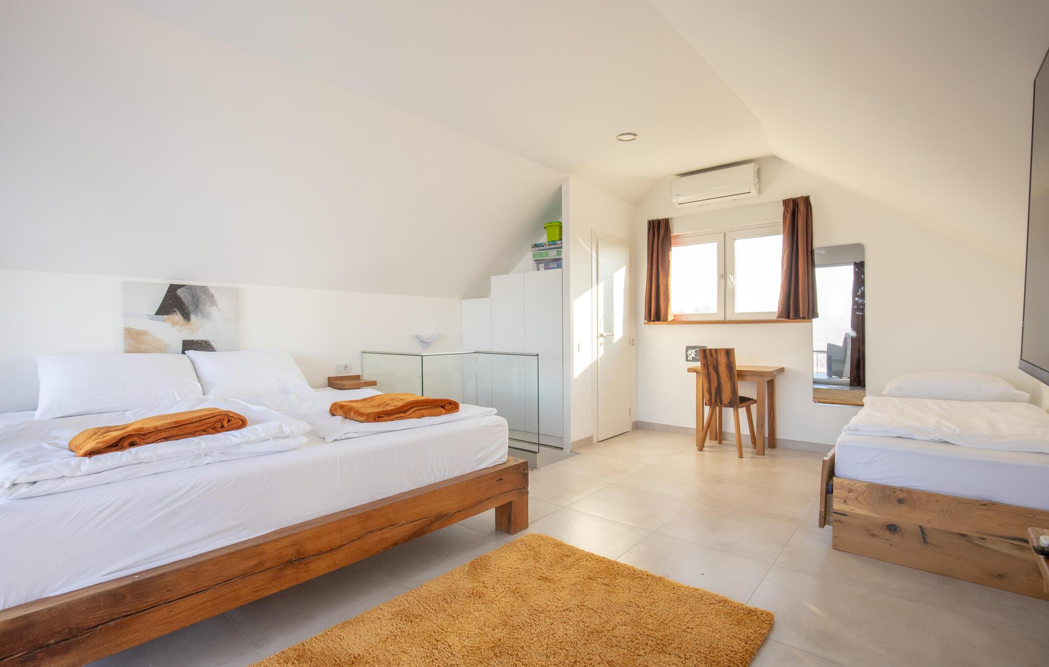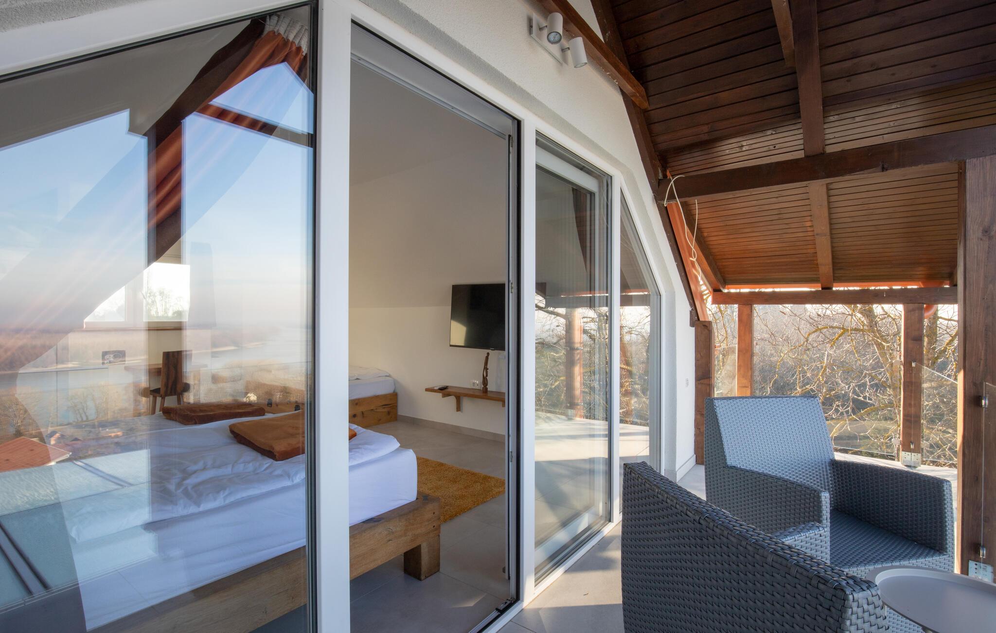 Beliggende i det idylliske landskab nær Aljmaš tilbyder dette hus et unikt tilflugtssted for friluftsmennesker, der ikke vil gå glip af moderne bekvemmeligheder og en hyggelig atmosfære. Slap af på den rummelige sofa med en filmaften, spil et brætspil eller forkæl jer selv med behagelige stunder i saunaen. Den glaserede vinterhave tilbyder jer et behageligt tilflugtssted med en smuk udsigt over landskabet.