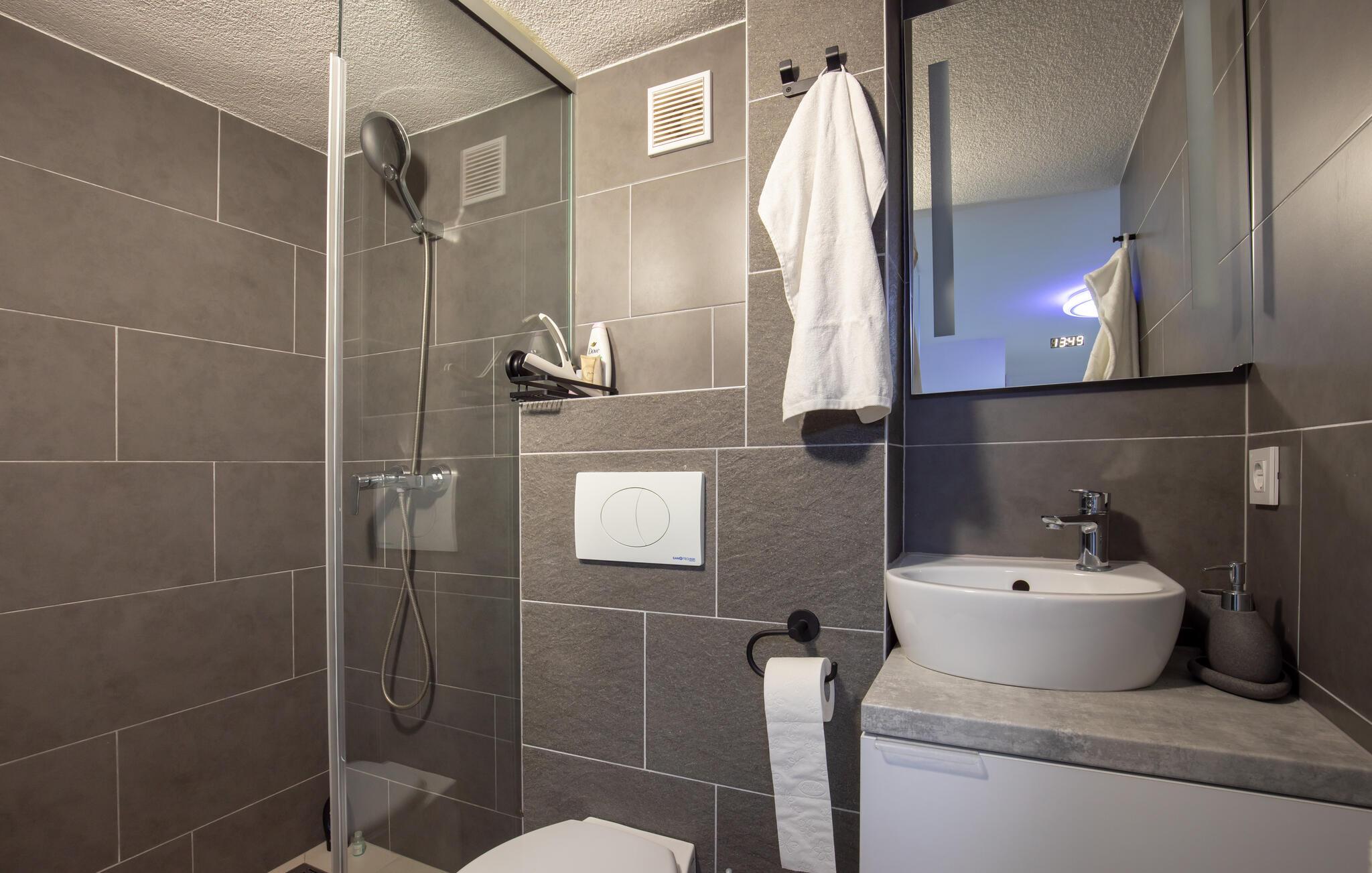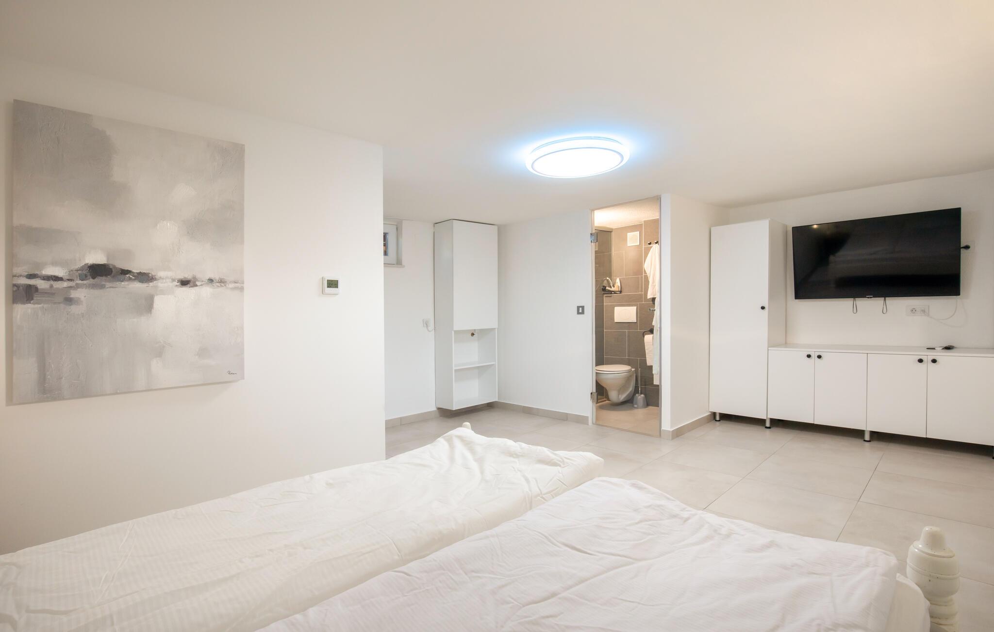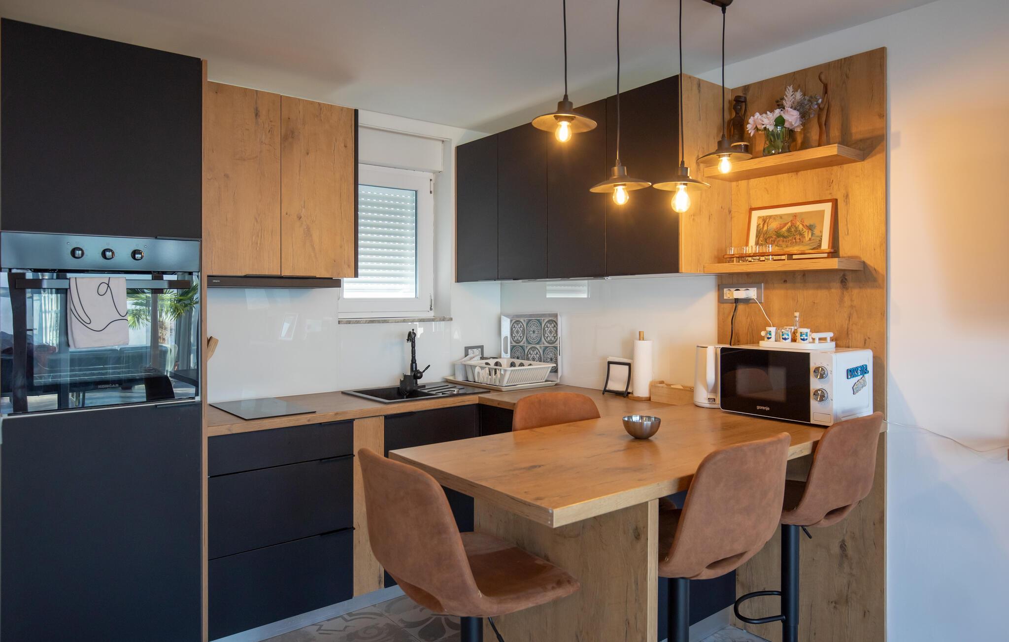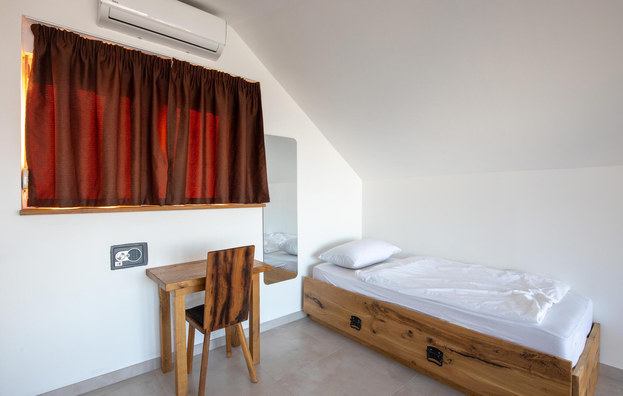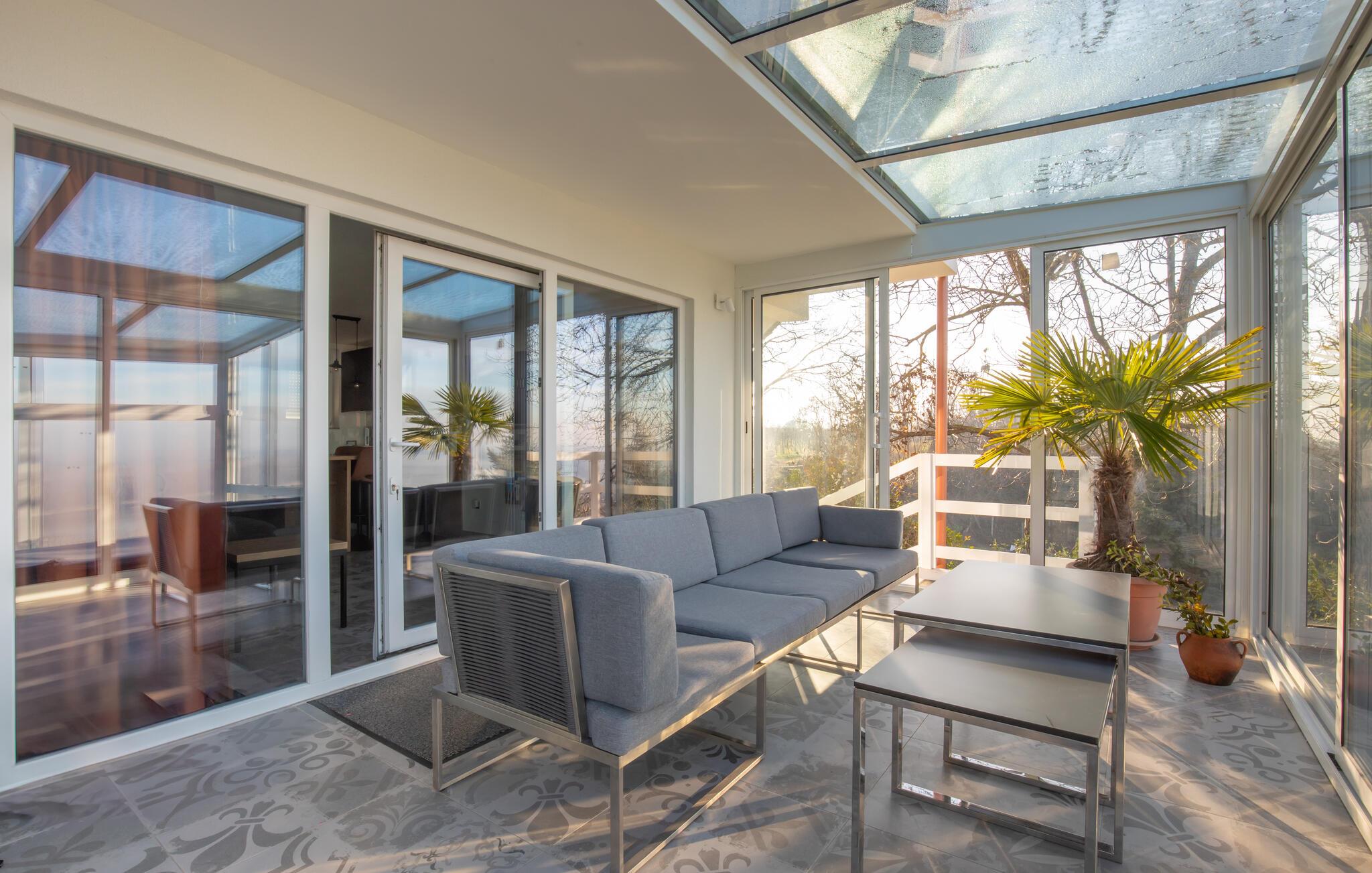 Beliggende i det idylliske landskab nær Aljmaš tilbyder dette hus et unikt tilflugtssted for friluftsmennesker, der ikke vil gå glip af moderne bekvemmeligheder og en hyggelig atmosfære. Slap af på den rummelige sofa med en filmaften, spil et brætspil eller forkæl jer selv med behagelige stunder i saunaen. Den glaserede vinterhave tilbyder jer et behageligt tilflugtssted med en smuk udsigt over landskabet.