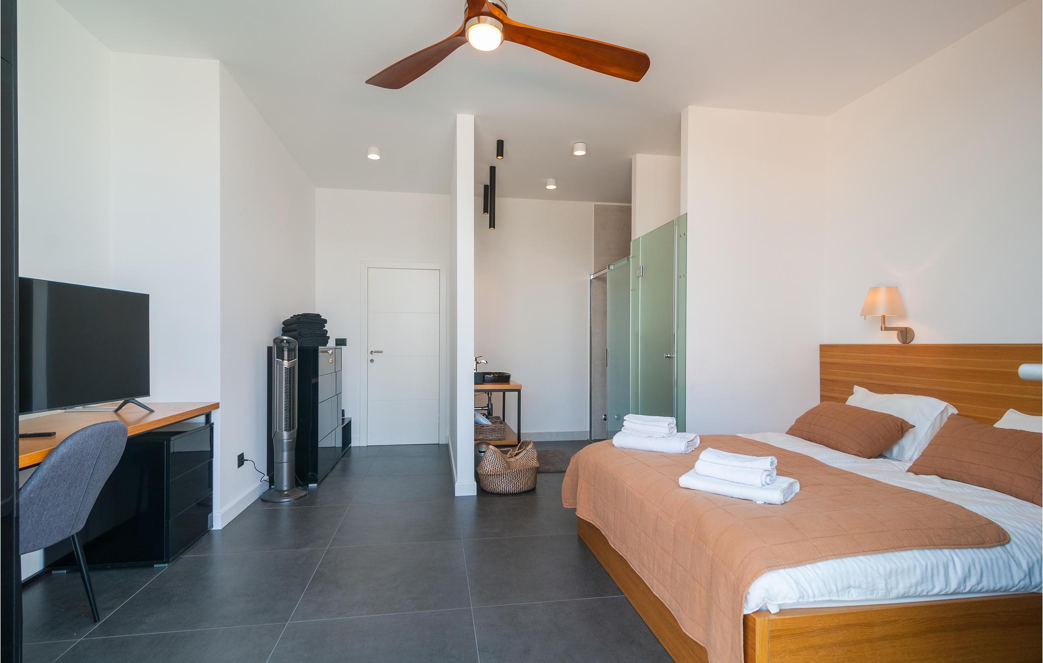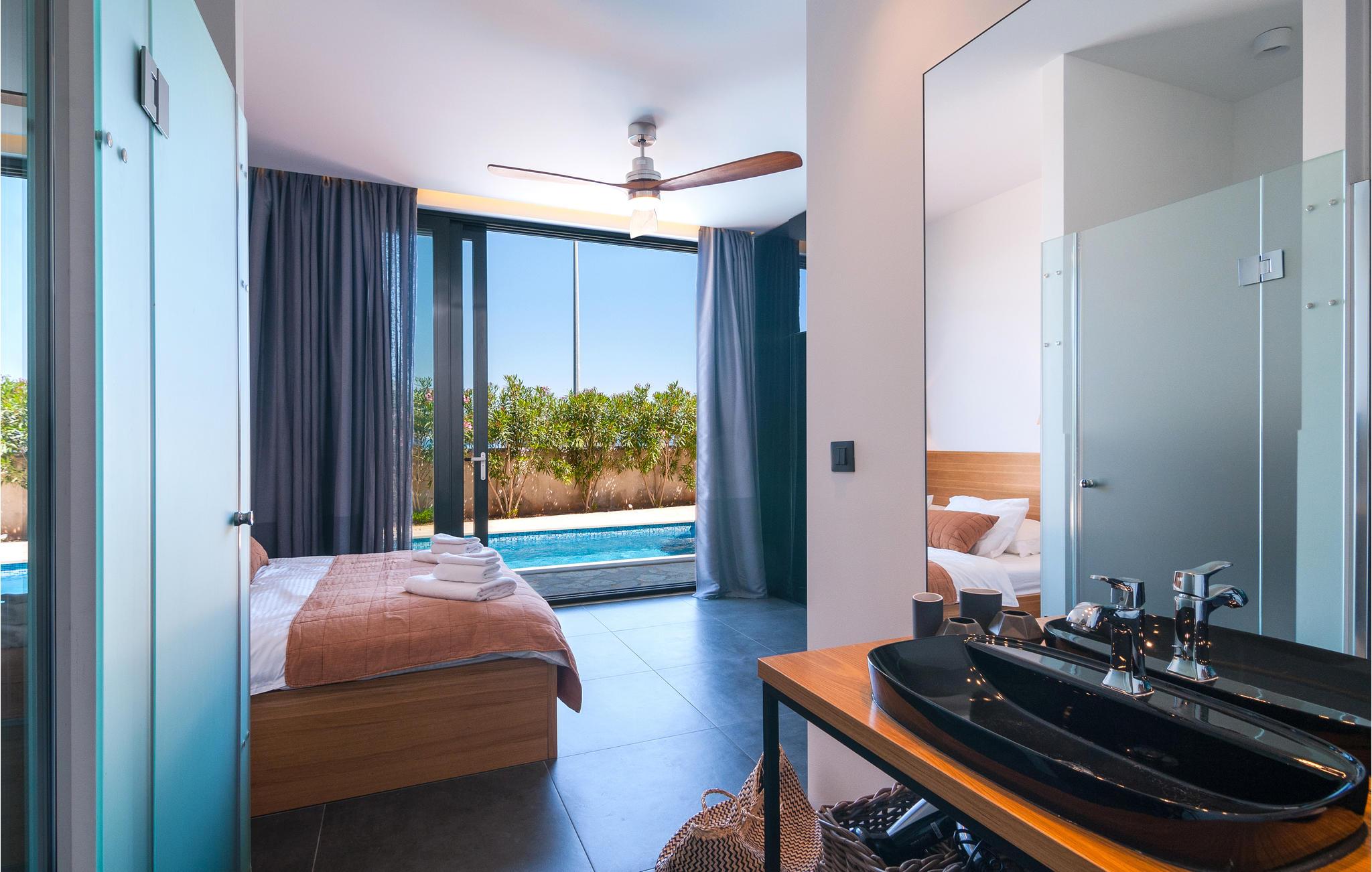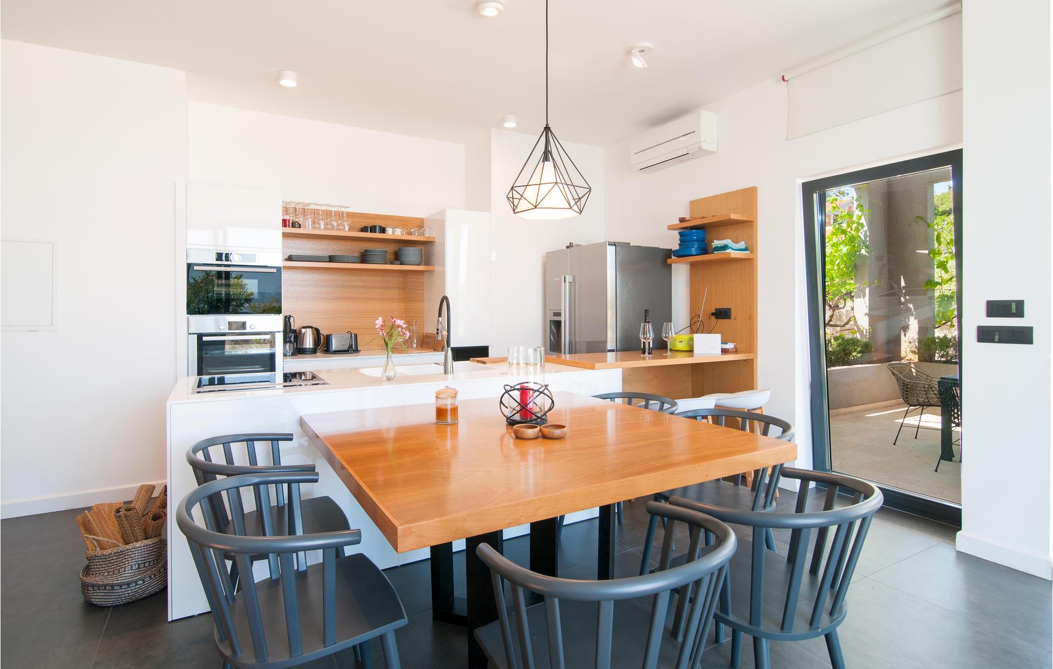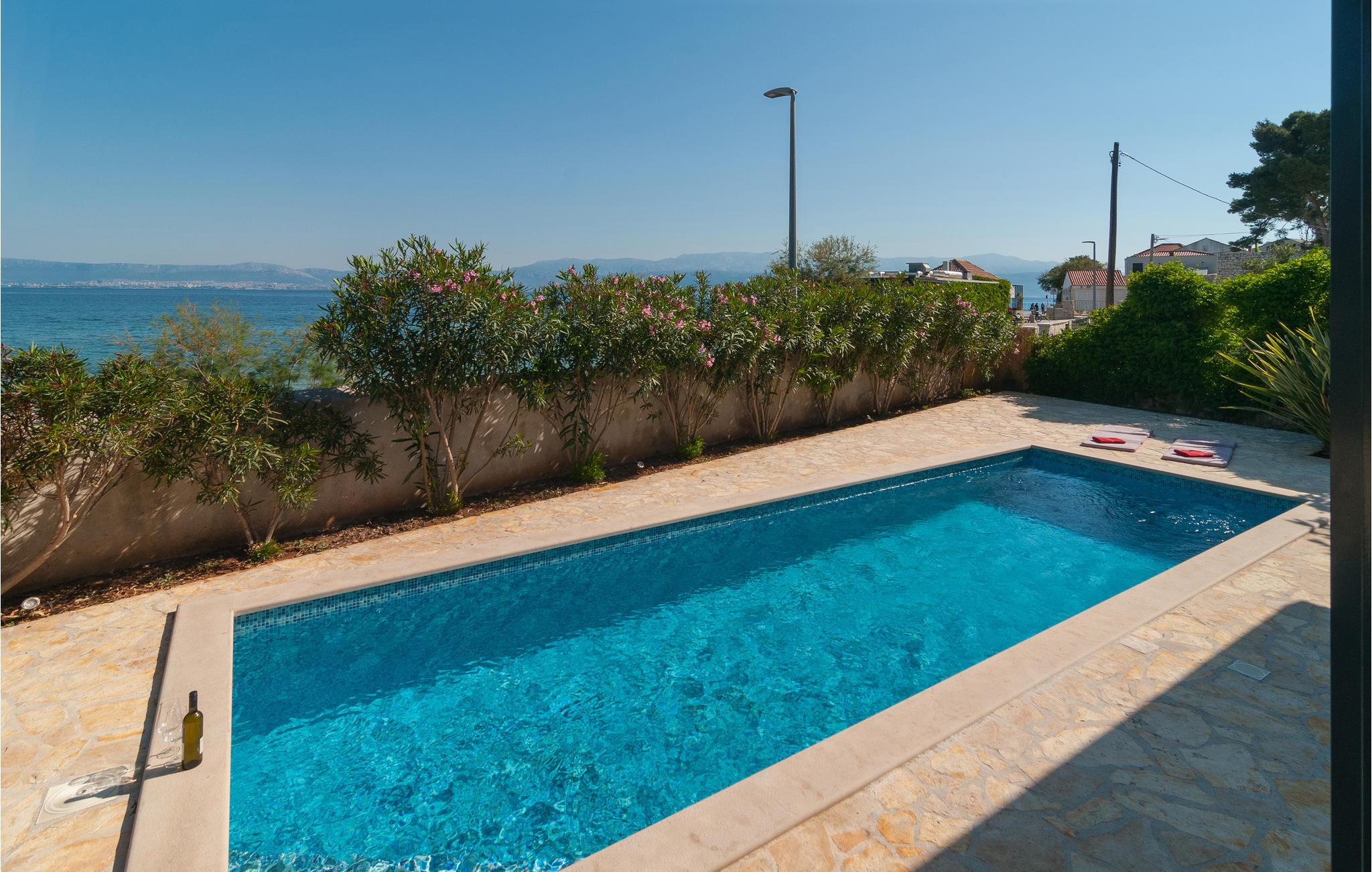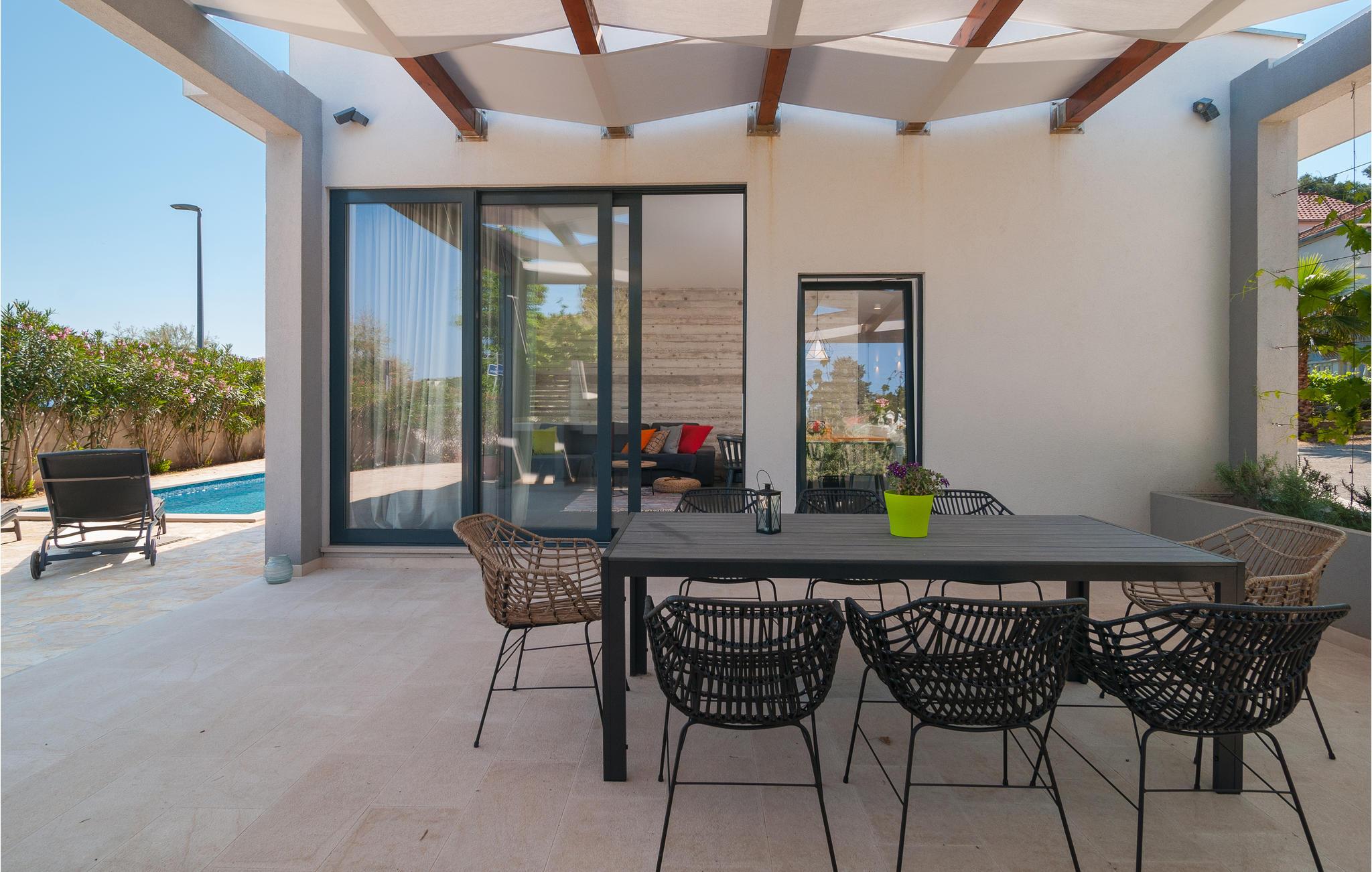 Denne feriebolig tilbyder jer alt, hvad en feriegæsts hjerte begærer: komplet og komfortabel indretning, en privat pool lige foran huset og en viInderlig udsigt over havet. Her kan man hygge sig rigtig godt og endelig slappe af og glemme hverdagen. Udnyt den skønne veranda med indbygget stengrill, hvor I kan sidde sammen med jeres kære om aftenen og nyde en lækker grill. Solbad på liggestolene og hop i det forfriskende vand for at køle af.