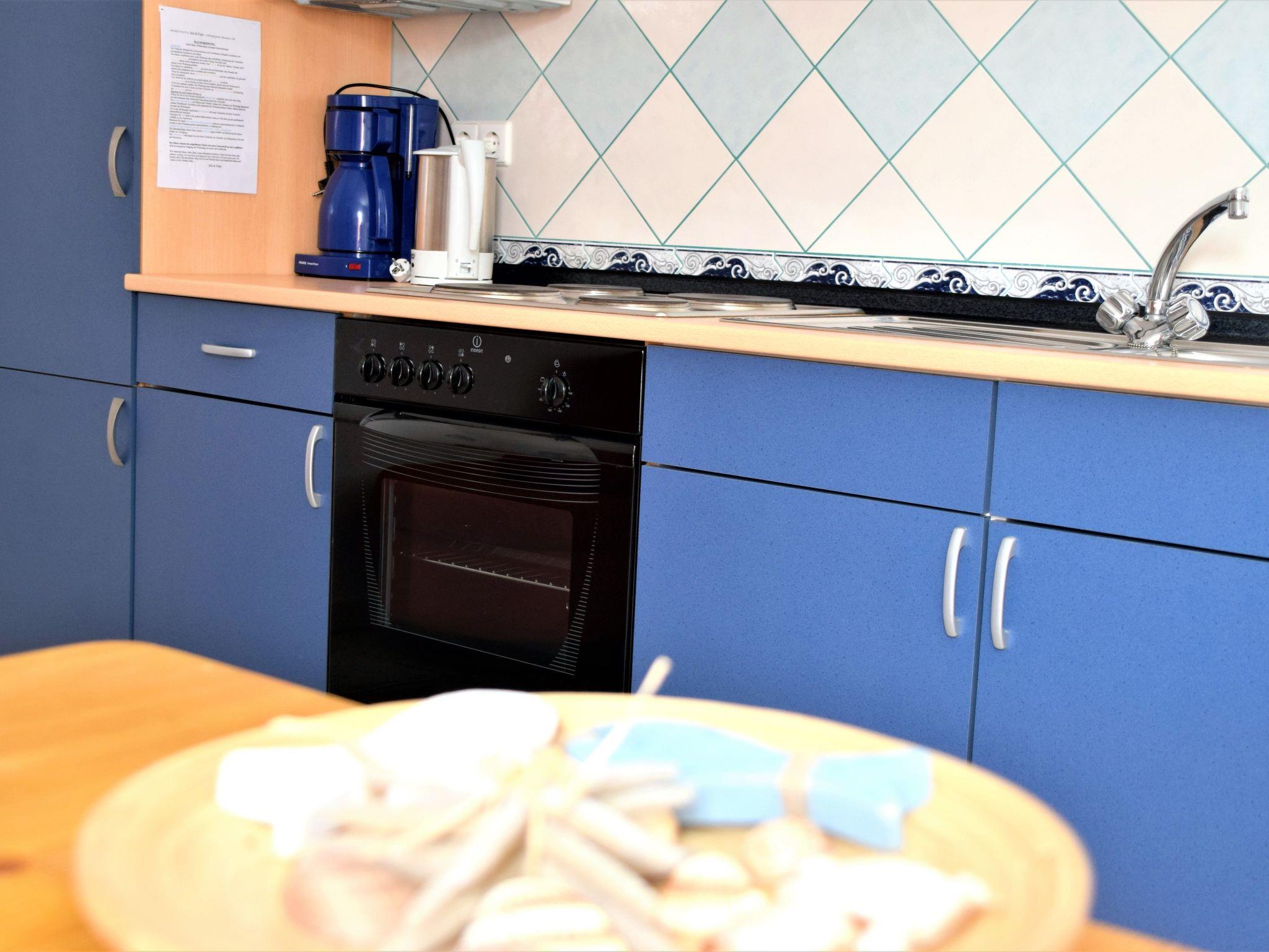 The 50m² holiday apartment is on the first floor. Two separate bedrooms provide all guests with plenty of space to retreat. The first is furnished with a kingsize bed (160 x 200cm), the second with two single beds. The hallway leads to the light living and dining room with a open-plan kitchen for self-catering, equipped with all the essential kitchen utensils, along with a coffee machine, dishwasher, microwave, oven, fridge, freezer, ceramic hob and toaster. A dining table, a sofa and satellite/cable TV, as well as a radio invite you to relax and enjoy sociable togetherness. The sofa can also be used as a bed (140 x 200cm) for one person. All the windows are fitted with fly screens. A modern shower room with a WC and hairdryer rounds off the accommodation.