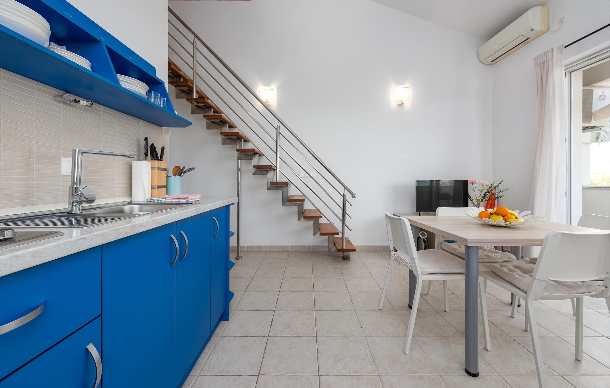 Denne lyse lejlighed i loftstil byder jer velkommen med en frisk atmosfære, der vil bringe jer i feriestemning fra det øjeblik, I ankommer. Forkæl jer selv med lækre retter i det åbne køkken, og planlæg jeres aktiviteter i den luftige stue, mens en behagelig brise strømmer gennem værelserne.
