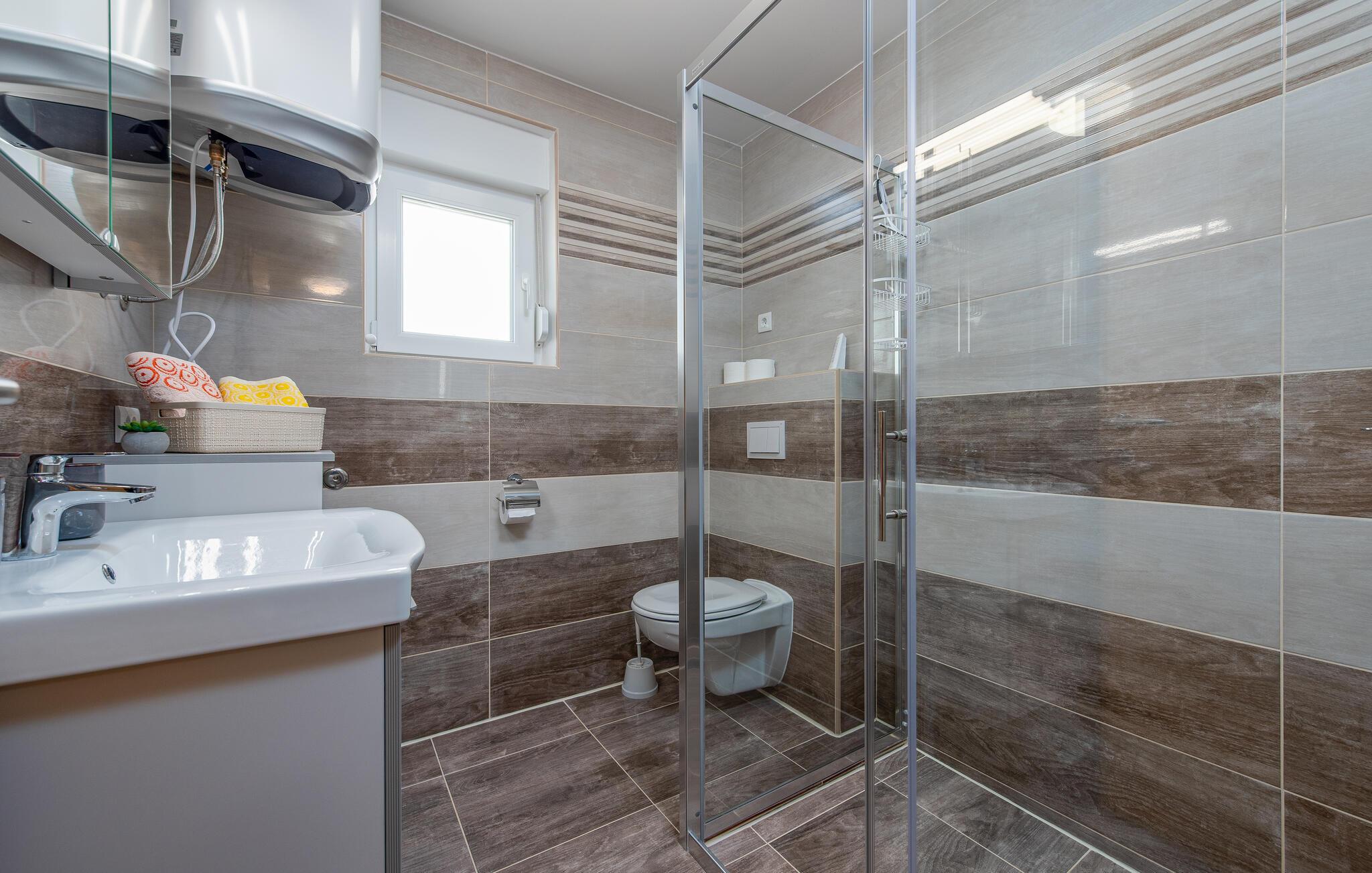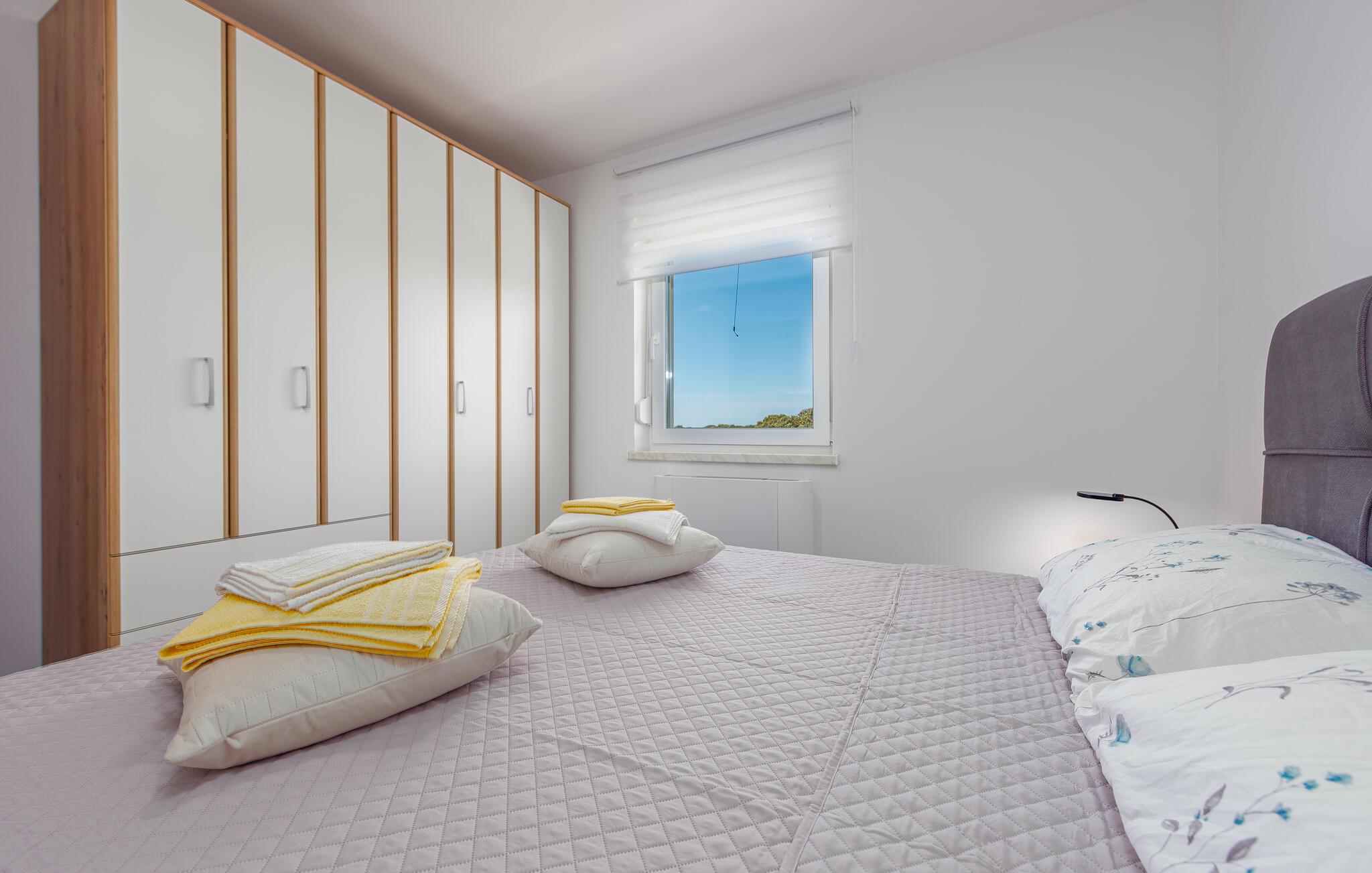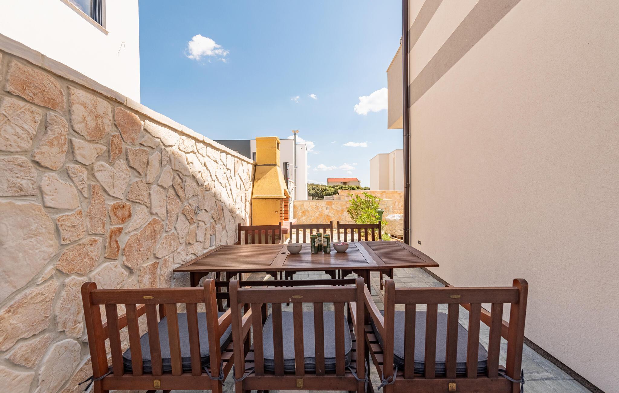 Velkommen til denne indbydende lejlighed, der ligger på øen Pag og danner rammen om en herlig ferie med familien. Lejligheden er nydeligt indrettet over to etager med komfortable møbler og alle de faciliteter, I behøver for at kunne lade skuldrene falde og slappe af med det samme, I ankommer. Efter dagens muntre leg kan I tilberede en lækker aftensmad i det veludstyrede køkken og nyde måltiderne ved spisebordet eller på altanen, hvor I kan spejde helt ud til havet.