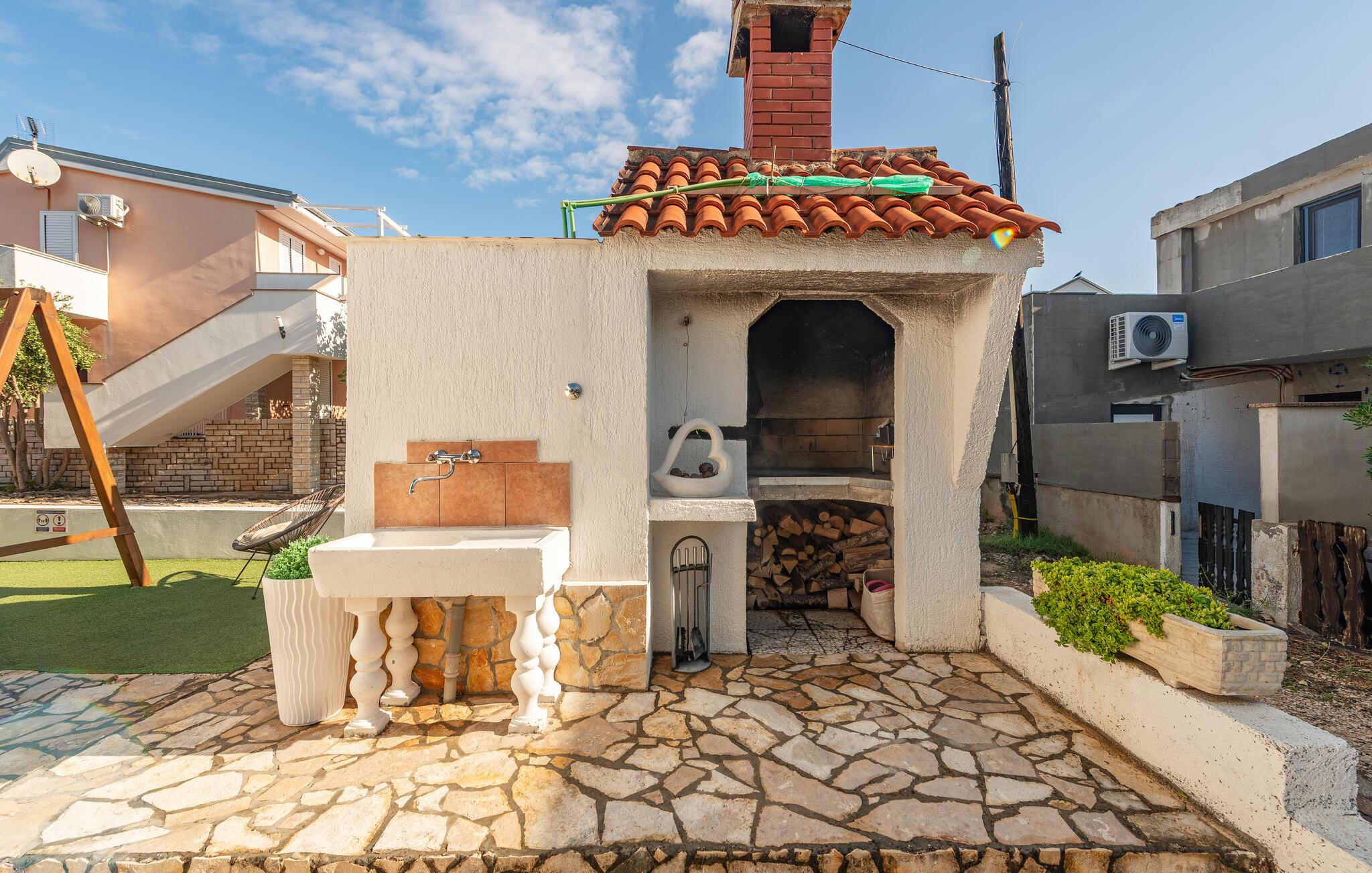 I den attraktive have kan I slappe af på liggestolene, mens børnene nyder legefaciliteterne. Udendørsbruseren og grillområdet sørger for perfekte sommerdage. Kun få skridt væk ligger den smukke stenstrand – ideel til afslappede dage ved vandet.
