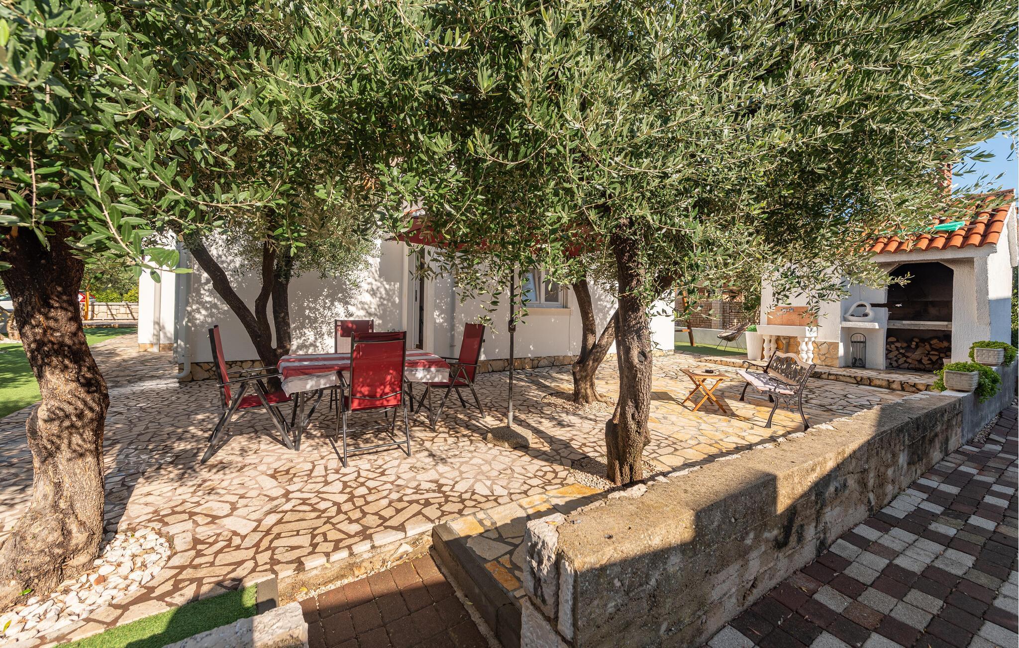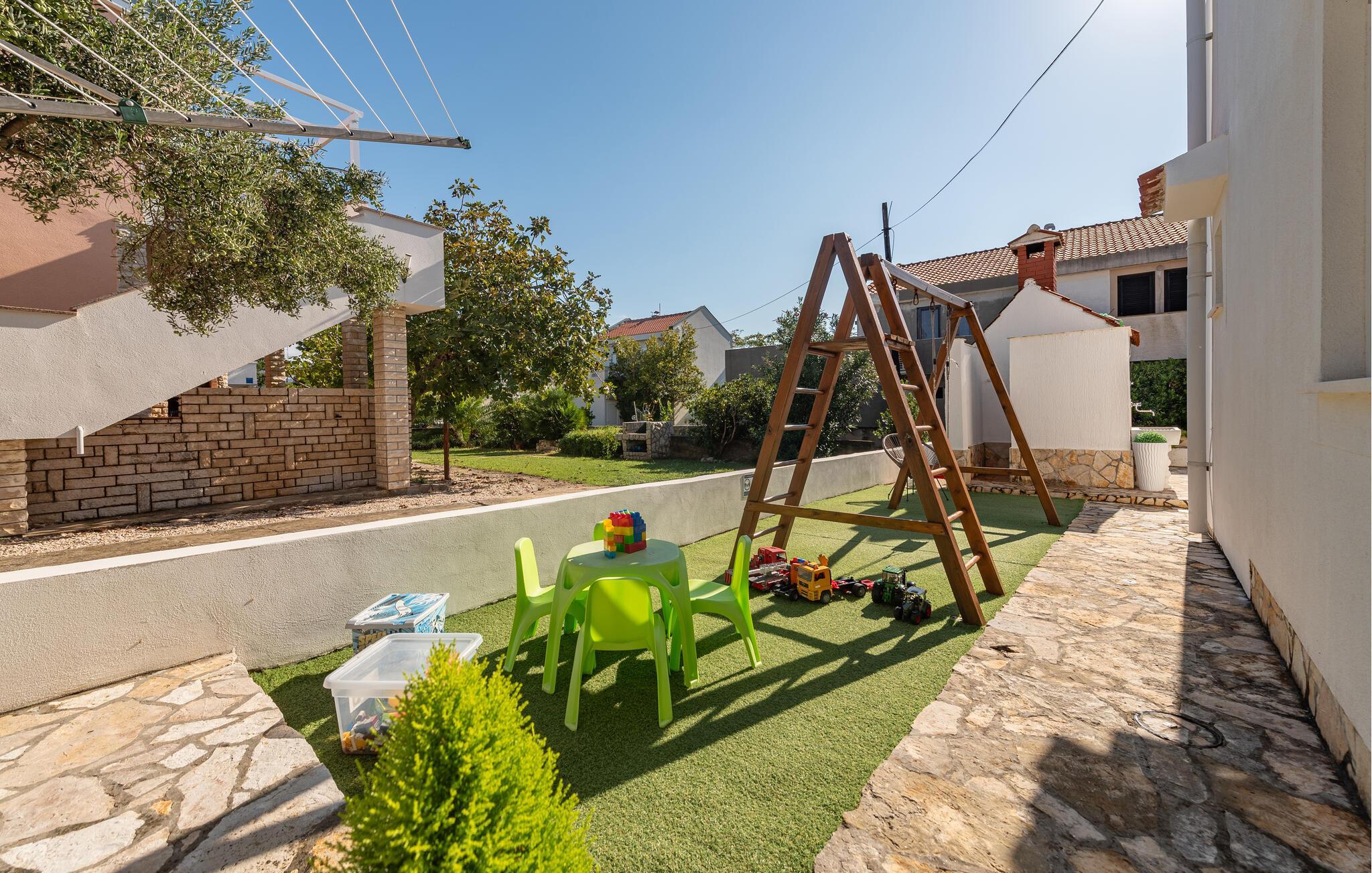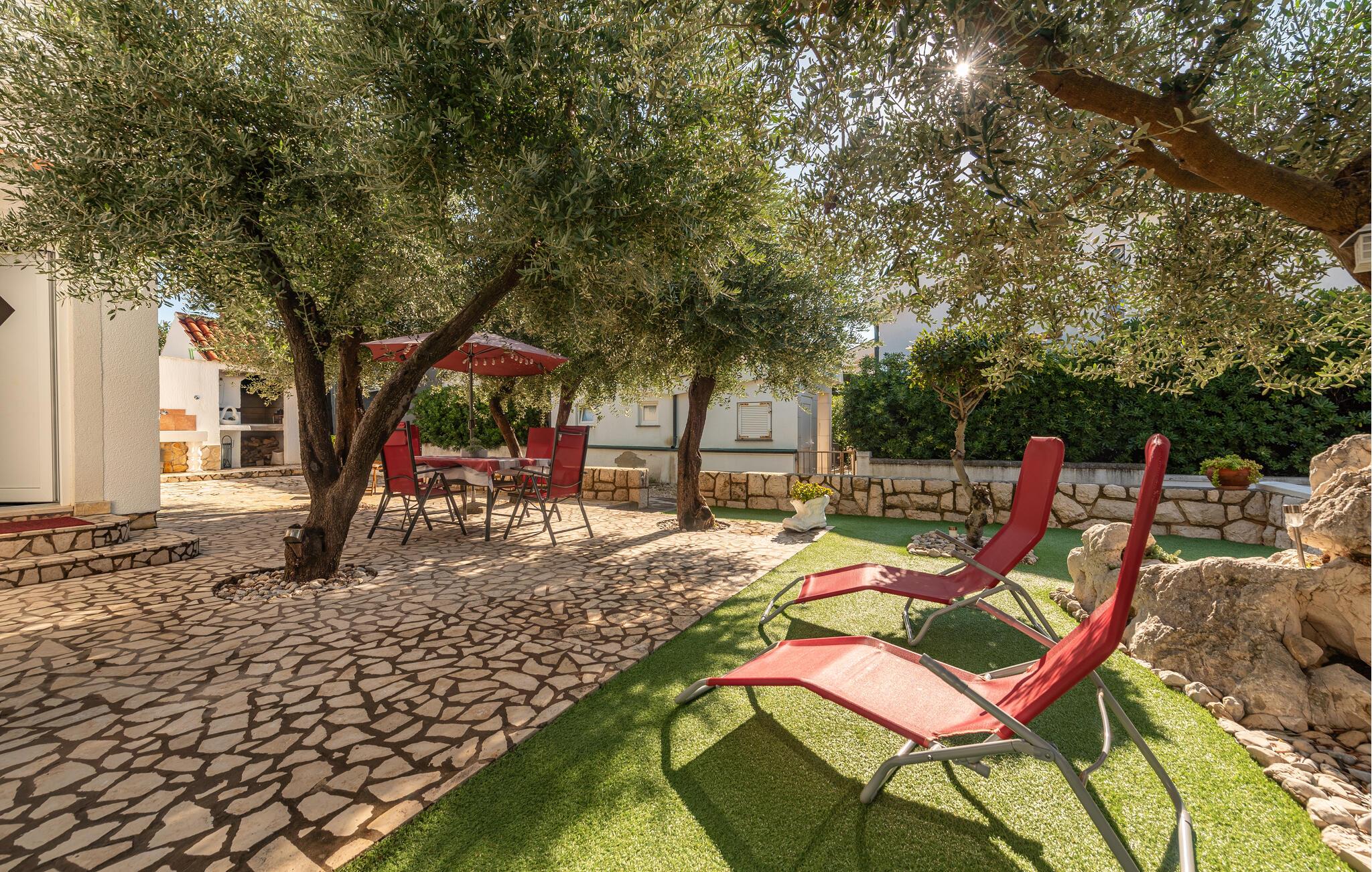 I den attraktive have kan I slappe af på liggestole, mens børnene nyder legefaciliteterne. Udendørsbruseren og grillområdet sikrer perfekte sommerdage. Kun få skridt væk ligger den dejlige stenstrand – ideel til rolige dage ved vandet.